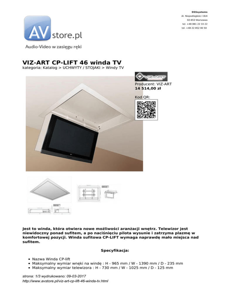 DSSsystems Al. Niepodległości 19/4 02-653 Warszawa tel. +48 881 22 33 22 tel. +48 22 852 00 50 VIZ-ART CP-LIFT 46 winda TV kategoria: Katalog > UCHWYTY / STOJAKI > Windy TV Producent: VIZ-ART 14 514,00 zł Kod QR: Jest to winda, która otwiera nowe możliwości aranżacji wnętrz. Telewizor jest niewidoczny ponad sufitem, a po naciśnięciu pilota wysunie i zatrzyma plazmę w komfortowej pozycji. Winda sufitowa CP-LIFT wymaga naprawdę mało miejsca nad sufitem. Specyfikacja: Nazwa Winda CP-lift Maksymalny wymiar wnęki na windę : H - 965 mm / W - 1390 mm / D - 235 mm Maksymalny wymiar telewizora : H - 730 mm / W - 1025 mm / D - 125 mm strona: 1/3 wydrukowano: 09-03-2017 http://www.avstore.pl/viz-art-cp-lift-46-winda-tv.html Zgodność ze standardem VESA : 75 / 100 / 100 x 200 / 200 x 200 / 200 x 400 Udźwig : do 60 kg Waga : 37 kg Napęd : Somfy Zasilanie : 230 V / 50 Hz Pobór prądu : 180 W Sterowanie : RS-232 / wyłącznik klawiszowy / TRIGGER 12 V / podczerwień / radiowo Zabezpieczenia : przeciążeniowe / termiczne Cicha praca : 42 dB W zestawie : kompletna winda / wyłącznik klawiszowy / zestaw montażowy / instrukcja montażu Gwarancja : 5 lat Produkcja : VIZ-ART Polska POBIERANIE: Karta Katalogowa - Pobierz Instrukcja instalacji - Pobierz Winda CP-LIFT firmy VIZ-ART jest to winda, która wysunie Twój telewizor prosto z sufitu. Korzystaj z nowoczesnych rozwiązań i automatyki, które mają służyć Tobie. Winda sufitowa CP-LIFT wysunie plazmę z sufitu po naciśnięciu guzika pilota. Wszystko aby czuć się wyjątkowo. Niech Twoja sypialnia czy salon kąpielowy ma dodatkową magię. Wyjątkowe rozwiązania dla Was. Jest to winda, która otwiera nowe możliwości aranżacji wnętrz. Telewizor jest niewidoczny ponad sufitem, a po naciśnięciu pilota wysunie i zatrzyma plazmę w komfortowej pozycji. Winda sufitowa CP-LIFT wymaga naprawdę mało miejsca nad sufitem. Winda CP-LIFT zajmuje mało miejsca nad sufitem, umożliwia montaż TV do szerokości 120,5 cm TV - 46 ". Instalacja windy i plazmy jest wyjątkowo łatwa. Proste podłączenie i programowanie gwarantuje wyjątkowy efekt. Zastosowanie : sypialnie / apartamenty SPA / ekskluzywne apartamenty / salony kąpielowe / puby i niskie wnętrza Winda -Lift 46 skonstruowana i zbudowana aby telewizor plazmowy zainstalowany poziomo ponad sufitem odchylany był na czas oglądania filmu. Winda sufitowa do plazm i LCD otwiera nowe możliwości kreowania oryginalnych aranżacji wnętrz, gdzie telewizor jest w niewidoczny strona: 2/3 wydrukowano: 09-03-2017 http://www.avstore.pl/viz-art-cp-lift-46-winda-tv.html sposób ukryty ponad sufitem, a po naciśnięciu pilota wysunie się i zatrzyma w komfortowym ustawieniu. Winda sufitowa do plazm - Ceiling Plasma Lift – CP-Lift 46 zajmuje wymaga naprawdę mało miejsca, a umożliwia montaż TV o szerokości do 120,5 cm odpowiada to modelom plazm o przekątnej do 46”. Winda sufitowa do TV plazmowych i LCD została zaprojektowana w VIZ-ART z myślą o wymagających i niebanalnych realizacjach, a dodatkowym zadaniem dla Zespołu Projektów był prosty montaż, małe wymiary oraz estetyka i komfort dla Użytkownika. Prosty montaż windy i telewizora plazmowego zostały połączone z dokładnością kalibracji zatrzymania TV plazmowego wysuniętego na czas użytkowania jak i dokładnego zamknięcia po schowaniu ponad sufit. Winda CP- Lift została zaprojektowana i wykonywana jest przez VIZ-ART. Winda CP- Lift do instalacji telewizorów plazmowych ponad sufitem idealna jest zarówno do wnętrzach z minimalistycznym wystrojem jak i zabytkowych wnętrz. Zwykle w takich wnętrzach projektanci szukają innych rozwiązań niżeli montaż urządzeń Audio Video w widocznych miejscach. Winda sufitowa CP- Lift jest doskonała propozycją do konfiguracji w systemach EIB,tak aby komfortowo sterować urządzeniami w ekskluzywnym domu z centralnego panela sterującego. Szeroki zakres odchylania plazmy – do 115° pozwala na instalację plazm także w sufitach skośnych, a wnętrza poddaszy często przeznaczone są właśnie na sypialnię czy Kino Domowe. Pomieszczenia z poddaszami o pochyleniu do 25° w niewidoczny sposób ukryją nawet duży telewizor ponad sufitem, który po naciśnięciu guzika na pilocie zostanie wysunięty sponad sufitu czy specjalnej zabudowy. Innym pomysłem na oryginalną aranżację z windą CP- Lift 46 jest instalacja telewizorów plazmowych w powierzchni stołu, blacie mebla czy zaprojektowanej zabudowie poziomej. Każde oryginalne a zarazem funkcjonalne wnętrze cieszy użytkowników, ponieważ pokazuje choćby ich otwartość na niepowtarzalne i odważne aranżacje. Wszystkie podane ceny (zawierają podatek VAT 23%). Klientów zainteresowanych większymi zakupami lub współpracą prosimy o kontakt: (22) 852 00 50, lub [email protected] Wszystkie loga oraz znaki firmowe wykorzystane w opisach na stronie AVstore.pl . należą do ich prawnych właścicieli i mają wyłącznie charakter informacyjny strona: 3/3 wydrukowano: 09-03-2017 http://www.avstore.pl/viz-art-cp-lift-46-winda-tv.html