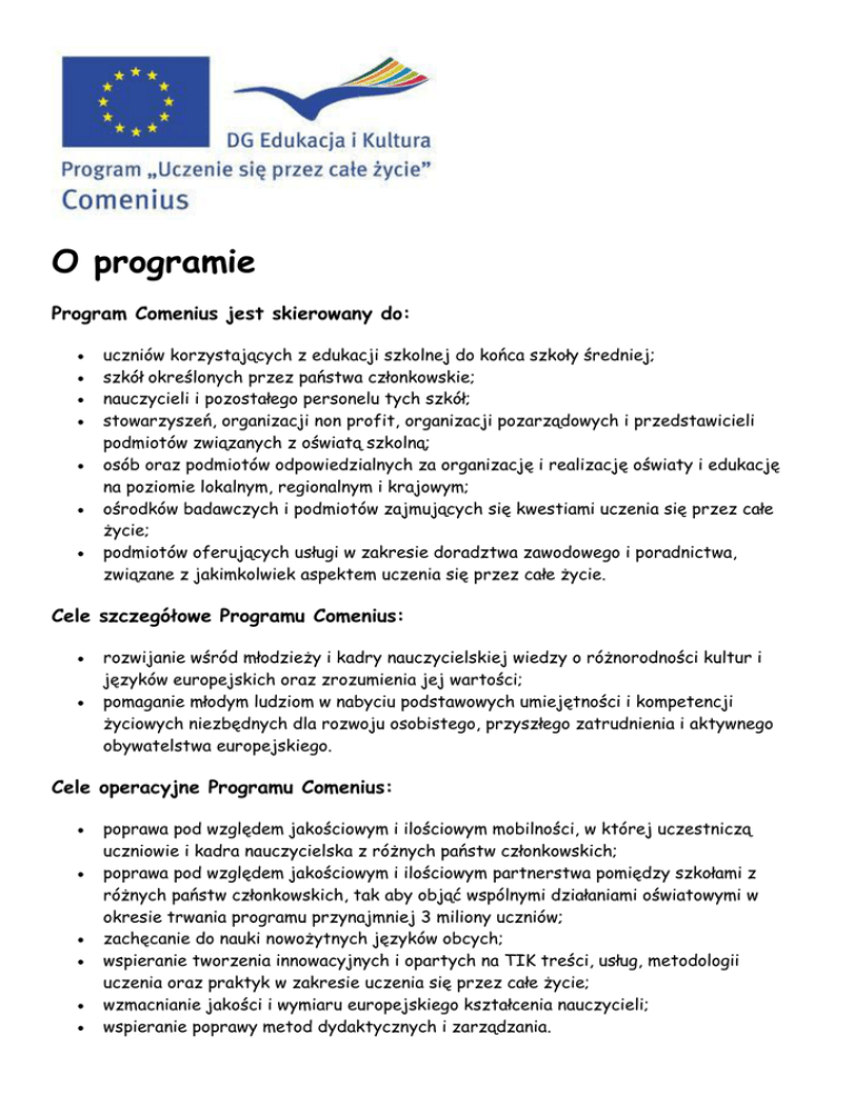 O programie Program Comenius jest skierowany do: uczniów korzystających z edukacji szkolnej do końca szkoły średniej; szkół określonych przez państwa członkowskie; nauczycieli i pozostałego personelu tych szkół; stowarzyszeń, organizacji non profit, organizacji pozarządowych i przedstawicieli podmiotów związanych z oświatą szkolną; osób oraz podmiotów odpowiedzialnych za organizację i realizację oświaty i edukację na poziomie lokalnym, regionalnym i krajowym; ośrodków badawczych i podmiotów zajmujących się kwestiami uczenia się przez całe życie; podmiotów oferujących usługi w zakresie doradztwa zawodowego i poradnictwa, związane z jakimkolwiek aspektem uczenia się przez całe życie. Cele szczegółowe Programu Comenius: rozwijanie wśród młodzieży i kadry nauczycielskiej wiedzy o różnorodności kultur i języków europejskich oraz zrozumienia jej wartości; pomaganie młodym ludziom w nabyciu podstawowych umiejętności i kompetencji życiowych niezbędnych dla rozwoju osobistego, przyszłego zatrudnienia i aktywnego obywatelstwa europejskiego. Cele operacyjne Programu Comenius: poprawa pod względem jakościowym i ilościowym mobilności, w której uczestniczą uczniowie i kadra nauczycielska z różnych państw członkowskich; poprawa pod względem jakościowym i ilościowym partnerstwa pomiędzy szkołami z różnych państw członkowskich, tak aby objąć wspólnymi działaniami oświatowymi w okresie trwania programu przynajmniej 3 miliony uczniów; zachęcanie do nauki nowożytnych języków obcych; wspieranie tworzenia innowacyjnych i opartych na TIK treści, usług, metodologii uczenia oraz praktyk w zakresie uczenia się przez całe życie; wzmacnianie jakości i wymiaru europejskiego kształcenia nauczycieli; wspieranie poprawy metod dydaktycznych i zarządzania. Działania wspierane w ramach Programu Comenius: a. Mobilność obejmująca: wymianę uczniów i kadry; mobilność w szkołach dla uczniów oraz staże w szkołach lub przedsiębiorstwach dla kadry nauczycielskiej; uczestnictwo w szkoleniach dla nauczycieli i pozostałej kadry nauczycielskiej; wizyty studyjne i przygotowawcze w ramach działań związanych z mobilnością, partnerstwem, projektami lub sieciami (również seminaria kontaktowe); praktyki dla nauczycieli i przyszłych nauczycieli; b. Tworzenie partnerstwa: pomiędzy szkołami w celu rozwijania wspólnych projektów oświatowych dla uczniów i ich nauczycieli; pomiędzy instytucjami pełniącymi rolę lokalnej lub regionalnej władzy oświatowej w celu wzmacniania europejskiego wymiaru w edukacji, realizacji celów programu Comenius, rozwijania struktur współpracy międzynarodowej, w tym przygranicznej a w konsekwencji wzbogacenia oferty edukacyjnej dla uczniów (Comenius Regio od 2009 roku). c. Projekty wielostronne d. Wielostronne sieci e. Inne inicjatywy ukierunkowane na wspieranie celów Programu Comenius. Kraje uczestniczące: 27 krajów członkowskich Unii Europejskiej: Austria, Belgia, Bułgaria, Czechy, Cypr, Dania, Estonia, Finlandia, Francja, Grecja, Hiszpania, Holandia, Irlandia, Litwa, Luksemburg, Łotwa, Malta, Niemcy, Polska, Portugalia, Rumunia, Słowacja, Słowenia, Szwecja, Węgry, Włochy, Wielka Brytania kraje EFTA/EOG: Islandia, Liechtenstein, Norwegia kraj kandydujący do członkostwa w Unii Europejskiej: Chorwacja, Turcja oraz Szwajcaria.
