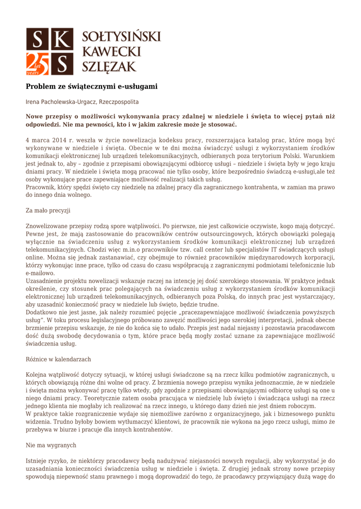 Problem ze świątecznymi e-usługami Irena Pacholewska-Urgacz, Rzeczpospolita Nowe przepisy o możliwości wykonywania pracy zdalnej w niedziele i święta to więcej pytań niż odpowiedzi. Nie ma pewności, kto i w jakim zakresie może je stosować. 4 marca 2014 r. weszła w życie nowelizacja kodeksu pracy, rozszerzająca katalog prac, które mogą być wykonywane w niedziele i święta. Obecnie w te dni można świadczyć usługi z wykorzystaniem środków komunikacji elektronicznej lub urządzeń telekomunikacyjnych, odbieranych poza terytorium Polski. Warunkiem jest jednak to, aby – zgodnie z przepisami obowiązującymi odbiorcę usługi – niedziele i święta były w jego kraju dniami pracy. W niedziele i święta mogą pracować nie tylko osoby, które bezpośrednio świadczą e-usługi,ale też osoby wykonujące prace zapewniające możliwość realizacji takich usług. Pracownik, który spędzi święto czy niedzielę na zdalnej pracy dla zagranicznego kontrahenta, w zamian ma prawo do innego dnia wolnego. Za mało precyzji Znowelizowane przepisy rodzą spore wątpliwości. Po pierwsze, nie jest całkowicie oczywiste, kogo mają dotyczyć. Pewne jest, że mają zastosowanie do pracowników centrów outsourcingowych, których obowiązki polegają wyłącznie na świadczeniu usług z wykorzystaniem środków komunikacji elektronicznej lub urządzeń telekomunikacyjnych. Chodzi więc m.in.o pracowników tzw. call center lub specjalistów IT świadczących usługi online. Można się jednak zastanawiać, czy obejmuje to również pracowników międzynarodowych korporacji, którzy wykonując inne prace, tylko od czasu do czasu współpracują z zagranicznymi podmiotami telefonicznie lub e-mailowo. Uzasadnienie projektu nowelizacji wskazuje raczej na intencję jej dość szerokiego stosowania. W praktyce jednak określenie, czy stosunek prac polegających na świadczeniu usług z wykorzystaniem środków komunikacji elektronicznej lub urządzeń telekomunikacyjnych, odbieranych poza Polską, do innych prac jest wystarczający, aby uzasadnić konieczność pracy w niedziele lub święto, będzie trudne. Dodatkowo nie jest jasne, jak należy rozumieć pojęcie „pracezapewniające możliwość świadczenia powyższych usług”. W toku procesu legislacyjnego próbowano zawęzić możliwości jego szerokiej interpretacji, jednak obecne brzmienie przepisu wskazuje, że nie do końca się to udało. Przepis jest nadal niejasny i pozostawia pracodawcom dość dużą swobodę decydowania o tym, które prace będą mogły zostać uznane za zapewniające możliwość świadczenia usług. Różnice w kalendarzach Kolejna wątpliwość dotyczy sytuacji, w której usługi świadczone są na rzecz kilku podmiotów zagranicznych, u których obowiązują różne dni wolne od pracy. Z brzmienia nowego przepisu wynika jednoznacznie, że w niedziele i święta można wykonywać pracę tylko wtedy, gdy zgodnie z przepisami obowiązującymi odbiorcę usługi są one u niego dniami pracy. Teoretycznie zatem osoba pracująca w niedzielę lub święto i świadcząca usługi na rzecz jednego klienta nie mogłaby ich realizować na rzecz innego, u którego dany dzień nie jest dniem roboczym. W praktyce takie rozgraniczenie wydaje się niemożliwe zarówno z organizacyjnego, jak i biznesowego punktu widzenia. Trudno byłoby bowiem wytłumaczyć klientowi, że pracownik nie wykona na jego rzecz usługi, mimo że przebywa w biurze i pracuje dla innych kontrahentów. Nie ma wygranych Istnieje ryzyko, że niektórzy pracodawcy będą nadużywać niejasności nowych regulacji, aby wykorzystać je do uzasadniania konieczności świadczenia usług w niedziele i święta. Z drugiej jednak strony nowe przepisy spowodują niepewność stanu prawnego i mogą doprowadzić do tego, że pracodawcy przywiązujący dużą wagę do przestrzegania prawa w ogóle nie będą korzystać z tego rozwiązania lub bardzo mocno się z tym ograniczać. Dobrze obrazuje to wady nieprecyzyjnej legislacji prawno-pracowniczej. Tracą na niej zarówno pracownicy (wobecktórych może być ona nadużywana), jak i przestrzegający prawa pracodawcy. W praktyce korzystać na niej będą przede wszystkim jednostki, dla których ryzyko naruszenia prawa nie stanowi istotnego problemu. Istnieje alternatywa Na marginesie należy wskazać, że w dotychczasowym stanie prawnym pracodawcy świadczący transgraniczne usługi w zakresie procesów biznesowych, aby zapewnić możliwość pracy w niedziele i święta, najczęściej stosowali pracę zmianową. W związku z tym powstaje pytanie, czy nowelizacja automatycznie oznacza konieczność zmiany regulaminów pracy i harmonogramów w tym zakresie. Niekoniecznie. Po pierwsze, można się spodziewać, że z uwagi na brak precyzji nowych przepisów pracodawcy utrzymają dotychczasową praktykę, a pracę zmianową będą stosować jako dodatkowe uzasadnienie pracy w niedziele i święta. Ponadto usługi objęte nowelizacją są często świadczone na rzecz klientów, którzy oczekują obsługi przez 12 godzin w ciągu dnia lub wręcz przez całą dobę. W takich przypadkach stosowanie pracy zmianowej będzie nadal uzasadnione, a co za tym idzie – zmiana regulaminów pracy będzie zbędna.