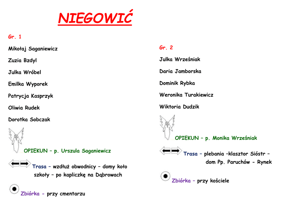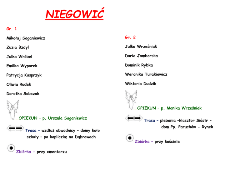 NIEGOWIĆ Gr. 1 Mikołaj Saganiewicz Gr. 2 Zuzia Bzdyl Julka Wrześniak Julka Wróbel Daria Jamborska Emilka Wyporek Dominik Rybka Patrycja Kasprzyk Weronika Turakiewicz Oliwia Rudek Wiktoria Dudzik Dorotka Sobczak OPIEKUN – p. Monika Wrześniak OPIEKUN – p. Urszula Saganiewicz Trasa – wzdłuż obwodnicy – domy koło szkoły – po kapliczkę na Dąbrowach Zbiórka - przy cmentarzu Trasa – plebania –klasztor Sióstr – dom Pp. Paruchów - Rynek Zbiórka – przy kościele NIEGOWIĆ Gr. 3 Gr. 4 Piotr Kudłacz Patrycja Kulma Madzia Mrożek Szymek Kulma Ola Świątkowska Ania Wyporek Klaudia Tabor Zosia Francuz Natalka Pieprzyk Wiktoria Rzepka OPIEKUN – p. Łukasz Jedynak Trasa – Dąbrowy - Wachlówka OPIEKUN – p. Kinga Oberwan Trasa – od stawu po obydwu stronach – ośrodek zdrowia – domy za ulicą Zbiórka – kapliczka k. przedszkola w Dąbrowach Zbiórka – figura św. Ojca Pio CICHAWA Gr. 2 Gr. 1 Ola Widor Wiktoria Kudłacz Wiktoria Flak Julka Więcław Jowitka Flak Mateusz Serafin Oliwia Chyrc Maxiu Seweryn Małgosia Gajec Iza Zawadzka Kaja Ruman Kacper Lisowski Emilka Rzepka Krystian Sokołowski Paulinka Samek Oskar Urban OPIEKUN – p. Maria Kudłacz Trasa – stara szkoła - Książnice OPIEKUN – p. Anna Nowak Trasa – od starej szkoły do stawu Zbiórka - obok domu p. Marii Kudłacz Zbiórka – obok domu p. Marii Kudłacz CICHAWA Gr. 3 Kornelia Bułat Kamilka Kowalska Patrycja Pustuła Kacper Lech Kuba Zieleń OPIEKUN – p. Magdalena Bułat Trasa – Zygmuntów Zbiórka – obok domu p. W. Wójtowicza LIPLAS Gr. 1 Gr. 2 Ewa Białota Anitka Kolarska Wojtuś Białota Justynka Pazdan Patrycja Kowalska Kacper Figiel Marcin Gubała Patrycja Cielecka Madzia Cielecka Basia Cielecka OPIEKUN – p. Bożena Kowalska Trasa – bloki – boisko sportowe Zbiórka – bloki za aleją brzozową OPIEKUN – p. Małgorzata Feliks Trasa – sklep – kopiec - Podlas Zbiórka – sklep (stara szkoła - strażnica) LIPLAS Gr. 3 Juleczka Mardosz Kuba Giza Natalka Gajewska Kacper Bednarz Kacper Lupa Kamil Cąber OPIEKUN – s. Anna Maria Trasa – staw – boisko sportowe - bloki Zbiórka - przy stawie KRAKUSZOWICE Gr.1 Dawid Urban Gr. 2 Jasiu Wyporek Ewelina Michorczyk Filip Sumara Krystian Tabor Dominika Mateusz Turakiewicz Amelia Chanek Karolina Górka Ola Kucharz Gabrysia Górka Łukasz Burnos Maciek Gubała OPIEKUN – p. Włodzimierz Wójtowicz Trasa – Rakówki – Prokocim - Nawsie Zbiórka – Rakówki OPIEKUN – p. Anna Saganiewicz Trasa – Dębina – Libet - Wieś Zbiórka – kapliczka na Dębinie