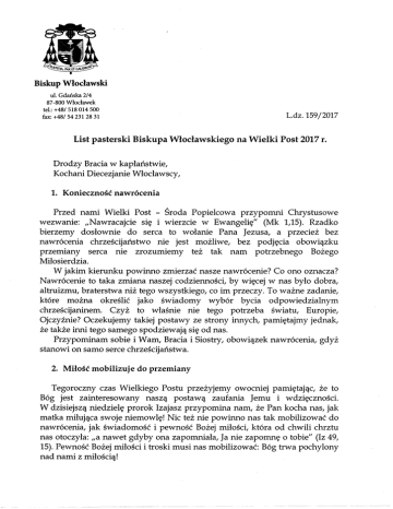 Biskup Włocławski ul. Gdańska 2/4 87-800 Włocławek teł.: +48/ 518 014 500 fax:+48/54 231 28 31 L.dz. 159/2017 List pasterski Biskupa Włocławskiego na Wielki Post 2017 r. Drodzy Bracia w kapłaństwie, Kochani Diecezjanie Włocławscy, 1. Konieczność nawrócenia Przed nami Wielki Post - Środa Popielcowa przypomni Chrystusowe wezwanie: „Nawracajcie się i wierzcie w Ewangelię" (Mk 1,15). Rzadko bierzemy dosłownie do serca to wołanie Pana Jezusa, a przecież bez nawrócenia chrześcijaństwo nie jest możliwe, bez podjęcia obowiązku przemiany serca nie zrozumiemy też tak nam potrzebnego Bożego Miłosierdzia. W jakim kierunku powinno zmierzać nasze nawrócenie? Co ono oznacza? Nawrócenie to taka zmiana naszej codzienności, by więcej w nas było dobra, altruizmu, braterstwa niż tego wszystkiego, co im przeczy. To ważne zadanie, które można określić jako świadomy wybór bycia odpowiedzialnym chrześcijaninem. Czyż to właśnie nie tego potrzeba światu, Europie, Ojczyźnie? Oczekujemy takiej postawy ze strony innych, pamiętajmy jednak, że także inni tego samego spodziewają się od nas. Przypominam sobie i Wam, Bracia i Siostry, obowiązek nawrócenia, gdyż stanowi on samo serce chrześcijaństwa. 2. Miłość mobilizuje do przemiany Tegoroczny czas Wielkiego Postu przeżyjemy owocniej pamiętając, że to Bóg jest zainteresowany naszą postawą zaufania Jemu i wdzięczności. W dzisiejszą niedzielę prorok Izajasz przypomina nam, że Pan kocha nas, jak matka miłująca swoje niemowlę! Nic też nie powinno nas tak mobilizować do nawrócenia, jak świadomość i pewność Bożej miłości, która od chwili chrztu nas otoczyła: „a nawet gdyby ona zapomniała, Ja nie zapomnę o tobie" (Iz 49, 15). Pewność Bożej miłości i troski musi nas mobilizować: Bóg trwa pochylony nad nami z miłością! 3. Zmieniać także rzeczywistość społeczną Św. Paweł w swoim Liście do Koryntian przypomina, że sam tylko Bóg może oceniać serce człowieka i to, czym jest ono napełnione! To również ważne przypomnienie w świetle różnych podziałów i wzajemnych oskarżeń w naszej Ojczyźnie! Miejmy odwagę nie tyle oskarżać innych, co pracować nad własną wiernością Bożemu Prawu. Jakże inne byłoby życie społeczne w Polsce, gdybyśmy umieli pohamować odruchy niechęci, pogardy czy nienawiści, zastępując je próbą realizowania dobra służącego wszystkim, gdybyśmy nie piętnowali poszczególnych grup obywateli, a zechcieli włączać się w pracę mającą na celu wspólne dobro! Czyż taka zmiana, przemiana naszej doczesności nie jest jednym z zadań wynikających z zaproszenia Chrystusa do naszej codzienności, ujawnionego w Krakowie 19 listopada ubiegłego roku, kiedy dziesiątki tysięcy Polaków świadomie wybierały Chrystusa za swojego Króla i Pana?! 4. Maryja Przewodniczką Boża Matka - tak wyraźnie towarzysząca nam w tym roku - będzie przypominać, iż trzeba starać się przede wszystkim o królestwo Boga i o Jego sprawiedliwość (por Mt 6,33). Właśnie mija 100 lat od objawień fatimskich: szukamy różnych sposobów, by godnie je uczcić - poprzez List Episkopatu poświęcony tej rocznicy, Konferencję Episkopatu Polski, która odbędzie się w sanktuarium Matki Bożej na Krzeptówkach, pielgrzymkę wiernych do Fatimy, którą poprowadzi ks. bp Stanisław Gębicki, coroczną pielgrzymkę kapłanów diecezji kierujemy w tym roku do parafii Matki Bożej Fatimskiej w Turku. Wiele jeszcze innych wydarzeń, podejmowanych przez prezbiterów i wiernych Kościoła Włocławskiego nie sposób tu wymienić. Jubileusz 100lecia Objawień w Fatimie jest znakiem i zapewnieniem, że Bóg przebacza pokutującym. Nie zwlekajmy z podjęciem i realizacją wezwań Matki Pana do nawrócenie osobistego i całej Ojczyzny. Ważnym znakiem jest 300-lecie koronacji Obrazu Matki Bożej na Jasnej Górze. Nie sądzę, by trzeba było go przypominać. Biegniemy tam wiele razy w roku: z maturzystami, z pieszymi pielgrzymkami, z rodzinami i zawsze wtedy, gdy potrzebujemy powierzyć Maryi nasze sprawy, troski i biedy. Nie brak ich w Europie, Ojczyźnie, Kościele. Dlatego też nie może zabraknąć naszej obecności na Jasnej Górze, a Ikony Maryi w naszych domach, rodzinach i również w sercach! Wreszcie chcę wspomnieć trzeci jubileusz: 50-lecie koronacji Obrazu Matki Bożej Licheńskiej - tego skarbu naszej Diecezji, otoczonego czułą opieką Księży Marianów w Bazylice w Licheniu. Okoliczności objawień są dobrze znane. To one każą nam włączyć się w jubileuszowe wydarzenia, w dniach od 12 do 15 sierpnia. Szczegółowo poinformuję o nich Diecezjan w lipcu. Matka Boża zawsze kieruje nas w stronę Kościoła i Ojczyzny, w stronę naszych świadomie budowanych więzów z Panem Bogiem! 5. Wielkopostna liturgia Wreszcie przypomnijmy sobie, jak bogaty jest czas Wielkiego Postu, przez rekolekcje, spowiedź przygotowującą nas do przyjęcia Komunii wielkanocnej; przez nabożeństwa pasyjne - Drogi Krzyżowe, szczególnie te ulicami miast i wsi, czy Gorzkie Żale! Proszę Was, drodzy Siostry i Bracia, zechciejmy znaleźć czas na te wydarzenia! Pamiętajmy, że to zawsze niedzielna Msza św. jest centrum naszej pobożności, a szczytem całego roku - Tńduum Sacrum, kiedy to poprzez liturgiczne znaki, stajemy w Wieczerniku, na Golgocie i przy pustym Grobie Jezusa, ciesząc się nadzieją płynącą z Jego zmartwychwstania. Przyjmijcie, Siostry i Bracia, te słowa przypomnienia oraz zachętę do aktywnego włączenia się w święty czas przygotowania do zmartwychwstania Pana Jezusa. Moim Braciom w kapłaństwie przesyłam słowa wdzięczności za wzmożony trud organizowania duszpasterskiej posługi! Niech Wasza praca, Drodzy Księża, spotka się z takim samym uznaniem ze strony wiernych i błogosławieństwem naszego Pana. Z serca na wielkopostny trud całej Diecezji błogosławię " t r . * v V' i » . . . . i B iskup W ło c ła w sk i Lis