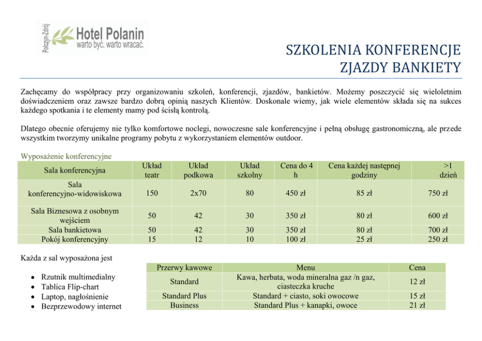 SZKOLENIA KONFERENCJE ZJAZDY BANKIETY Zachęcamy do współpracy przy organizowaniu szkoleń, konferencji, zjazdów, bankietów. Możemy poszczycić się wieloletnim doświadczeniem oraz zawsze bardzo dobrą opinią naszych Klientów. Doskonale wiemy, jak wiele elementów składa się na sukces każdego spotkania i te elementy mamy pod ścisłą kontrolą. Dlatego obecnie oferujemy nie tylko komfortowe noclegi, nowoczesne sale konferencyjne i pełną obsługę gastronomiczną, ale przede wszystkim tworzymy unikalne programy pobytu z wykorzystaniem elementów outdoor. Wyposażenie konferencyjne Sala konferencyjna Układ teatr Układ podkowa Układ szkolny Cena do 4 h Cena każdej następnej godziny Sala konferencyjno-widowiskowa 150 2x70 80 450 zł 85 zł 750 zł 50 42 30 350 zł 80 zł 600 zł 50 15 42 12 30 10 350 zł 100 zł 80 zł 25 zł 700 zł 250 zł Sala Biznesowa z osobnym wejściem Sala bankietowa Pokój konferencyjny >1 dzień Każda z sal wyposażona jest Przerwy kawowe Rzutnik multimedialny Tablica Flip-chart Laptop, nagłośnienie Bezprzewodowy internet Standard Standard Plus Business Menu Kawa, herbata, woda mineralna gaz /n gaz, ciasteczka kruche Standard + ciasto, soki owocowe Standard Plus + kanapki, owoce Cena 12 zł 15 zł 21 zł Pokoje hotelowe Zaplecze usług noclegowych to dziś pięknie urządzone pokoje 1 i 2 osobowe. Każdy wyposażony w wygodne łóżka, szafę ubraniową, biurko, stolik z krzesłami, telewizor, telefon, łazienka z toaletą, natryskiem i umywalką. Wszystkie nasze pokoje mają bezprzewodowy dostęp do Internetu. Nowoczesne wyposażenie, miła i rodzinna atmosfera, perfekcyjna obsługa to nasze podstawowe atuty. Na terenie naszego obiektu do dyspozycji naszych gości są również restauracja „Zielona Oliwka ” oraz baza zabiegowa Spa&Wellness Cena osobodnia (nocleg, śniadanie, obiad, kolacja) już od 115 zł do 170 zł Rodzaj pokoju/ usługi noclegu Cena dla grupy do 25 osób Cena dla grupy powyżej 25 osób Cena dla grup powyżej 85 osób 100 zł/os* 80 zł/os* 70 zł/os* 80 zł/os* 60 zł/os* 50 zł/os* Nocleg w pokoju 1 osobowym Nocleg w pokoju 2 osobowym Rodzaj śniadania Cena Przykładowe menu Jajecznica, 2 rodzaje wędlin, serów, ser biały, świeże Śniadanie warzywa, wybór pieczywa, masło, wypieki drożdżowe, 15 zł mini standard płatki śniadaniowe, mleko, jogurt owocowy, sok owocowy, woda mineralna, kawa, herbata+ dodatki Jajecznica, kiełbaski z wody, 3 rodzaje wędlin, serów, ser biały, świeże warzywa, sałatka, wybór pieczywa, Śniadanie 20 zł masło, wypieki drożdżowe, płatki śniadaniowe, mleko, standard jogurt owocowy, sok owocowy, woda mineralna, kawa, herbata+ dodatki *istnieje możliwość negocjacji cen. Doskonałe położenie Hotelu w samym sercu Pojezierza Drawskiego nastraja uczestników do korzystania z wielu innych usług, jakie polecamy po długich sesjach konferencyjnych. Serdecznie zapraszamy do korzystania z zabiegów w Olive Spa&Wellness oraz z dodatkowych wycieczek fakultatywnych i zabaw integracyjnych. WYCIECZKI, ZABAWY, OLIVE SPA&WELLNESS Integrowanie poprzez grillowanie Karkówka z grilla, szaszłyk drobiowo-warzywny, kiełbasa/ kaszanka, pyszny smalczyk z ogóreczkiem, dwie sałatki do mięs, pieczywo, kawa, herbata , dodatki Masaże klasyczne Masaże rozluźniające Masaże relaksacyjne Masaże gorącymi kamieniami Masaże wibracyjne Masaże rozluźniające Kąpiele z hydromasażem Kąpiele z aromaterapią Sauna klasyczna/infrared Lampa solux Integrowanie poprzez grillowanie i śpiewanie Karkówka z grilla, szaszłyk drobiowo-warzywny, kiełbasa/ kaszanka, pyszny smalczyk z ogóreczkiem, dwie sałatki do mięs, pieczywo, kawa, herbata , dodatki + DJ Karaoke + zabawa taneczna Zabawy integracyjne Painball dla grupy min 25 osób wraz z wynajęciem ubrań, sprzętu oraz kulek, stanowiska łucznicze, mini strzelnica, wspinaczka, zabawy integracyjne Ognisko z poczęstunkiem Spływ kajakowy rzeką Drawą 4 h Wynajęcie kajaków, prowiant, przewodnik, transport Grupa min 6 osób 55 zł/os 55 zł/os + 600 zł DJ (opłata jednorazowa- 5h) 600 zł (5h) 70 zł/os 80 zł/os Wycieczka do Bornego Sulinowa safari w poszukiwaniu bunkrów i ukrytych korytarzy Polecamy doroczny Międzynarodowy Zjazd Pojazdów Militarnych (koniec sierpnia 2012) Osobliwości Pojezierza Drawskiego Zwiedzanie zamku Drahim z przewodnikiem pobyt w osadzie „SŁAWOGRÓD” wraz z programem, zwiedzanie Muzeum PGR w Bolegorzynie, wycieczka piesza na Spyczyną Górę. 100 zł/os 100 zł/os Wycieczka do Kołobrzegu rejs statkiem, zwiedzanie portu wraz z latarnią morską, pobyt w „Wiosce Indiańskiej” przejażdżka konno, bryczką, pokaz tresury koni, strzelanie z łuku, tańce indiańskie, kowbojska karuzela, indiańskie narty. Zwiedzanie parku archeologicznego w Grzybowie 150 zł/os *Wycieczki ustalane indywidualnie z grupami z działem sprzedaży T 664 352 041; [email protected] MENU KONFERENCYJNE Menu konferencyjne Lunch Kolacja 20 zł/os Zupa: Rosół z makaronem Danie główne: Ziemniaki puree; pieczeń wieprzowa w ciemnym sosie; surówka Sok owocowy i woda mineralna- 0,3 l / os Zupa: Rosół z makaronem Danie główne: Ziemniaki puree; pieczeń wieprzowa w ciemnym sosie; surówka; sok owocowy i woda mineralna- 0,3 l / os Deser: Sernik + beza klasyczna; kawa + herbata+ dodatki 38 zł Zupa: Bulion z kołdunami Danie główne: Ziemniaki puree; kluski śląskie; pieczeń wieprzowa w ciemnym sosie; filet drobiowy panierowany; zestaw surówek (3 rodzaje) sok owocowy i woda mineralna- 0,3l / os Deser: Sernik + ciasto z galaretką; kawa + herbata+ dodatki 18 zł/ os 38 zł/os 48 zł/os Podanie talerzowe: Sałatka grecka, wybór serów i wędlin, świeże warzywa, pieczywo mieszane / masło /dodatki; napoje: sok owocowy, woda mineralna, kawa, herbata + dodatki Na gorąco / w bemarze: Kurczak po bostońsku z curry i ananasem Zimne przekąski: Mozarella z pomidorami i świeżymi ziołami sałatka grecka, jajka nadziewane farszem piecza
