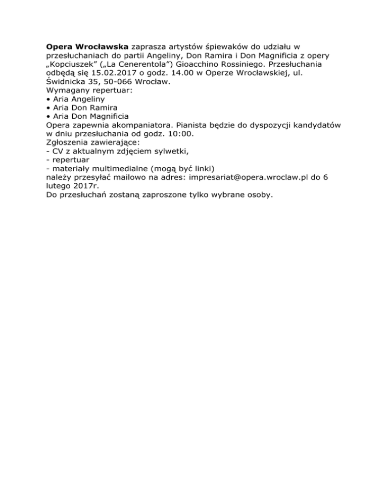 Opera Wrocławska zaprasza artystów śpiewaków do udziału w przesłuchaniach do partii Angeliny, Don Ramira i Don Magnificia z opery „Kopciuszek” („La Cenerentola”) Gioacchino Rossiniego. Przesłuchania odbędą się 15.02.2017 o godz. 14.00 w Operze Wrocławskiej, ul. Świdnicka 35, 50-066 Wrocław. Wymagany repertuar: • Aria Angeliny • Aria Don Ramira • Aria Don Magnificia Opera zapewnia akompaniatora. Pianista będzie do dyspozycji kandydatów w dniu przesłuchania od godz. 10:00. Zgłoszenia zawierające: - CV z aktualnym zdjęciem sylwetki, - repertuar - materiały multimedialne (mogą być linki) należy przesyłać mailowo na adres: [email protected] do 6 lutego 2017r. Do przesłuchań zostaną zaproszone tylko wybrane osoby.