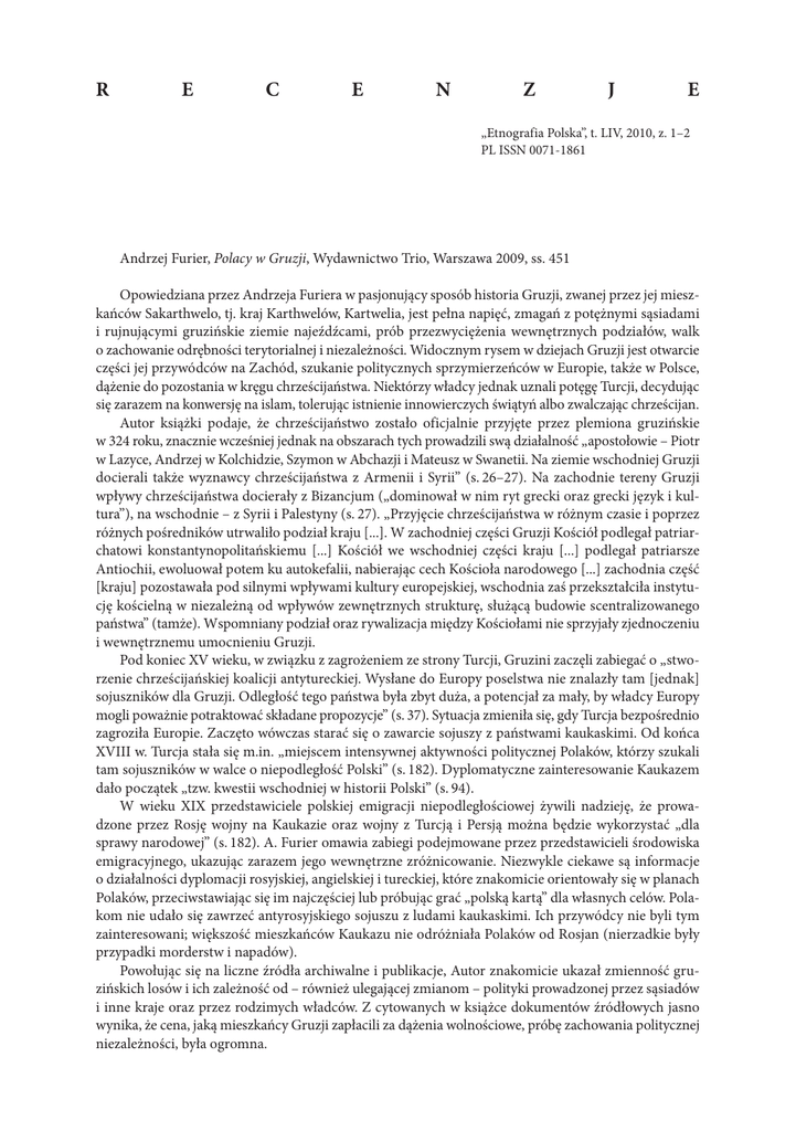R E C E N Z J E „Etnografia Polska”, t. LIV, 2010, z. 1–2 PL ISSN 0071-1861 Andrzej Furier, Polacy w Gruzji, Wydawnictwo Trio, Warszawa 2009, ss. 451 Opowiedziana przez Andrzeja Furiera w pasjonujący sposób historia Gruzji, zwanej przez jej mieszkańców Sakarthwelo, tj. kraj Karthwelów, Kartwelia, jest pełna napięć, zmagań z potężnymi sąsiadami i rujnującymi gruzińskie ziemie najeźdźcami, prób przezwyciężenia wewnętrznych podziałów, walk o zachowanie odrębności terytorialnej i niezależności. Widocznym rysem w dziejach Gruzji jest otwarcie części jej przywódców na Zachód, szukanie politycznych sprzymierzeńców w Europie, także w Polsce, dążenie do pozostania w kręgu chrześcijaństwa. Niektórzy władcy jednak uznali potęgę Turcji, decydując się zarazem na konwersję na islam, tolerując istnienie innowierczych świątyń albo zwalczając chrześcijan. Autor książki podaje, że chrześcijaństwo zostało oficjalnie przyjęte przez plemiona gruzińskie w 324 roku, znacznie wcześniej jednak na obszarach tych prowadzili swą działalność „apostołowie – Piotr w Lazyce, Andrzej w Kolchidzie, Szymon w Abchazji i Mateusz w Swanetii. Na ziemie wschodniej Gruzji docierali także wyznawcy chrześcijaństwa z Armenii i Syrii” (s. 26–27). Na zachodnie tereny Gruzji wpływy chrześcijaństwa docierały z Bizancjum („dominował w nim ryt grecki oraz grecki język i kultura”), na wschodnie – z Syrii i Palestyny (s. 27). „Przyjęcie chrześcijaństwa w różnym czasie i poprzez różnych pośredników utrwaliło podział kraju [...]. W zachodniej części Gruzji Kościół podlegał patriarchatowi konstantynopolitańskiemu [...] Kościół we wschodniej części kraju [...] podlegał patriarsze Antiochii, ewoluował potem ku autokefalii, nabierając cech Kościoła narodowego [...] zachodnia część [kraju] pozostawała pod silnymi wpływami kultury europejskiej, wschodnia zaś przekształciła instytucję kościelną w niezależną od wpływów zewnętrznych strukturę, służącą budowie scentralizowanego państwa” (tamże). Wspomniany podział oraz rywalizacja między Kościołami nie sprzyjały zjednoczeniu i wewnętrznemu umocnieniu Gruzji. Pod koniec XV wieku, w związku z zagrożeniem ze strony Turcji, Gruzini zaczęli zabiegać o „stworzenie chrześcijańskiej koalicji antytureckiej. Wysłane do Europy poselstwa nie znalazły tam [jednak] sojuszników dla Gruzji. Odległość tego państwa była zbyt duża, a potencjał za mały, by władcy Europy mogli poważnie potraktować składane propozycje” (s. 37). Sytuacja zmieniła się, gdy Turcja bezpośrednio zagroziła Europie. Zaczęto wówczas starać się o zawarcie sojuszy z państwami kaukaskimi. Od końca XVIII w. Turcja stała się m.in. „miejscem intensywnej aktywności politycznej Polaków, którzy szukali tam sojuszników w walce o niepodległość Polski” (s. 182). Dyplomatyczne zainteresowanie Kaukazem dało początek „tzw. kwestii wschodniej w historii Polski” (s. 94). W wieku XIX przedstawiciele polskiej emigracji niepodległościowej żywili nadzieję, że prowadzone przez Rosję wojny na Kaukazie oraz wojny z Turcją i Persją można będzie wykorzystać „dla sprawy narodowej” (s. 182). A. Furier omawia zabiegi podejmowane przez przedstawicieli środowiska emigracyjnego, ukazując zarazem jego wewnętrzne zróżnicowanie. Niezwykle ciekawe są informacje o działalności dyplomacji rosyjskiej, angielskiej i tureckiej, które znakomicie orientowały się w planach Polaków, przeciwstawiając się im najczęściej lub próbując grać „polską kartą” dla własnych celów. Polakom nie udało się zawrzeć antyrosyjskiego sojuszu z ludami kaukaskimi. Ich przywódcy nie byli tym zainteresowani; większość mieszkańców Kaukazu nie odróżniała Polaków od Rosjan (nierzadkie były przypadki morderstw i napadów). Powołując się na liczne źródła archiwalne i publikacje, Autor znakomicie ukazał zmienność gruzińskich losów i ich zależność od – również ulegającej zmianom – polityki prowadzonej przez sąsiadów i inne kraje oraz przez rodzimych władców. Z cytowanych w książce dokumentów źródłowych jasno wynika, że cena, jaką mieszkańcy Gruzji zapłacili za dążenia wolnościowe, próbę zachowania politycznej niezależności, była ogromna. 194 RECENZJE Na ziemiach gruzińskich, podobnie jak na innych terenach Kaukazu, od wieków spotykali się ludzie należący do różnych kultur. Docierali tu m.in. przedstawiciele kultury greckiej i rzymskiej, Ormianie, Żydzi, Azerowie, Rosjanie, Polacy, Ukraińcy, Niemcy. Ich losy są ściśle związane z dziejami Gruzji. Losy Gruzinów i Polaków, o których jest przede wszystkim mowa w recenzowanej książce, splotły się ze sobą m.in. w wyniku realizacji imperialnych planów rosyjskich carów. Autor podaje przykłady różnych postaw mieszkańców Gruzji wobec Rosji i prowadzonej przez nią polityki, zwraca uwagę na rozdźwięk między zachowaniami elit i przedstawicieli innych grup, przede wszystkim szlachty i chłopstwa, a także na różnice w sposobach działania przywódców poszczególnych regionów. Wskazuje ponadto na różnice w zachowaniach szlachty polskiej i gruzińskiej, podkreślając, że szlachta polska, w przeciwieństwie do gruzińskiej, „była przeciwna rosyjskim porządkom i dlatego inicjowała powstania narodowe” (s. 57)1. Odmienność postaw, zdaniem Autora, wynika z różnic w poziomie rozwoju społeczno-ekonomicznego Polski, Rosji i Gruzji. „Polska w momencie narzucenia jej wschodniej części panowania rosyjskiego stała na wyższym poziomie rozwoju społeczno-ekonomicznego niż Rosja, Gruzja zaś była gorzej rozwinięta od Rosji pod względem instytucjonalnym i gospodarczym. [...] Gruzińskie wystąpienia antyrosyjskie miały [ponadto] w większym stopniu charakter ruchów społecznych o podłożu ekonomicznym” (s. 57). Dla części mieszka