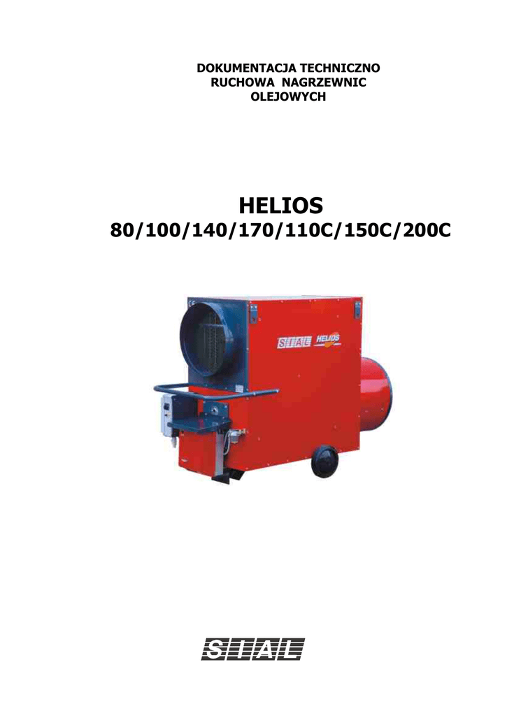 DOKUMENTACJA TECHNICZNO RUCHOWA NAGRZEWNIC OLEJOWYCH HELIOS 80/100/140/170/110C/150C/200C Spis treœci 1. Informacje ogólne 4 1.1 Zastosowanie 1.2 Opis techniczny 4 4 2. Warunki u¿ytkowania 2.1 2.2 2.3 2.4 2.5 2.6 2.7 2.8 2.9 4 Zagro¿enia spowodowane nieodpowiedni¹ obs³ug¹ Warunki pracy Paliwo Ogólne zasady Spaliny Dodatkowe zabezpieczenia Zastrze¿enia do u¿ytkowania Zastrze¿enia do instalacji Wzglêdy bezpieczeñstwa 4 4 4 5 5 5 6 6 6 3. Informacje techniczne 6 3. Opis instalacji 7 5 Obs³uga urz¹dzenia 8 5.1 Rozruch 5.2 Wy³¹czenie 8 8 5. Utrzymanie 8 7. Rozwi¹zania typowych problemów 9 8. Instalacja komina odprowadzaj¹cego spaliny 10 9. Wymiary 11 10. Schemat elektryczny 12 Zabrania siê wy³¹czania nagrzewnicy przez od³¹czenie przewodu zasilaj¹cego. Wy³¹czenie urz¹dzenia wtyczk¹ grozi jego zniszczeniem. -3- 1. Informacje ogólne Przed przyst¹pieniem do instalowania nagrzewnicy nale¿y dokonaæ zewnêtrznych oglêdzin celem upewnienia siê czy nie zosta³a ona uszkodzona w czasie transportu oraz sprawdzenia kompletnoœci wyposa¿enia. 1.1 Zastosowanie Nagrzewnice powietrza firmy SIAL to nowoczesne urz¹dzenia przeznaczone do ogrzewania i wentylacji czystym powietrzem obiektów przemys³owych i u¿ytecznoœci publicznej. Do typowych obiektów zastosowania nagrzewnic nale¿¹: domy jednorodzinne, warsztaty, hale przemys³owe i handlowe, magazyny, koœcio³y, hurtownie, sale widowiskowe, obiekty uzdrowiskowe, obiekty inwentarskie, suszarnie, szklarnie i tunele foliowe, itp. 1.2 Opis techniczny Jednostki wyposa¿one s¹ w 3-pierœcieniowy wymiennik ciep³a, w którym powietrze kr¹¿y wokó³ zewnêtrznych czêœci: spaliny wchodz¹ do wymiennika, z którego przez komin wyprowadzane s¹ na zewn¹trz. Powietrze opuszczaj¹ce nagrzewnicê jest czyste tzn. tej samej jakoœci, co powietrze wchodz¹ce do nagrzewnicy. Nagrzewnice wyposa¿one s¹ w kó³ka u³atwiaj¹ce transport. 2.Warunki u¿ytkowania 2.1 Zagro¿enia, które mog¹ byæ spowodowane nieodpowiedni¹ obs³ug¹. Nagrzewnica wyposa¿ona jest w zabezpieczenia które zosta³y przetestowane i otrzyma³y odpowiednie atesty. Nieodpowiednie u¿ytkowanie mo¿e powodowaæ zagro¿enie dla osoby obs³uguj¹cej urz¹dzenie, lub te¿ dla innych urz¹dzeñ pod³¹czonych do tej samej instalacji elektrycznej. Wszystkie osoby dokonuj¹ce instalacji i rozruchu lub obs³ugi nagrzewnicy musz¹ postêpowaæ zgodnie z zaleceniami zawartymi w niniejszej instrukcji. 2.2 Warunki pracy • temp. powietrza zasysanego: • temp. otoczenia palnika: • wilgotnoœæ wzglêdna powietrza: • zapylenie: -25°C ¸ +40°C -5°C ¸ +40°C 95% max. 1mg/m3 2.3 Paliwo Aby zapewniæ prawid³ow¹ pracê urz¹dzenia nale¿y stosowaæ olej opa³owy lekki. Nale¿y zwróciæ uwagê na odpowietrzenie przewodów paliwowych. Stosowanie niew³aœciwego paliwa mo¿e doprowadziæ do: - zatkania filtru paliwa lub dyszy - tworzenia siê nagaru na elektrodach uk³adu zap³onowego - nieprawid³owej pracy palnika lub jego uszkodzenia -4- W³aœciwoœci oleju: - lepkoœæ - gêstoœæ - zawartoœæ siarki - temperatura zap³onu - temp. krzepniêcia - wartoœæ opa³owa £ 6mm2/s przy 20°C £ 0,86 kg/cm3 £ 0,3% ³ 55°C ³ -6°C ³ 42000 kJ/kg 2.4 Ogólne zasady Nagrzewnice powietrza z odprowadzeniem spalin mog¹ byæ u¿ywane wewn¹trz pomieszczeñ w których przebywaj¹ ludzie. Spaliny wydobywaj¹ce siê z urz¹dzenia musz¹ byæ usuniête na zewn¹trz poprzez przewód kominowy. W pomieszczeniu w którym zainstalowane jest urz¹dzenie powinien byæ zapewniony dop³yw powietrza w iloœci zapewniaj¹cej prawid³ow¹ pracê wentylatora. Je¿eli nagrzewnica pracuje na powietrzu obiegowym (tylko powietrze z pomieszczenia ogrzewanego) nie wolno zas³aniaæ kratek wlotowych powietrza. UWAGA! Nie nale¿y instalowaæ nagrzewnicy w miejscu w którym znajduj¹ siê materia³y ³atwopalne lub otwarty p³omieñ. UWAGA! Spaliny mog¹ powodowaæ samozapalenie, zawsze nale¿y pamiêtaæ o odpowiedniej odleg³oœci od ³atwopalnych materia³ów. 2.5 Spaliny Nagrzewnice powietrza wywo³uj¹ ciœnienie akustyczne do 80dB(A). Zawartoœæ tlenku wêgla (CO) w spalinach jest poni¿ej norm dopuszczanych przez prawo. Instalacja odprowadzenia spalin powinna byæ wykonana zgodnie ze szczegó³owymi przepisami dotycz¹cymi rodzaju dachu, rodzaju przewodu kominowego i sposobu jego prowadzenia. Przed pod³¹czeniem urz¹dzenia najlepiej zasiêgn¹æ rady u mistrza kominiarskiego. Instalacja odprowadzenia spalin powinna byæ wykonana tak, aby trasa przewodów odprowadzaj¹cych spaliny w odcinku poziomym nie przekracza³a d³ugoœci 3m i posiada³a mo¿liwie ma³o zagiêæ - max 3. Konieczne jest wyprowadzenie wylotu spalin ponad dach, na wysokoœæ zabezpieczaj¹c¹ przed zadmuchiwaniem przez wiatr. 2.6 Dodatkowe zabezpieczenia Nagrzewnica powietrza spala paliwo w zamkniêtej komorze. Spaliny usuwane s¹ na zewn¹trz poprzez przewód kominowy. Gor¹ce powietrze transportowane jest przez wentylator osiowy lub promieniowy. Wentylator os³oniêty jest siatk¹ umieszczon¹ przy wlocie powietrza. Nagrzewnica nie powinna byæ uruchamiana bez tej siatki, gdy¿ mo¿e to spowodowaæ awariê urz¹dzenia lub stanowiæ zagro¿enie dla ludzi. -5- Wlot i wylot powietrza powinny byæ w pe³ni ods³oniête aby zapewniæ swobodny przep³yw powietrza i nie dopuœciæ do przegrzania urz¹dzenia. Jeœli spaliny bêd¹ wydmuchiwane bezpoœrednio na ³atwopalne przedmioty to mog¹ ³atwo wywo³aæ samozap³on. Przed podjêciem jakichkolwiek czynnoœci zwi¹zanych z czyszczeniem i konserwacj¹ nale¿y wy³¹czyæ urz¹dzenie z sieci elektrycznej. Nagrzewnica s³u¿y do ogrzewania i wentylacji i nie powinna byæ stosowana do ¿adnych innych celów. 2.7 Zastrze¿enia do u¿ytkowania Nagrzewnica powinna byæ obs³ugiwana przez wykwalifikowane osoby, które przed wykonaniem jakichkolwiek czynnoœci powinny dok³adnie przeczytaæ niniejsz¹ instrukcjê. 2.8 Zastrze¿enia do instalacji Urz¹dzenie powinno zostaæ zai
