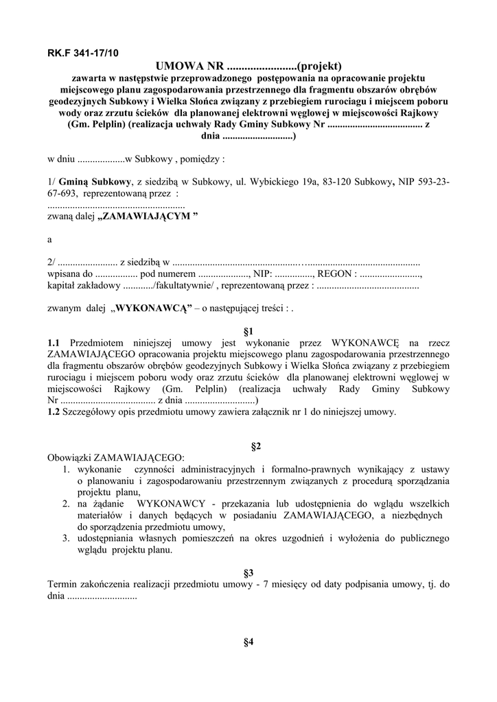 RK.F 341-17/10 UMOWA NR ........................(projekt) zawarta w następstwie przeprowadzonego postępowania na opracowanie projektu miejscowego planu zagospodarowania przestrzennego dla fragmentu obszarów obrębów geodezyjnych Subkowy i Wielka Słońca związany z przebiegiem rurociagu i miejscem poboru wody oraz zrzutu ścieków dla planowanej elektrowni węglowej w miejscowości Rajkowy (Gm. Pelplin) (realizacja uchwały Rady Gminy Subkowy Nr ...................................... z dnia ............................) w dniu ...................w Subkowy , pomiędzy : 1/ Gminą Subkowy, z siedzibą w Subkowy, ul. Wybickiego 19a, 83-120 Subkowy, NIP 593-2367-693, reprezentowaną przez : ....................................................... zwaną dalej „ZAMAWIAJĄCYM ” a 2/ ........................ z siedzibą w ..................................................…............................................. wpisana do ................. pod numerem ...................., NIP: ..............., REGON : ........................, kapitał zakładowy ............/fakultatywnie/ , reprezentowaną przez : ......................................... zwanym dalej „WYKONAWCĄ” – o następującej treści : . §1 1.1 Przedmiotem niniejszej umowy jest wykonanie przez WYKONAWCĘ na rzecz ZAMAWIAJĄCEGO opracowania projektu miejscowego planu zagospodarowania przestrzennego dla fragmentu obszarów obrębów geodezyjnych Subkowy i Wielka Słońca związany z przebiegiem rurociagu i miejscem poboru wody oraz zrzutu ścieków dla planowanej elektrowni węglowej w miejscowości Rajkowy (Gm. Pelplin) (realizacja uchwały Rady Gminy Subkowy Nr ...................................... z dnia ............................) 1.2 Szczegółowy opis przedmiotu umowy zawiera załącznik nr 1 do niniejszej umowy. §2 Obowiązki ZAMAWIAJĄCEGO: 1. wykonanie czynności administracyjnych i formalno-prawnych wynikający z ustawy o planowaniu i zagospodarowaniu przestrzennym związanych z procedurą sporządzania projektu planu, 2. na żądanie WYKONAWCY - przekazania lub udostępnienia do wglądu wszelkich materiałów i danych będących w posiadaniu ZAMAWIAJĄCEGO, a niezbędnych do sporządzenia przedmiotu umowy, 3. udostępniania własnych pomieszczeń na okres uzgodnień i wyłożenia do publicznego wglądu projektu planu. §3 Termin zakończenia realizacji przedmiotu umowy - 7 miesięcy od daty podpisania umowy, tj. do dnia ............................ §4 4.1 Za wykonanie przedmiotu umowy określonego w §1 niniejszej umowy ZAMAWIAJĄCY zapłaci WYKONAWCY łączne wynagrodzenie ryczałtowe brutto w kwocie ……………… zł. (słownie: ........…) , w tym podatek VAT ………………………... 4.2 Kwota określona w pkt.4.1 została ustalona w oparciu o ofertę złożoną przez WYKONAWCĘ w zapytaniu cenowym na opracowanie projektu miejscowego planu zagospodarowania przestrzennego dla fragmentu obszarów obrębów geodezyjnych Subkowy i Wielka Słońca związany z przebiegiem rurociagu i miejscem poboru wody oraz zrzutu ścieków dla planowanej elektrowni węglowej w miejscowości Rajkowy (Gm. Pelplin) (realizacja uchwały Rady Gminy Subkowy Nr ...................................... z dnia ............................), stanowiącą integralną część niniejszej umowy. 4.3 Strony ustalają, że w trakcie obowiązywania umowy kwota określona w pkt.4.1 nie może ulec zmianie. §5 5.1 Podstawę wystawienia faktury stanowić będzie protokół odbioru przedmiotu umowy podpisany przez obie strony umowy. 5.2 Płatność wynagrodzenia z tytułu realizacji umowy wskazanego w §1 pk.t 1.1 nastąpi w terminie 30 (słownie: trzydziestu) dni od daty otrzymania przez ZAMAWIAJĄCEGO faktury, przelewem, na następujący rachunek bankowy WYKONAWCY : ............................................... . 5.3 W przypadku przekroczenia przez ZAMAWIAJĄCEGO terminu płatności- określonego w pkt.5.2 – WYKONAWCA może dochodzić odsetek ustawowych od wartości niezrealizowanej płatności za każdy dzień przekroczenia terminu płatności . §6 6.1 Jeżeli WYKONAWCA nie dotrzyma terminu realizacji przedmiotu umowy wskazanego w §3 pkt.3.2 niniejszej umowy ZAMAWIAJĄCY wyznaczy WYKONAWCY dodatkowy termin na wykonanie przedmiotu umowy. W przypadku jego bezskutecznego upływu WYKONAWCA zapłaci ZAMAWIAJĄCEMU kary umowne w wysokości 1% ( słownie: jeden procent) wartości brutto wynagrodzenia należnego WYKONAWCY z tytułu realizacji etapu przedmiotu umowy, którego realizacji dotyczy zwłoka WYKONAWCY (§4 pkt.4.1 niniejszej umowy) za każdy dzień zwłoki . W przypadku , gdy zwłoka WYKONAWCY w spełnieniu świadczenia w całości lub w części wynosi co najmniej 15 dni ( w stosunku do terminu określonego w §3 pkt.3.2 niniejszej umowy ) , ZAMAWIAJĄCY może odstąpić od umowy zachowując roszczenie o zapłatę kar umownych należnych mu za okres od dnia powstania opóźnienia do dnia odstąpienia od niniejszej umowy. 6.2 W przypadku odstąpienia od umowy z przyczyn leżących po stronie WYKONAWCY – WYKONAWCA zapłaci ZAMAWIAJĄCEMU dodatkowo karę umowną w wysokości 10% (słownie: dziesięć procent) wartości brutto wynagrodzenia należnego WYKONAWCY z tytułu realizacji przedmiotu umowy ( §4 pkt.4.1 niniejszej umowy). 6.3 Strony zastrzegają sobie prawo dochodzenia odszkodowania uzupełniającego przekraczającego wartość zastrzeżonych kar umownych . 6.4 WYKONAWCA oświadcza, że wyraża zgodę na potracenie, w rozumieniu art. 498 i 499 Kodeksu cywilnego, powstałej należności w przypadku niedotrzymania terminu realizacji przedmiotu umowy poprzez naliczenie kary umownej, o której mowa w pkt.6.1. Jednocześnie WYKONAWCA oświadcza, że powyższe nie jest obarczone jakąkolwiek inna wadą oświadczenia woli, skutkującą jego nieważnością. ZAMAWIAJĄCY oświadcza, że wystawi WYKONAWCY notę w ciągu 21 dni od dokonania potrącenia zawierającą szczegółowe naliczenie kary umownej w przypadku 