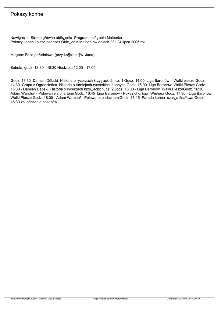 Pokazy konne Nawigacja: Strona g³ówna oblê¿enia Program oblê¿enia Malborka Pokazy konne i pisze podczas Oblê¿enia Malborkaw dniach 23 i 24 lipca 2005 rok Miejsce: Fosa po³udniowa (przy ko¶ciele ¶w. Jana), Sobota: godz. 13.30 - 18.30 Niedziela 12:00 - 17:00 Godz. 13:30 Damian Dêbski Historia o rycerzach krzy¿ackich, cz. 1 Godz. 14:00 Liga Baronów - Walki piesze Godz. 14:30 Grupa z Ogrodzieñca Historia o turniejach rycerskich konnych Godz. 15:00 Liga Baronów Walki Piesze Godz. 15:30 - Damian Dêbski Historia o rycerzach krzy¿ackich, cz. 2Godz. 16:00 - Liga Baronów Walki PieszeGodz. 16:30 Adam Warcho³ - Polowanie z chartami Godz. 16:45 Liga Baronów - Pokaz chor±gwi Wejhera Godz. 17:30 - Liga Baronów Walki Piesze Godz. 18:00 - Adam Warcho³ - Polowanie z chartamiGodz. 18:15 Parada konna szar¿a fina³owa Godz. 18:30 zakoñczenie pokazów http://www.malbork.pl/um/ - Malbork, Urz±d Miasta Page created by www.kraszewski.pl Generated: 9 March, 2017, 00:39