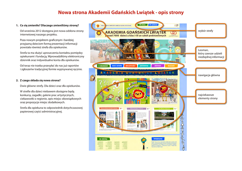 Nowa strona Akademii Gdañskich Lwi¹tek - opis strony 1. Co siê zmieni³o? Dlaczego zmieniliœmy stronê? Od wrzeœnia 2012 dostêpna jest nowa ods³ona strony internetowej naszego projektu. Poza nowym projektem graficznym i bardziej przyjazn¹ dzieciom form¹ prezentacji informacji powsta³a równie¿ strefa dla opiekunów. Strefa ta ma s³u¿yæ uproszczeniu kontaktu pomiêdzy opiekunami i fundacj¹. Wprowadziliœmy elektroniczny dziennik oraz indywidualne konta dla opiekunów. wybór strefy Leoman, który zawsze udzieli niezbêdnej informacji Od teraz nie trzeba przesy³aæ do nas ju¿ raportów i zg³oszeñw tradycyjnej formie wypisywanej rêcznie. nawigacja g³ówna 2. Z czego sk³ada siê nowa strona? Dwie g³ówne strefy. Dla dzieci oraz dla opiekunów. W strefie dla dzieci niebawem dostêpne bêd¹ konkursy, zagadki, galerie prac artystycznych, ciekawostki o regionie, opis miejsc obowi¹zkowych oraz propozycje miejsc dodatkowych. Strefa dla opiekuna to odpowiednik dotychczasowej papierowej czêœci administracyjnej. najciekawsze elementy strony