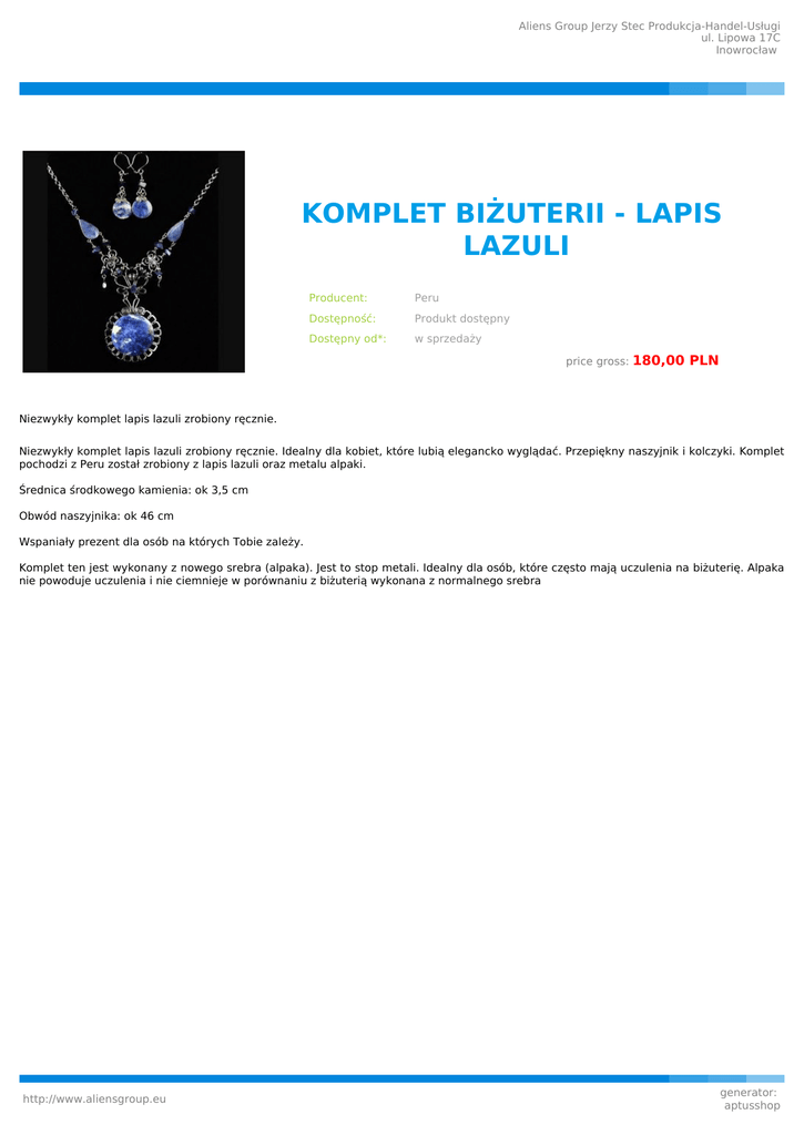 Aliens Group Jerzy Stec Produkcja-Handel-Usługi ul. Lipowa 17C Inowrocław KOMPLET BIŻUTERII - LAPIS LAZULI Producent: Peru Dostępność: Produkt dostępny Dostępny od*: w sprzedaży price gross: 180,00 PLN Niezwykły komplet lapis lazuli zrobiony ręcznie. Niezwykły komplet lapis lazuli zrobiony ręcznie. Idealny dla kobiet, które lubią elegancko wyglądać. Przepiękny naszyjnik i kolczyki. Komplet pochodzi z Peru został zrobiony z lapis lazuli oraz metalu alpaki. Średnica środkowego kamienia: ok 3,5 cm Obwód naszyjnika: ok 46 cm Wspaniały prezent dla osób na których Tobie zależy. Komplet ten jest wykonany z nowego srebra (alpaka). Jest to stop metali. Idealny dla osób, które często mają uczulenia na biżuterię. Alpaka nie powoduje uczulenia i nie ciemnieje w porównaniu z biżuterią wykonana z normalnego srebra http://www.aliensgroup.eu generator: aptusshop