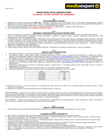 Strona 1 z 2 REGULAMIN AKCJI PROMOCYJNEJ Promocja „ULTRA JAKOŚĆ OD SAMSUNG” 1. 2. 3. 1. 2. 3. 4. 1. 2. 3. 4. 5. 6. §1 POSTANOWIENIA OGÓLNE Organizatorem Akcji promocyjnej jest TERG S.A. z siedzibą w Złotowie przy ul. Za Dworcem 1D, 77-400 Złotów, zarejestrowaną w Sądzie Rejonowym w Poznaniu Poznań Nowe Miasto i Wilda, IX Wydział Gospodarczy Krajowego Rejestru Sądowego pod numerem KRS 0000427063, nr NIP 767-10-04-218, o kapitale zakładowym w wysokości 37.500.000 PLN (Organizator). Akcja promocyjna organizowana jest w oparciu o niniejszy regulamin i prowadzona jest w sklepach TERG Media Expert. Czas trwania Akcji promocyjnej: od 19 maja do 30 czerwca 2014r. §2 WARUNKI UCZESTNICTWA W AKCJI PROMOCYJNEJ W Akcji promocyjnej nie mogą brać udziału pracownicy Organizatora. Zakaz dotyczy tylko pracowników, którzy mieli bezpośredni kontakt i wpływ na realizację projektu, uczestniczyli w jego opracowaniu i wdrożeniu a także ich dzieci, rodziców, rodzeństwa, małżonków oraz osób pozostających w stosunku przysposobienia. Z zastrzeżeniem pkt.1 niniejszego paragrafu, Uczestnikiem Akcji promocyjnej może być osoba fizyczna, posiadająca pełną zdolność do czynności prawnych (ukończyła 18 lat i nie jest częściowo lub całkowicie ubezwłasnowolniona w rozumieniu Kodeksu Cywilnego), dokonująca zakupu towarów w ilościach detalicznych na potrzeby prywatne zgodnie z §3. Osoby, nie posiadające pełnej zdolności do czynności prawnych mogą brać udział w akcji promocyjnej jedynie przy współudziale swojego przedstawiciela ustawowego/opiekuna prawnego, który zapoznał się z treścią niniejszego Regulaminu i zaakceptował jego postanowienia. Uczestnictwo w Akcji promocyjnej jest dobrowolne. Każdy Uczestnik biorący udział w Akcji promocyjnej potwierdza, że zapoznał się z niniejszym Regulaminem i w pełni go akceptuje. §3 ZASADY AKCJI PROMOCYJNEJ Warunkiem skorzystania z promocji jest zakup wybranego telewizora SAMSUNG, Po dokonaniu zakupu z opcją odbioru towaru w sklepie stacjonarnym Klient otrzyma w prezencie KOD RABATOWY o wartości do 1000zł w zależności od zakupionego modelu do wykorzystania w sklepie internetowym www.mediexpert.pl, który po wprowadzeniu w odpowiednie pole pierwszego kroku ścieżki zakupowej w sklepie internetowym www.mediaexpert.pl obniża wartość produktów do nowych cen promocyjnych. Po dokonaniu zakupu z opcją dostawy towaru kurierem pod wskazany adres Klient otrzyma specjalny, jednorazowy KOD RABATOWY o wartości do 1000 zł w zależności od zakupionego modelu do wykorzystania w sklepie internetowym www.mediexpert.pl, który po wprowadzeniu w odpowiednie pole pierwszego kroku ścieżki zakupowej w sklepie internetowym www.mediaexpert.pl obniża wartość produktów do nowych cen promocyjnych. Przydzielony, jednorazowy kod może być realizowany jedynie na pełną kwotę i w przypadku zakupu towaru poniżej 500 zł towar na fakturze będzie kwota 1,23 zł brutto. KOD RABATOWY będzie wysyłany do klientów po upływie 15 dni od daty zakończenia promocji. Telewizory SAMSUNG biorące udział w promocji wraz z przysługującą im wartością na karcie to modele: NAZWA UE40HU6900 UE50HU6900 UE55HU6900 UE55HU7500 UE65HU7500 WARTOŚĆ KODU 500 750 750 1000 1000 3. Promocja się nie łączy z innymi promocjami. W przypadku gdy Klient uzyska inny rabat na Sali sprzedaży będzie miał prawo wyboru, z której promocji chce skorzystać. 4. Każdorazowo sprzedaż w ramach promocji musi być ewidencjonowana na fakturze. KARTA BONUSOWA - karta bonusowa wydana w ramach promocji upoważnia do zniżki w kwocie na jaką doładowana jest karta przy kolejnym zakupie towarów nie biorących udziału w innej promocji w sieci sklepów TERG Media Expert. Karta bonusowa aktywowana jest w ciągu 24h od ich zasilenia i wydania Klientowi. Ważna jest rok od momentu ich aktywowania (pierwszego doładowania na terminalu). Karta do realizacji w sieci sklepów Terg Media Expert nie jest środkiem płatniczym i nie podlega wymianie na ekwiwalent pieniężny. KOD RABATOWY – specjalny kod rabatowy, który po wprowadzeniu w odpowiednie pole pierwszego kroku ścieżki zakupowej w sklepie internetowym www.mediaexpert.pl obniża wartość produktów do nowych cen promocyjnych. 1. 1. 2. 3. 4. 5. §4 OPŁATY TRANSPORTOWE Towary objęte Akcją promocyjną podlegają opłacie transportowej zgodnie z taryfikatorem obowiązującym w dniu zakupu. §5 OCHRONA DANYCH OSOBOWYCH Dane osobowe Uczestników Akcji promocyjnej będą przetwarzane w celach przeprowadzenia niniejszej promocji. Dane osobowe uczestników Akcji będą wykorzystywane zgodnie z warunkami określonymi w ustawie z dnia 29 sierpnia 1997r. o ochronie danych osobowych (tekst jednolity : Dz. U. z 2002 r., Nr 101 poz. 926). Przetwarzanie danych, o których mowa w pkt. 1 niniejszego paragrafu obejmuje także publikację imion i nazwisk uczestników Akcji promocyjnej oraz nazw miejscowości, w których zamieszkują. Podanie danych osobowych jest dobrowolne. Nie udostępnienie danych osobowych uniemożliwia udział w akcji promocyjnej. Uczestnikom udostępniającym dane przysługuje prawo dostępu do treści swoich danych ich poprawiania. Administratorem danych osobowych Uczestników Akcji promocyjnej jest: TERG S.A z siedzibą w Złotowie. Adres: 77-400 Złotów, ul. Za Dworcem 1D, wpisana do rejestru przedsiębiorców prowadzonego przez Sąd Rejonowy w Poznaniu - Nowe Miasto i Wilda – IX Gospodarczy Krajowego Rejestru Sądowego pod numerem KRS 0000427063, kapitał zakładowy w wysokości 37 500.000 zł, NIP 767-10-04-218. Strona 2 z 2 1. 2. 3. 4. 1. 2. 3. 4. 5. §6 ZASADY POSTĘPOWANIA REKLAMACYJNEGO DOTYCZĄCE PRZEBIEGU PROMOCJI. Reklamacje co do przebiegu Akcji promocyjnej mogą być zgłaszane mailowo na adres [email protected]. Reklamacje rozpatrywać będzie Organizator w terminie 14 (czternastu) dni od dnia ich otrzymania. Organizator będzie rozpatrywać reklamacje na podstawie Regulaminu.