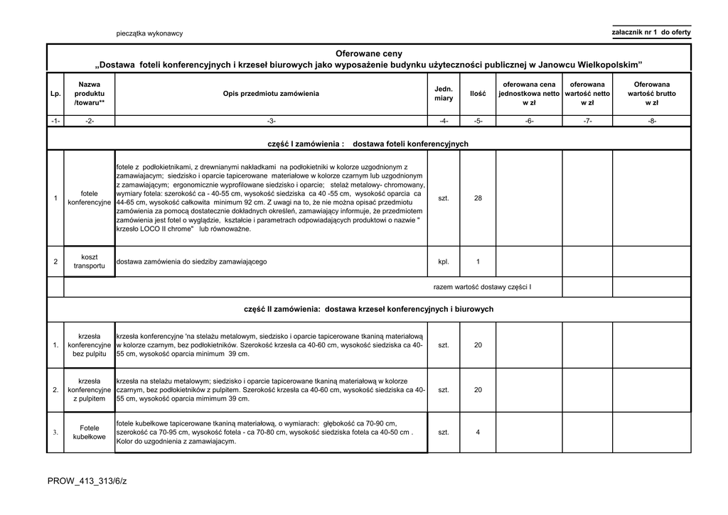 Oferowane ceny „Dostawa foteli konferencyjnych i krzeseł