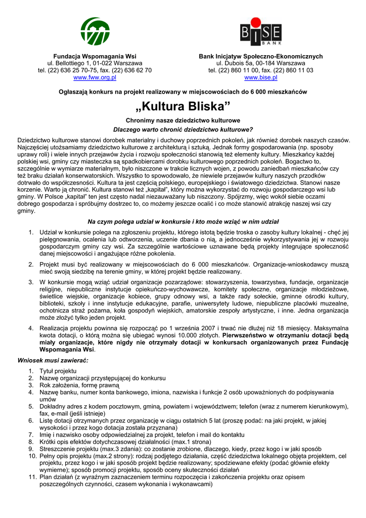 Fundacja Wspomagania Wsi ul. Bellottiego 1, 01-022 Warszawa tel. (22) 636 25 70-75, fax. (22) 636 62 70 www.fww.org.pl Bank Inicjatyw Społeczno-Ekonomicznych ul. Dubois 5a, 00-184 Warszawa tel. (22) 860 11 00, fax. (22) 860 11 03 www.bise.pl Ogłaszają konkurs na projekt realizowany w miejscowościach do 6 000 mieszkańców „Kultura Bliska” Chronimy nasze dziedzictwo kulturowe Dlaczego warto chronić dziedzictwo kulturowe? Dziedzictwo kulturowe stanowi dorobek materialny i duchowy poprzednich pokoleń, jak również dorobek naszych czasów. Najczęściej utożsamiamy dziedzictwo kulturowe z architekturą i sztuką. Jednak formy gospodarowania (np. sposoby uprawy roli) i wiele innych przejawów życia i rozwoju społeczności stanowią też elementy kultury. Mieszkańcy każdej polskiej wsi, gminy czy miasteczka są spadkobiercami dorobku kulturowego poprzednich pokoleń. Bogactwo to, szczególnie w wymiarze materialnym, było niszczone w trakcie licznych wojen, z powodu zaniedbań mieszkańców czy też braku działań konserwatorskich. Wszystko to spowodowało, że niewiele przejawów kultury naszych przodków dotrwało do współczesności. Kultura ta jest częścią polskiego, europejskiego i światowego dziedzictwa. Stanowi nasze korzenie. Warto ją chronić. Kultura stanowi też „kapitał”, który można wykorzystać do rozwoju gospodarczego wsi lub gminy. W Polsce „kapitał” ten jest często nadal niezauważany lub niszczony. Spójrzmy, więc wokół siebie oczami dobrego gospodarza i spróbujmy dostrzec to, co możemy jeszcze ocalić i co może stanowić atrakcję naszej wsi czy gminy. Na czym polega udział w konkursie i kto może wziąć w nim udział 1. Udział w konkursie polega na zgłoszeniu projektu, którego istotą będzie troska o zasoby kultury lokalnej - chęć jej pielęgnowania, ocalenia lub odtworzenia, uczenie dbania o nią, a jednocześnie wykorzystywania jej w rozwoju gospodarczym gminy czy wsi. Za szczególnie wartościowe uznawane będą projekty integrujące społeczność danej miejscowości i angażujące różne pokolenia. 2. Projekt musi być realizowany w miejscowościach do 6 000 mieszkańców. Organizacje-wnioskodawcy muszą mieć swoją siedzibę na terenie gminy, w której projekt będzie realizowany. 3. W konkursie mogą wziąć udział organizacje pozarządowe: stowarzyszenia, towarzystwa, fundacje, organizacje religijne, niepubliczne instytucje opiekuńczo-wychowawcze, komitety społeczne, organizacje młodzieżowe, świetlice wiejskie, organizacje kobiece, grupy odnowy wsi, a także rady sołeckie, gminne ośrodki kultury, biblioteki, szkoły i inne instytucje edukacyjne, parafie, uniwersytety ludowe, niepubliczne placówki muzealne, ochotnicza straż pożarna, koła gospodyń wiejskich, amatorskie zespoły artystyczne, i inne. Jedna organizacja może złożyć tylko jeden projekt. 4. Realizacja projektu powinna się rozpocząć po 1 września 2007 i trwać nie dłużej niż 18 miesięcy. Maksymalna kwota dotacji, o którą można się ubiegać wynosi 10.000 złotych. Pierwszeństwo w otrzymaniu dotacji będą miały organizacje, które nigdy nie otrzymały dotacji w konkursach organizowanych przez Fundację Wspomagania Wsi. Wniosek musi zawierać: 1. 2. 3. 4. 5. 6. 7. 8. 9. 10. 11. Tytuł projektu Nazwę organizacji przystępującej do konkursu Rok założenia, formę prawną Nazwę banku, numer konta bankowego, imiona, nazwiska i funkcje 2 osób upoważnionych do podpisywania umów Dokładny adres z kodem pocztowym, gminą, powiatem i województwem; telefon (wraz z numerem kierunkowym), fax, e-mail (jeśli istnieje) Listę dotacji otrzymanych przez organizację w ciągu ostatnich 5 lat (proszę podać: na jaki projekt, w jakiej wysokości i przez kogo dotacja została przyznana) Imię i nazwisko osoby odpowiedzialnej za projekt, telefon i mail do kontaktu Krótki opis efektów dotychczasowej działalności (max.1 strona) Streszczenie projektu (max.3 zdania): co zostanie zrobione, dlaczego, kiedy, przez kogo i w jaki sposób Pełny opis projektu (max.2 strony): rodzaj podjętego działania, część dziedzictwa lokalnego objęta projektem, cel projektu, przez kogo i w jaki sposób projekt będzie realizowany; spodziewane efekty (podać głównie efekty wymierne); sposób promocji projektu, sposób oceny skuteczności działań Plan działań (z wyraźnym zaznaczeniem terminu rozpoczęcia i zakończenia projektu oraz opisem poszczególnych czynności, czasem wykonania i wykonawcami) 12. Szczegółowy budżet projektu (ze wskazaniem źródeł finansowania poszczególnych pozycji budżetowych i sposobem kalkulacji kosztów). Żaden z typów wydatków poniesionych na realizację projektu w ramach dotacji (np. zakup materiałów, zakup usług, opłacenie kosztów transportu itp.) nie może przekraczać 25% tej dotacji. 13. Plany dalszych działań zmierzających do ochrony lokalnych zasobów kultury po zakończeniu finansowania z dotacji 14. Organizacje nie posiadające własnego konta podają w tym miejscu nazwę i dres organizacji, która im konta użyczy, imiona, nazwiska oraz funkcje dwóch osób upoważnionych do zawarcia umowy. Uwaga: Wnioski niezawierające wszystkich wymaganych informacji nie będą rozpatrywane. Fundacja nie zwraca nadesłanych materiałów Kryteria stosowane przy ocenie projektu • zgodność projektu z celami konkursu • efektywność projektu (duży skutek, małe koszty) • wykonalność projektu (możliwość realizacji planowanych działań w przewidywanym czasie i przy posiadanych środkach) • jakość przygotowania projektu: zrozumiały, przejrzysty i kompletny opis działań, dokładny budżet, dobrze przemyślany i przekonujący plan działania • liczba osób zaangażowanych w realizację i korzystających z efektów projektu (walor integrujący) • efekt edukacyjny projektu • pozyskanie dodatkowych funduszy i ilość pracy własnej włożonej w realizację projektu, współpraca z innymi orga