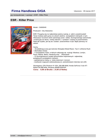 Firma Handlowa GIGA Utworzono : 09 marzec 2017 gry komputerowe > wyścigi > ESR - Killer Price ESR - Killer Price Model : Cit000045 Producent : City Interactive ESR. Przygotuj się na najbardziej szalony wyścig, w jakim uczestniczyłeś! Teraz możesz palić gumy na ulicach siedmiu europejskich metropolii, w tym Warszawy! Uruchom silnik wybranego przez siebie, stuningowanego samochodu i wciśnij gaz do dechy. Unikaj zderzeń z rywalami i uważaj na przechodniów. Pędź tak szybko, jak się da i zostaw przeciwników w tyle. Bądź pierwszy na mecie! Cechy: - Arcade’owa gra twórców Shanghai Street Racer, Taxi 3: eXtreme Rush i Manhattan Chase. - 7 europejskich miast, w których odbywają się wyścigi: Moskwa, Londyn, Paryż, Madryt, Berlin, Hamburg oraz... Warszawa! - 12 stuningowanych modeli samochodów inspirowanych najbardziej pożądanymi europejskimi markami. - spektakularne kraksy w trybie dziennym i nocnym. - możliwość rozgrywki wieloosobowej za pośrednictwem internetu lub LAN. Wymagania: CPU Pentium III 1GH, 256 MB RAM, Nvidia GeForce 3 lub ATI Radon 64 MB RAM, Windows 98/ME/2000/XP Cena : 9,90 zł Brutto ( 9,90 zł Netto) kontakt : - [email protected] Strona 1