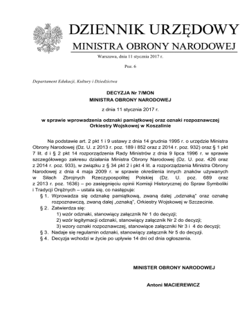 Warszawa, dnia 11 stycznia 2017 r. Poz. 6 Departament Edukacji, Kultury i Dziedzictwa DECYZJA Nr 7/MON MINISTRA OBRONY NARODOWEJ z dnia 11 stycznia 2017 r. w sprawie wprowadzenia odznaki pamiątkowej oraz oznaki rozpoznawczej Orkiestry Wojskowej w Koszalinie Na podstawie art. 2 pkt 1 i 9 ustawy z dnia 14 grudnia 1995 r. o urzędzie Ministra Obrony Narodowej (Dz. U. z 2013 r. poz. 189 i 852 oraz z 2014 r. poz. 932) oraz § 1 pkt 7 lit. d i § 2 pkt 14 rozporządzenia Rady Ministrów z dnia 9 lipca 1996 r. w sprawie szczegółowego zakresu działania Ministra Obrony Narodowej (Dz. U. poz. 426 oraz z 2014 r. poz. 933), w związku z § 34 pkt 2 i pkt 4 lit. a rozporządzenia Ministra Obrony Narodowej z dnia 4 maja 2009 r. w sprawie określenia innych znaków używanych w Siłach Zbrojnych Rzeczypospolitej Polskiej (Dz. U. poz. 689 oraz z 2013 r. poz. 1636) – po zasięgnięciu opinii Komisji Historycznej do Spraw Symboliki i Tradycji Orężnych – ustala się, co następuje: § 1 . Wprowadza się odznakę pamiątkową, zwaną dalej „odznaką” oraz oznakę rozpoznawczą, zwaną dalej „oznaką”, Orkiestry Wojskowej w Szczecinie. § 2 . Zatwierdza się: 1) wzór odznaki, stanowiący załącznik Nr 1 do decyzji; 2) wzór legitymacji odznaki, stanowiący załącznik Nr 2 do decyzji; 3) wzory oznaki rozpoznawczej, stanowiące załączniki Nr 3 i 4 do decyzji; § 3 . Nadaje się regulamin odznaki, stanowiący załącznik Nr 5 do decyzji. § 4 . Decyzja wchodzi w życie po upływie 14 dni od dnia ogłoszenia. MINISTER OBRONY NARODOWEJ Antoni MACIEREWICZ Załączniki do decyzji Nr 7/MON Ministra Obrony Narodowej z dnia 11 stycznia 2017 r. (poz.6) Załącznik Nr 1 WZÓR GRAFICZNY ODZNAKI PAMIĄTKOWEJ ORKIESTRY WOJSKOWEJ W KOSZALINIE Załącznik Nr 2 WZÓR GRAFICZNY LEGITYMACJI ODZNAKI PAMIĄTKOWEJ ORKIESTRY WOJSKOWEJ W KOSZALINIE ORKIESTRA WOJSKOWA W KOSZALINIE LEGITYMACJA ORKIESTRA WOJSKOWA W KOSZALINIE Na podstawie Rozkazu Dziennego Dowódcy Orkiestry Wojskowej Nr ………… z dnia ……………… ………………………………………… (imię i nazwisko) LEGITYMACJA Nr ………… ma prawo do posiadania ODZNAKIPAMIATKOWEJ ORKIESTRY WOJSKOWEJ W KOSZALINIE m. p. Koszalin, dnia ………….. DOWÓDCA-KAPELMISTRZ ……………….. Załącznik Nr 3 WZÓR GRAFICZNY OZNAKI ROZPOZNAWCZEJ ORKIESTRY WOJSKOWEJ W KOSZALINIE NA MUNDUR WYJŚCIOWY Załącznik Nr 4 WZÓR GRAFICZNY OZNAKI ROZPOZNAWCZEJ ORKIESTRY WOJSKOWEJ W KOSZALINIE NA MUNDUR POLOWY Załącznik Nr 5 REGULAMIN ODZNAKI PAMIĄTKOWEJ ORKIESTRY WOJSKOWEJ W KOSZALINIE 1. Odznaka pamiątkowa, zwana dalej „odznaką”, Orkiestry Wojskowej w Koszalinie, zwanej dalej „Orkiestrą”, jest symbolem przynależności do społeczności żołnierskiej Orkiestry, nienagannej służby w jej szeregach oraz solidarności i współpracy muzyków. Jest także znakiem nawiązującym do miejsca stacjonowania. 2. Celem wprowadzenia odznaki Orkiestry, jest kultywowanie i popularyzowanie tradycji orkiestr wojskowych. 3. Odznaka ma kształt krzyża rycerskiego, którego ramiona pokryte są emalią barwy niebieskiej z szarym obramowaniem. W centralnej części krzyża umieszczona została biało-czerwona szachownica, symbolizująca przynależność Orkiestry do sił powietrznych. Na szachownicę została złocista, stylizowana lira w oplocie z liści laurowych. Na dolnym ramieniu krzyża umieszczony jest napis „Koszalin” nawiązujący do miejsca stacjonowania Orkiestry. 4. Prawo do otrzymania odznaki przysługuje: 1) Dowódcy-Kapelmistrzowi Orkiestry tytułu z objęcia stanowiska służbowego; 2) żołnierzom po co najmniej dwóch latach nienagannej służby w Orkiestrze; 3) żołnierzom rezerwy, będącym na przydziałach mobilizacyjnych w Orkiestrze; 4) wyjątkowo innym osobom fizycznym lub prawnym, szczególnie zasłużonym dla Orkiestry. 5. Odznakę nadaje Dowódca-Kapelmistrz Orkiestry na wniosek Komisji do Spraw Odznaki Pamiątkowej, zwanej dalej „Komisją”. 6. Dowódca-Kapelmistrz Orkiestry powołuje 5-osobową Komisję, w składzie: 1) przewodniczący - asystent kapelmistrza; 2) członkowie: - mąż zaufania korpusu podoficerów; - trzech podoficerów. 7. Imienny skład oraz wszelkie zmiany w jej składzie ogłasza się w rozkazie dziennym Dowódcy-Kapelmistrza Orkiestry. 8. Do obowiązków Komisji należy: 1) przyjmowanie i opiniowanie wniosków o nadanie odznaki lub pozbawienie prawa do jej posiadania; 2) przedkładanie wyżej wymienionych wniosków Dowódcy-Kapelmistrzowi Orkiestry; 3) ewidencjonowanie nadanych odznak. 9. Opinie Komisji są formułowane na zasadzie jednomyślności. Treść opinii odnotowuje się na wniosku przedłożonym do rozpatrzenia. 10. Dla ważności posiedzeń Komisji zwołanych w celu rozpatrzenia przedłożonych wniosków, wymagana jest obecność co najmniej 4/5 składu Komisji. 11. Fakt nadania odznaki ogłasza się w rozkazie dziennym Dowódcy-Kapelmistrza Orkiestry. 12. Odznakę wraz z legitymacją wręcza się na uroczystej zbiórce z okazji świąt państwowych i wojskowych oraz w innych szczególnie ważnych dla służby i pracy okolicznościach, zgodnie z wymogami ceremoniału wojskowego. 13. Odznaka nadawana jest imiennie i niedopuszczalne jest przekazywanie jej innym, darowanie lub sprzedaż osobom trzecim. 14. Zasady noszenia odznaki określają przepisy ubiorcze żołnierzy Sił Zbrojnych Rzeczypospolitej Polskiej. 15. Prawo do posiadania odznaki tracą żołnierze skazani prawomocnie wyrokiem sądu za przestępstwa popełnione z winy umyślnej lub z niskich pobudek. W uzasadnionych przypadkach, prawa do odznaki mogą być pozbawieni żołnierze ukarani za przewinienia dyscyplinarne. 16. Decyzję o pozbawieniu prawa do odznaki podejmuje Dowódca-Kapelmistrz Orkiestry z własnej inicjatywy lub na wniosek Komisji. Od decyzji przysługuje prawo odwołania na piśmie do przełożonego wyższego szczebla w terminie 14 dni od dnia zawiadomienia o pozbawieniu prawa do odznaki. Decyzja przeło