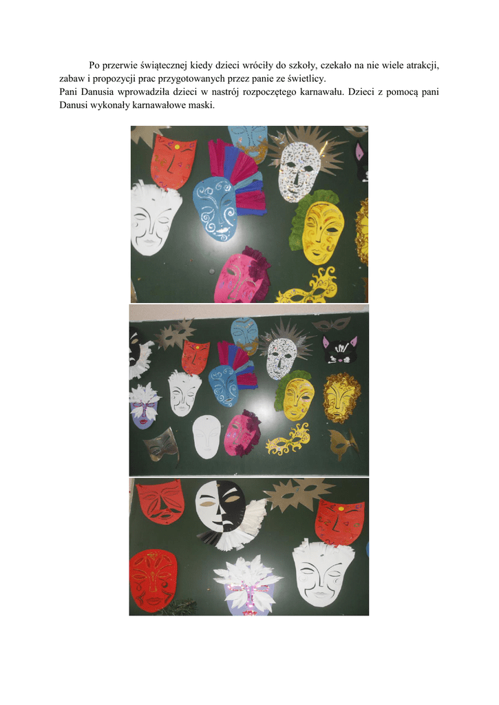 Po przerwie świątecznej kiedy dzieci wróciły do szkoły, czekało na nie wiele atrakcji, zabaw i propozycji prac przygotowanych przez panie ze świetlicy. Pani Danusia wprowadziła dzieci w nastrój rozpoczętego karnawału. Dzieci z pomocą pani Danusi wykonały karnawałowe maski. „Zima, zima, zima, pada, pada śnieg…” Ponownie zawitała za oknami zima. Tym razem ze zdwojoną siłą. Zaskoczyła pewnie nie tylko nas, ale i zwierzęta. Dzieci uczęszczające do świetlicy wykonały pracę plastyczną pod kierunkiem pani Ani Oreckiej pt. „ Dokarmiamy ptaki” Kolejne dni stycznia upływały pod hasłem „Dzień Babci i Dziadka”. Uczniowie zabrali się do pracy, aby jak najlepiej uczcić to święto. Dzieci pod opieką pani Anety i Agaty wykonały przepiękne prace plastyczne, czerwone serca wyklejone makaronem, pomalowane farbkami, artystycznie zapakowane. Prace te będą równocześnie prezentami dla babć i dziadków.