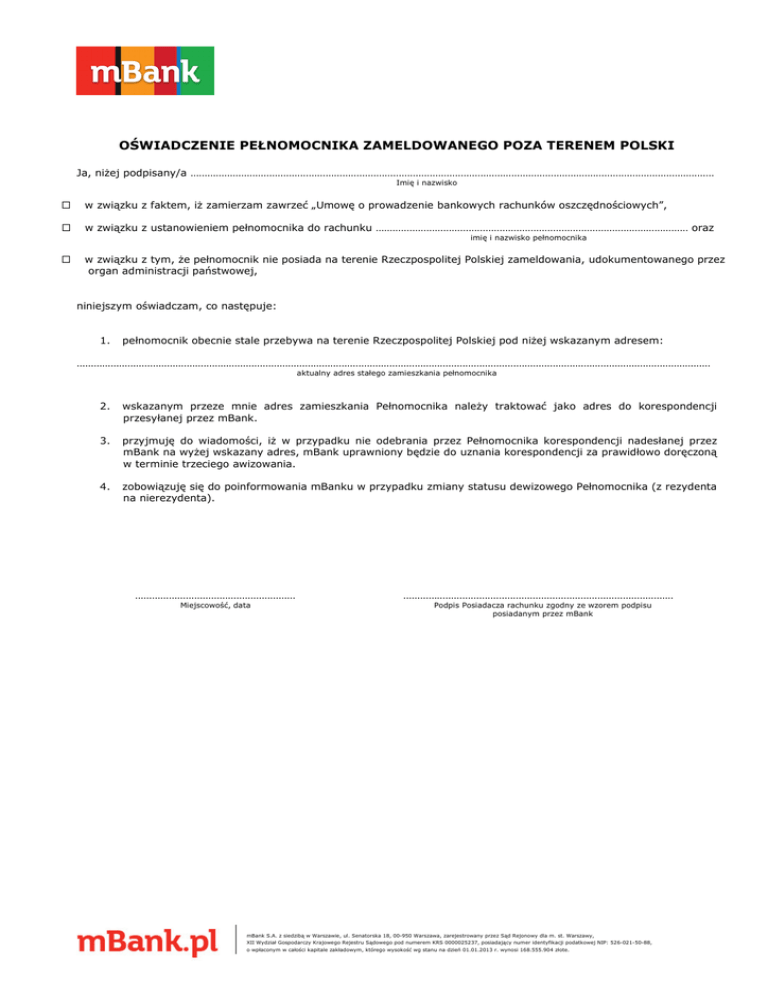 OŚWIADCZENIE PEŁNOMOCNIKA ZAMELDOWANEGO POZA TERENEM POLSKI Ja, niżej podpisany/a …………………………………………………………………………………………………………………………………………………………………… Imię i nazwisko w związku z faktem, iż zamierzam zawrzeć „Umowę o prowadzenie bankowych rachunków oszczędnościowych”, w związku z ustanowieniem pełnomocnika do rachunku ………………………………………………………………………………………………… oraz imię i nazwisko pełnomocnika w związku z tym, że pełnomocnik nie posiada na terenie Rzeczpospolitej Polskiej zameldowania, udokumentowanego przez organ administracji państwowej, niniejszym oświadczam, co następuje: 1. pełnomocnik obecnie stale przebywa na terenie Rzeczpospolitej Polskiej pod niżej wskazanym adresem: ……………………………………………………………………………………………………………………………………………………………………………………………………… aktualny adres stałego zamieszkania pełnomocnika 2. wskazanym przeze mnie adres zamieszkania Pełnomocnika należy traktować jako adres do korespondencji przesyłanej przez mBank. 3. przyjmuję do wiadomości, iż w przypadku nie odebrania przez Pełnomocnika korespondencji nadesłanej przez mBank na wyżej wskazany adres, mBank uprawniony będzie do uznania korespondencji za prawidłowo doręczoną w terminie trzeciego awizowania. 4. zobowiązuję się do poinformowania mBanku w przypadku zmiany statusu dewizowego Pełnomocnika (z rezydenta na nierezydenta). ………………………………………………… Miejscowość, data …………………………………………………………………………………… Podpis Posiadacza rachunku zgodny ze wzorem podpisu posiadanym przez mBank mBank S.A. z siedzibą w Warszawie, ul. Senatorska 18, 00-950 Warszawa, zarejestrowany przez Sąd Rejonowy dla m. st. Warszawy, XII Wydział Gospodarczy Krajowego Rejestru Sądowego pod numerem KRS 0000025237, posiadający numer identyfikacji podatkowej NIP: 526-021-50-88, o wpłaconym w całości kapitale zakładowym, którego wysokość wg stanu na dzień 01.01.2013 r. wynosi 168.555.904 złote.