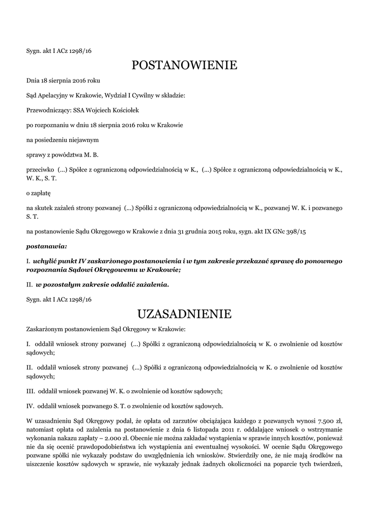 Sygn. akt I ACz 1298/16 POSTANOWIENIE Dnia 18 sierpnia 2016 roku Sąd Apelacyjny w Krakowie, Wydział I Cywilny w składzie: Przewodniczący: SSA Wojciech Kościołek po rozpoznaniu w dniu 18 sierpnia 2016 roku w Krakowie na posiedzeniu niejawnym sprawy z powództwa M. B. przeciwko (...) Spółce z ograniczoną odpowiedzialnością w K., (...) Spółce z ograniczoną odpowiedzialnością w K., W. K., S. T. o zapłatę na skutek zażaleń strony pozwanej (...) Spółki z ograniczoną odpowiedzialnością w K., pozwanej W. K. i pozwanego S. T. na postanowienie Sądu Okręgowego w Krakowie z dnia 31 grudnia 2015 roku, sygn. akt IX GNc 398/15 postanawia: I. uchylić punkt IV zaskarżonego postanowienia i w tym zakresie przekazać sprawę do ponownego rozpoznania Sądowi Okręgowemu w Krakowie; II. w pozostałym zakresie oddalić zażalenia. Sygn. akt I ACz 1298/16 UZASADNIENIE Zaskarżonym postanowieniem Sąd Okręgowy w Krakowie: I. oddalił wniosek strony pozwanej (...) Spółki z ograniczoną odpowiedzialnością w K. o zwolnienie od kosztów sądowych; II. oddalił wniosek strony pozwanej (...) Spółki z ograniczoną odpowiedzialnością w K. o zwolnienie od kosztów sądowych; III. oddalił wniosek pozwanej W. K. o zwolnienie od kosztów sądowych; IV. oddalił wniosek pozwanego S. T. o zwolnienie od kosztów sądowych. W uzasadnieniu Sąd Okręgowy podał, że opłata od zarzutów obciążająca każdego z pozwanych wynosi 7.500 zł, natomiast opłata od zażalenia na postanowienie z dnia 6 listopada 2011 r. oddalające wniosek o wstrzymanie wykonania nakazu zapłaty – 2.000 zł. Obecnie nie można zakładać wystąpienia w sprawie innych kosztów, ponieważ nie da się ocenić prawdopodobieństwa ich wystąpienia ani ewentualnej wysokości. W ocenie Sądu Okręgowego pozwane spółki nie wykazały podstaw do uwzględnienia ich wniosków. Stwierdziły one, że nie mają środków na uiszczenie kosztów sądowych w sprawie, nie wykazały jednak żadnych okoliczności na poparcie tych twierdzeń, podczas gdy uzyskanie zwolnienia od kosztów sądowych wymaga wykazania sytuacji majątkowej strony, jej potencjału gospodarczego. Nie realizuje tego oświadczenie zarządów pozwanych spółek, że reprezentowane podmioty nie mają dostatecznych środków na sprostanie kosztom sądowym w sprawie, tym bardziej, że pomija się w nich dane o bieżących źródłach przychodu, kosztach działalności, wydatkach, czy o rodzaju i wartości rynkowej majątku. Spółki podały, że nie posiadają środków pieniężnych w wysokości pozwalającej na uiszczenie opłaty sądowej, ani majątku czy dających się szybko spieniężyć dóbr o takiej wartości. Oznacza to, że spółki posiadają aktywa, tylko że oceniają je jako niewystarczające na pokrycie kosztów sądowych. Tym bardziej należało więc określić dokładnie majątek, źródła i wysokość przychodu, a także wykazać te dane. Ogólnikowe oświadczenia zarządów pozwanych spółek należy więc ocenić jako niewystarczające. W stosunku do spółki (...) Sp. z o.o. Sąd I instancji uznał, że istniejący na jej rachunku bankowym debet dotyczy czasu ubiegłego, a sam brak gotówki nie przesądza o aktualnym braku środków pieniężnych. W ocenie Sądu Okręgowego również W. K. nie wykazała podstaw do zwolnienia jej od kosztów sądowych. Z jej oświadczenia majątkowego wynika, że ma ustabilizowaną sytuację bytową i finansową, ponieważ ma stałe źródło dochodów w postaci wynagrodzenia za pracę w wysokości 2.600 zł miesięcznie, zaś jej mąż zarabia 3.600 zł miesięcznie. Na opłaty mieszkaniowe i telefon wydaje 890 zł, na tzw. „życie” 1.200 zł. Pozwaną obciążają też kredyty w łącznej kwocie 4.124 zł, co czyni łączną kwotę wydatków na poziomie 6.124 zł, czyli w granicach miesięcznych dochodów małżonków. Proporcja kosztów koniecznych utrzymania (bez obciążeń kredytowych) do wysokości opłat sądowych sprawia, że pozwana jest w stanie je ponieść bez uszczerbku dla koniecznego utrzymania siebie i rodziny. Dochody męża pozwanej również powinny zasilić jej wydatki, w tym opłaty sądowe. Sytuacja pozwanej nie może sprowadzać się do prostego porównania stanu aktualnych dochodów i wydatków. Opłaty sądowe nie mogą bowiem być traktowane jako mające charakter drugorzędny, uiszczane wówczas, gdy strona posiada zbędne środki. Strona powinna brać pod uwagę potrzebę poniesienia kosztów sądowych w oparciu o swoje dochody i majątek, a także zewnętrzne źródła finansowania. Pozwana winna liczyć się z możliwością procesu już od wezwania do zapłaty dokonanego pismem z dnia 3 kwietnia 2015 r., a najpóźniej od 15 czerwca 2015 r., gdy powzięła wiadomość o wytoczeniu niniejszego procesu, czego wyrazem było jej pismo z 15 czerwca 2015 r. Ostatecznie o zapadłym nakazie zapłaty pozwana dowiedziała się z odpisu pozwu doręczonego jej wraz z nakazem zapłaty, co miało miejsce 15 października 2015 r. Zarzuty pozwana wniosła 29 października 2015 r. Pozwana nie może domagać się zwolnienia od kosztów sądowych, ponieważ nie wykazała, aby próbowała zabezpieczyć odpowiednie środki na ten cel we własnym zakresie. Sąd Okręgowy uznał, że nie ma podstaw do zwolnienia od kosztów pozwanego S. T.. Z jego oświadczenia wynika, że sam prowadzi gospodarstwo domowe, nie ma nikogo na utrzymaniu, a jego dochód z działalności gospodarczej to ok. 1.000 zł miesięcznie. Posiada on las o powierzchni 1,25 ha. Oświadczenie to nie jest pełne i rzetelne, ponieważ pozwany nie wyszczególnił swoich wydatków, ich wysokości ani źródeł finasowania. Twierdzenie pozwanego, że nie jest w stanie ponieść kosztów sądowych uchyla się zatem spod weryfikacji. Pozwany ma natomiast stałe źródło dochodu oraz majątek rzeczowy w postaci lasu, zatem w oparciu o nie powinien realizować swoje wydatki. Powinien był liczyć się z procesem w niniejszej sprawie