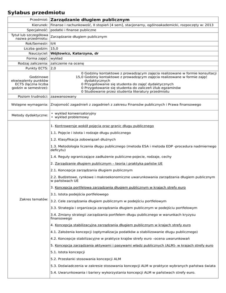 Sylabus przedmiotu Przedmiot: Zarządzanie długiem publicznym Kierunek: Finanse i rachunkowość, II stopień [4 sem], stacjonarny, ogólnoakademicki, rozpoczęty w: 2013 Specjalność: podatki i finanse publiczne Tytuł lub szczegółowa Zarządzanie długiem publicznym nazwa przedmiotu: Rok/Semestr: II/4 Liczba godzin: 15,0 Nauczyciel: Wójtowicz, Katarzyna, dr Forma zajęć: wykład Rodzaj zaliczenia: zaliczenie na ocenę Punkty ECTS: 2,0 Godzinowe ekwiwalenty punktów ECTS (łączna liczba godzin w semestrze): 0 Godziny kontaktowe z prowadzącym zajęcia realizowane w formie konsultacji 15,0 Godziny kontaktowe z prowadzącym zajęcia realizowane w formie zajęć dydaktycznych 0 Przygotowanie się studenta do zajęć dydaktycznych 0 Przygotowanie się studenta do zaliczeń i/lub egzaminów 0 Studiowanie przez studenta literatury przedmiotu Poziom trudności: zaawansowany Wstępne wymagania: Znajomość zagadnień z zagadnień z zakresu Finansów publicznych i Prawa finansowego Metody dydaktyczne: • wykład konwersatoryjny • wykład problemowy 1. Kontrowersje wokół pojęcia oraz granic długu publicznego 1.1. Pojęcie i istota i rodzaje długu publicznego 1.2. Klasyfikacja zobowiązań dłużnych 1.3. Metodologia liczenia długu publicznego (metoda ESA i metoda EDP -procedura nadmiernego deficytu) 1.4. Reguły ograniczające zadłużenie publiczne-pojecie, rodzaje, cechy 2. Zarządzanie długiem publicznym – teoria i praktyka państw UE 2.1. Koncepcje zarządzania długiem publicznym 2.2. Budżetowe, rynkowe i makroekonomiczne uwarunkowania zarządzania długiem publicznym w państwach UE 3. Koncepcja portfelowa zarządzania długiem publicznym w krajach strefy euro 3.1. Istota podejścia portfelowego Zakres tematów: 3.2. Cele zarządzania długiem publicznym w podejściu portfelowym 3.3. Strategia i organizacja zarządzania długiem publicznym w podejściu portfelowym 3.4. Zmiany strategii zarządzania portfelem długu publicznego w warunkach kryzysu finansowego 4. Koncepcja stabilizacyjna zarządzania długiem publicznym w krajach strefy euro 4.1. Założenia koncepcji (optymalizacja podatków a stabilizowanie długu publicznego) 4.2. Koncepcje stabilizacyjne w praktyce krajów strefy euro –ocena uwarunkowań 5. Koncepcja zarządzania aktywami i pasywami władz publicznych (ALM)- w krajach strefy euro 5.1. Istota koncepcji 5.2. Przesłanki stosowania koncepcji ALM 5.3. Doświadczenia w zakresie stosowania koncepcji ALM w praktyce wybranych państwa świata 5.4. Uwarunkowania i bariery wykorzystania koncepcji ALM w państwach strefy euro. Forma oceniania: • egzamin pisemny Warunki zaliczenia: egzamin pisemny K. Marchewka –Bartkowiak, Zarządzanie długiem publicznym, Wydawnictwo PWN, Warszawa 2008 K. Marchewka –Bartkowiak, Zarządzanie długiem publicznym : teoria i praktyka państw Unii Europejskiej, Warszawa 2008 K. Marchewka –Bartkowiak, Zarządzanie długiem Skarbu Państwa : implikacje dla strefy euro, Literatura: Warszawa 2011. Jajko B., Dług publiczny a równowaga fiskalna, Wyd. CeDeWu, Warszawa 2008. Moździerz A., Nierównowaga finansów publicznych, PWE, Warszawa, 2008. Uryszek T., Dług Skarbu Państwa jako żródło finansowania deficytu budżetowego, Wyd. Difin, Warszawa 2010