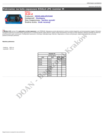 Informacje o produkcie Utworzono 09-03-2017 Pokrowiec na koło zapasowe KOALA LPG rozmiar M Cena : 39,00 zł Producent : KEGEL&BŁAŻUSIAK Dostępność : Dostępny Stan magazynowy : bardzo wysoki Średnia ocena : brak recenzji ra kó w KOALA LPG rozmiar M to pokrowiec na koło zapasowe z serii PREMIUM. Zabezpiecza przed zabrudzeniem zarówno wnętrze bagażnika, jak też przewożone bagaże. Pokrowiec szczególnie polecany do samochodów wyposażonych w instalację gazową, gdzie zbiornik z gazem został zamontowany we wnęce na koło zapasowe. Świetnie sprawdza się także do przechowywania opon sezonowych. Profesjonalne wykonanie z mocnego, wodoodpornego materiału. Wyposażony w otwory wentylacyjne, zapewniające właściwą cyrkulację powietrza wewnątrz pokrowca. Wymiary pokrowca: K - średnica: 60,0 cm - wysokość: 16,5 cm Rozmiar M R12 R13 135/70 145/70 165/80 155/80 155/60 155/65 -B ag 155/70 155/80 165/55 AN 165/65 O 145/65 145/70 155/65 D R15 165/60 135/70 145/65 145/80 Wygenerowano w programie www.oscGold.com R14 aż n 135/80 145/80 ik i rozmiar opony