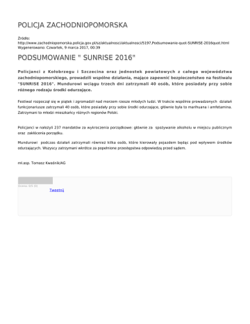 POLICJA ZACHODNIOPOMORSKA Źródło: http://www.zachodniopomorska.policja.gov.pl/sz/aktualnosci/aktualnosci/5197,Podsumowanie-quot-SUNRISE-2016quot.html Wygenerowano: Czwartek, 9 marca 2017, 00:39 PODSUMOWANIE " SUNRISE 2016" Policjanci z Kołobrzegu i Szczecina oraz jednostek powiatowych z całego województwa zachodniopomorskiego, prowadzili wspólne działania, mające zapewnić bezpieczeństwo na festiwalu "SUNRISE 2016". Mundurowi wciągu trzech dni zatrzymali 40 osób, które posiadały przy sobie różnego rodzaju środki odurzające. Festiwal rozpoczął się w piątek i zgromadził nad morzem rzesze młodych ludzi. W trakcie wspólnie prowadzonych działań funkcjonariusze zatrzymali 40 osób, które posiadały przy sobie środki odurzające, głównie była to marihuana i amfetamina. Zatrzymani to młodzi mieszkańcy różnych regionów Polski. Policjanci w nałożyli 237 mandatów za wykroczenia porządkowe: głównie za spożywanie alkoholu w miejscu publicznym oraz zakłócenia porządku. Mundurowi podczas działań zatrzymali również kilka osób, które kierowały pojazdem będąc pod wpływem środków odurzających. Wszyscy zatrzymani wkrótce za popełnione przestępstwa odpowiedzą przed sądem. mł.asp. Tomasz Kwaśnik/AG Ocena: 0/5 (0) Tweetnij