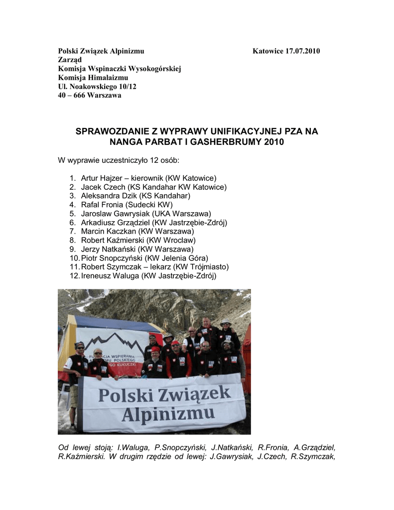 Polski Związek Alpinizmu Zarząd Komisja Wspinaczki Wysokogórskiej Komisja Himalaizmu Ul. Noakowskiego 10/12 40 – 666 Warszawa Katowice 17.07.2010 SPRAWOZDANIE Z WYPRAWY UNIFIKACYJNEJ PZA NA NANGA PARBAT I GASHERBRUMY 2010 W wyprawie uczestniczyło 12 osób: 1. Artur Hajzer – kierownik (KW Katowice) 2. Jacek Czech (KS Kandahar KW Katowice) 3. Aleksandra Dzik (KS Kandahar) 4. Rafal Fronia (Sudecki KW) 5. Jaroslaw Gawrysiak (UKA Warszawa) 6. Arkadiusz Grządziel (KW Jastrzębie-Zdrój) 7. Marcin Kaczkan (KW Warszawa) 8. Robert Kaźmierski (KW Wroclaw) 9. Jerzy Natkański (KW Warszawa) 10. Piotr Snopczyński (KW Jelenia Góra) 11. Robert Szymczak – lekarz (KW Trójmiasto) 12. Ireneusz Waluga (KW Jastrzębie-Zdrój) Od lewej stoją: I.Waluga, P.Snopczyński, J.Natkański, R.Fronia, A.Grządziel, R.Kaźmierski. W drugim rzędzie od lewej: J.Gawrysiak, J.Czech, R.Szymczak, A.Hajzer, M.Kaczkan. W dniu wykonania zdjęcia A.Dzik nie dotarła jeszcze do bazy. Fot.A.Hajzer Przebieg akcji górskiej Wyprawa działała w okresie bardzo wczesnym – bazę pod Nanga Parbat od strony doliny Diamir na wysokosci 4200 m n.p.m. osiągnęła 25 maja (wylot z Polski 19.05), zastając na miejscu grubą pokrywę śniegu. Już następnego dnia osiągnięto i założono obóz pierwszy na wysokości 4800 m n.p.m. Przez cały okres – aż do ataku szczytowego – ekspedycja była jedyną działająca w tym rejonie. Dało to uczestnikom niepowtarzalną okazję do zupełnie samodzielnego poręczowania całej drogi Kinshofera oraz modelowego działania, współpracy i prowadzenia akcji na tej trudnej drodze na własny rachunek. Ekipa wywiązała sie z tego zadania wzorowo. W nieco ponad 20 dni góra byla gotowa do ataku szczytowego, choć konieczne bylo rozpięcie na niej aż 3500 metrow lin poręczowych i założenie cztery obozów: I – 4800 m n.p.m. – 26.05 II – 6000 m n.p.m. – 3.06 III – 6800 m n.p.m. – 13.06 IV – 7150 m n.p.m. – 22.06 Poza tym w trakcie poręczowania spano w obozach (biwakach) tymczasowych: w tzw. wysokiej dwójce na 6450 i niskiej trójce na 6650. Pierwszy atak szczytowy rozpoczął się 19 czerwca. 23 czerwca o 13:30 na szczycie stanęli Artur Hajzer i Robert Szymczak. Uczestniczący w ataku Jarosław Gawrysiak wycofał się do obozu IV z wysokości 7900 m n.p.m. Tak więc szczyt został zdobyty trzydziestego dnia od dojścia do bazy. Atak zabezpieczany był przez pozostających w obozie III - całkowicie z własnej inicjatywy - A. Grządziela i R. Kaźmierskiego (!). Na podejściu z bazy do obozu IV grupa szturmowa korzystała ze wsparcia czteroosobowego (początkowo pięcioosobowego) zespołu wspinającego się w celach aklimatyzacyjnych: A. Dzik, M. Kaczkan, I. Waluga, R. Szymczak. Do obozu III a potem do granicy Bazin na 7000 m wspinało się więc 7 osób. (Grządziel z powodu kaszlu odłączył się od zespołu i został w obozie II)(ostatecznie na wys. 7000 m n.p.m. R. Szymczak przeszedł niespodziewanie do grupy szturmowej, za zgodą kierownika, w której zastąpił on wyziębionego R. Kaźmierskiego)(Przeziębiony R.Fronia wycofał się z grupy szturmowej już w obozie I i wrócił do bazy). 23.06. Robert Szymczak na szczycie Nanga Parbat 8126 m. Fot.A.Hajzer Ze względu na niedostateczną aklimatyzację pozostałych uczestników do atakowania szczytu w tym samym terminie (brak “rekomendacji” kierownika, w domyśle: zakaz) wyprawę przedłużono. Z tej opcji skorzystali Aleksandra Dzik i Marcin Kaczkan, którzy wyszli do ataku z bazy 26 czerwca. 29 czerwca o godzinie 20:00 wyruszyli oni z obozu IV do szturmu na wierzchołek. Niestety, ze względu na częściowe zamglenie i słabą widoczność pomylili kuluary w kopule i zamiast w kierunku szczytu głównego wspięli się w okolice wierzchołka północnego. Zawrócili z wysokości około 7900 z powrotem do obozu IV. W tym nieudanym ataku udział wzięli uczestnicy innej wyprawy- Simone La Terra i Paweł Michalski. Potem, w dniach następnych, Dzik i Kaczkan byli już sami na całej górze. 30 czerwca zespół cały dzień “odpoczywał” w obozie IV. Niestety, zapasy żywności i gazu były niewystarczające. Oboje mogli pić tylko zimną wodę. Obóz IV na płaskowyżu Bazin na wys.7150. Czerwona linia przedstawia drogę do szczytu. Linia niebieska to mylny, ale nowy wariant A.Dzik i M.Kaczkana, kończący się w okolicach wierzchołka północnego. Następnego dnia, 1 lipca o godzinie 20:00 podjęli z obozu IV ponowną próbę zdobycia szczytu. Długie przebywanie na wysokości ponad 7000 metrów nie pozostało jednak bez wpływu na ich kondycję. Aleksandra Dzik z powodu zmęczenia wysokością została zmuszona do odwrotu z wysokości 7250 m n.p.m. Wróciła do obozu IV. Marcin Kaczkan zdobył szczyt samotnie 2 lipca o godzinie 10 rano. Jego powrót ze szczytu był bardzo powolny, utrudniały go: ogólne zmęczenie wysokością i trudności orientacyjne. Obóz IV osiągnął po zmroku około godziny 21:00. Razem z Aleksandrą Dzik dnia następnego zdołali dojść do obozu III w równie późnych godzinach wieczornych. W tym miejscu podkreślenia wymaga chlubna postawa koleżanki Aleksandry Dzik, która nie tylko wyszła ponad obóz IV z napojami zdobywcy na przeciw, ale też wzięła na swoje barki trudy przecierania szlaku zejściowego niemal do samej bazy w dniach następnych, odkopywania obozów, lin, przygotowania posiłków itp. Wyczerpany energetycznie Marcin Kaczkan niewątpliwie bez tej asysty miałby problem z zejściem. 4 lipca zespół wrócił do bazy, gdzie czekali Artur Hajzer i Robert Szymczak, a 5 lipca zakończono ten etap wyprawy i opuszczono bazę. Aleksandra Dzik i Marcin Kaczkan w czasie akcji górskiej. Fot.R.Szymczak Linia czerwona wskazuje przebieg drogi. Linia niebieska przedstawia zmyloną drogę w nieudanym ataku szczytowym przez A.Dzik i M.Kaczkana. Linia zielona do wariant przyjęty przez A.Hajzera i R.Szymczka podczas zejścia. Trójkąty czerwone to miejsca założenia o