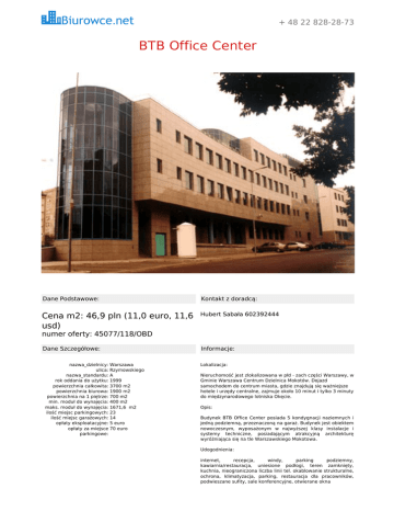 + 48 22 828-28-73 BTB Office Center Dane Podstawowe: Kontakt z doradcą: Cena m2: 46,9 pln (11,0 euro, 11,6 usd) Hubert Sabała 602392444 numer oferty: 45077/118/OBD Dane Szczegółowe: nazwa_dzielnicy: Warszawa ulica: Rzymowskiego nazwa_standardu: A rok oddania do użytku: 1999 powierzchnia całkowita: 3700 m2 powierzchnia biurowa: 1900 m2 powierzchnia na 1 piętrze: 700 m2 min. moduł do wynajęcia: 400 m2 maks. moduł do wynajęcia: 1671,6 m2 ilość miejsc parkingowych: 23 ilość miejsc garażowych: 14 opłaty eksploatacyjne: 5 euro opłaty za miejsce 70 euro parkingowe: Informacje: Lokalizacja: Nieruchomość jest zlokalizowana w płd - zach części Warszawy, w Gminie Warszawa Centrum Dzielnica Mokotów. Dojazd samochodem do centrum miasta, gdzie znajdują się ważniejsze hotele i urzędy centralne, zajmuje około 10 minut i tylko 3 minuty do międzynarodowego lotniska Okęcie. Opis: Budynek BTB Office Center posiada 5 kondygnacji naziemnych i jedną podziemną, przeznaczoną na garaż. Budynek jest obiektem nowoczesnym, wyposażonym w najwyższej klasy instalacje i systemy techniczne, posiadającym atrakcyjną architekturę wyróżniająca się na tle Warszawskiego Mokotowa. Udogodnienia: internet, recepcja, windy, parking podziemny, kawiarnia/restauracja, uniesione podłogi, teren zamknięty, kuchnia, nieograniczona liczba linii tel. okablowanie strukturalne, ochrona, klimatyzacja, parking, restauracja dla pracowników, podwieszane sufity, sale konferencyjne, otwierane okna Przedmiot najmu: Pow. biurowa: 400 m2 - pow. biurowo-wystawiennicza 2. piętro: 781,60 m2 - pow. biurowa 3. piętro: 490 m2 - pow. biurowa 14 miejsc garażowych zlokalizowanych wewnątrz budynku na poziomie -1. 23 miejsca parkingowe na parkingu przy budynku od strony ul. Orzyckiej. Czynsz: 11 EUR za każdy m2 wynajmowanej pow. biurowej 17 EUR za każdy biurowo-wystawienniczej m2 wynajmowanej pow. 70 EUR za miejsce garażowe 40 EUR za miejsce parkingowe Opłaty ponoszone przez Najemcę bezpośrednio: energia elektryczna, woda, ścieki - na podst. odczytów liczników z uwzględnieniem opłat stałych, koszty IT, telefony. Opłaty eksploatacyjne: zaliczka w kwocie 5 EURO za każdy m2 pow. najmu miesięcznie +VAT.Rozliczenie opłat eksploatacyjnych w systemie Triple Net, w okresach półrocznych, na zasadzie otwartych ksiąg. Dostępność: Oferta na życzenie biurowce.net Adres:ul. Konduktorska 4 lok. 30, Warszawa, [email protected]