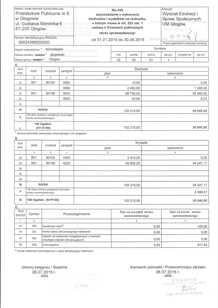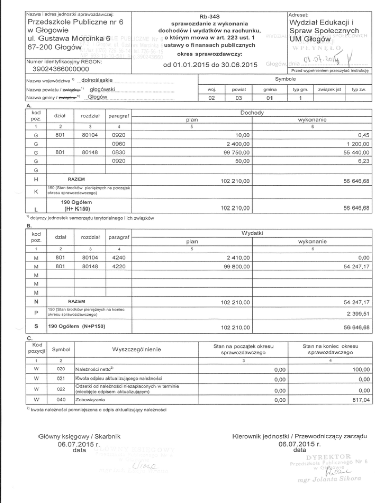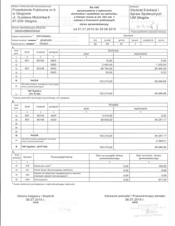 Nazwa i adres jednostki sprawozdawczej: Rb-345 sprawozdanie z wykonania dochodów i wydatków na rachunku, o którym mowa W art' 223 ust. 1 ustawy o finansach publicznych Przedszkole Publiczne nr 6 w Gtogowie ul. Gustawa Morcinka 6 67-200 Głogów ,/ ti r\ r-t,\ okres sprawozdawczy: Numer identyfikacyjny REGON: od 01.01 .2015 do 30.06.20'15 39024366000000 Nazwa Wydział Edukacji i Spraw Społecznych UM GłogÓw Nazwa gminy / Y Przed wypełnieniem przeczytać instrukcję Symbole województwa') do|noś|.ąskie Nazwa powlatu ,t =*łqFkł+1) słas'aw$K!..,.. zwiq3krr.) ...Qł9ggw... / . ''..'.'..' wo.l. powiat gmrna 02 03 01 związek jst ryp gm. ryp zw. A. kod poz. dział rozdzial paragraf 2 3 4 801 801 04 0920 80148 801 wvkonanie 5 6 0,45 10,00 0960 2 400,00 1 200,00 0830 99 750,00 55 440,00 0920 50,00 o,zr 102 210,00 56 646,68 102210,00 56 646.68 RAZEM H 150 (stan środkóW pieniężnych na początek okrBsu sprawozdawczego) K 190 ogółem (H+ K150) L r) Dochody plan dotyczy jednostek samoządu terytoria|nego i ich związków B. kod poz. 1 dziatt rozdział 2 3 paragraf Wydatki plan wykonanie 5 6 M 801 801 04 4240 2 410,00 0,00 M 801 80'148 4220 99 800,00 54 247,17 102210,00 54 247,17 M M M RAZEM N P 150 (Stan środkóW pieniężnych na koniec )kresu sprawozdawczego) s 190 ogółem (N+P150) 2 399,51 56 646,68 102 210,00 c. Kod pozycji Wyszczegolnienie Symbol Stan na koniec okresu sprawozdawczego Stan na początek okresu sprawozoawczego 2 1 2)kwota 020 '.lależnościnetto2) 0,00 100,00 o21 (wota odpisu aktualizującego naIeżności 0,00 0,00 o22 f,dsetki od naIeżnościniezapłaconych w terminie ]nieobięte odpisem aktualizuiącym) 0,00 0,00 040 Zobowiązania 0,00 817,04 naleznoŚci pomniejszona o odpis aktua|izujący na|ezności Główny księgowy / 06.07.2015 data Skarbnik r. Kierownik jednostki / Przewodniczący zarządu 06.07.2015 data r. (ł,.,,,,'-*