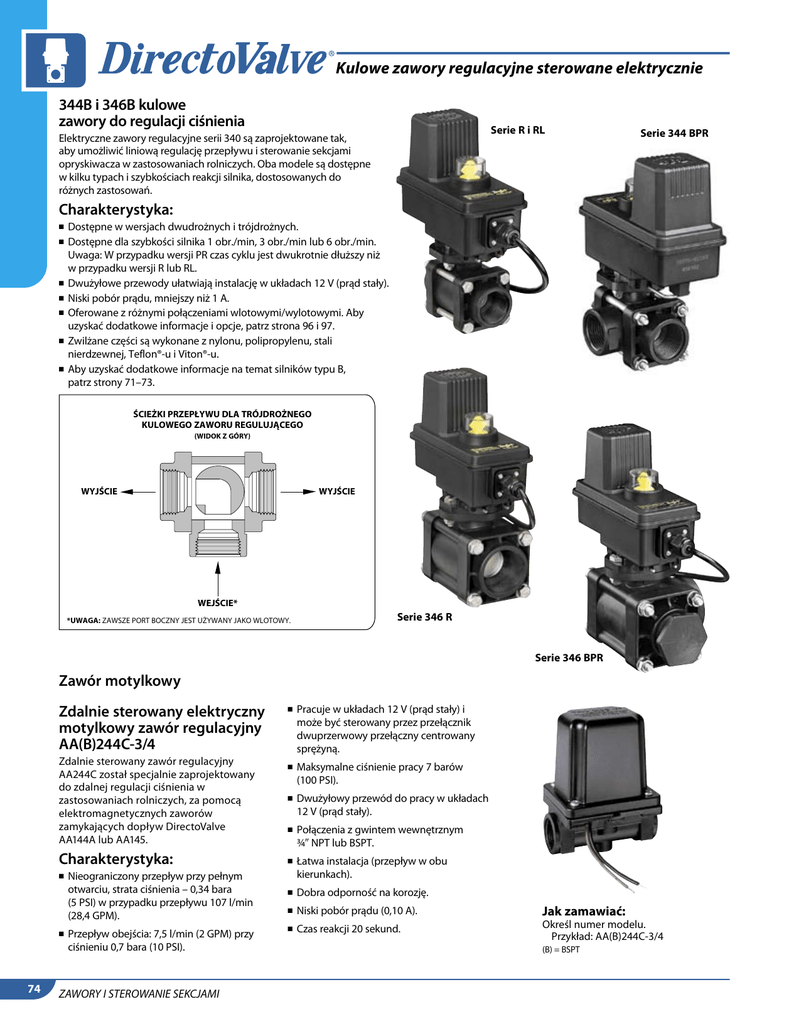 Kulowe zawory regulacyjne sterowane elektrycznie 344B i 346B kulowe zawory do regulacji ciśnienia Serie R i RL Elektryczne zawory regulacyjne serii 340 są zaprojektowane tak, aby umożliwić liniową regulację przepływu i sterowanie sekcjami opryskiwacza w zastosowaniach rolniczych. Oba modele są dostępne w kilku typach i szybkościach reakcji silnika, dostosowanych do różnych zastosowań. Serie 344 BPR Charakterystyka: Dostępne w wersjach dwudrożnych i trójdrożnych. Dostępne dla szybkości silnika 1 obr./min, 3 obr./min lub 6 obr./min. Uwaga: W przypadku wersji PR czas cyklu jest dwukrotnie dłuższy niż w przypadku wersji R lub RL. n Dwużyłowe przewody ułatwiają instalację w układach 12 V (prąd stały). n Niski pobór prądu, mniejszy niż 1 A. n Oferowane z różnymi połączeniami wlotowymi/wylotowymi. Aby uzyskać dodatkowe informacje i opcje, patrz strona 96 i 97. n Zwilżane części są wykonane z nylonu, polipropylenu, stali nierdzewnej, Teflon®-u i Viton®-u. n Aby uzyskać dodatkowe informacje na temat silników typu B, patrz strony 71–73. n n ŚCIEŻKI PRZEPŁYWU DLA TRÓJDROŻNEGO KULOWEGO ZAWORU REGULUJĄCEGO (WIDOK Z GÓRY) WYJŚCIE WYJŚCIE WEJŚCIE* Serie 346 R *UWAGA: ZAWSZE PORT BOCZNY JEST UŻYWANY JAKO WLOTOWY. Serie 346 BPR Zawór motylkowy Zdalnie sterowany elektryczny motylkowy zawór regulacyjny AA(B)244C-3/4 Zdalnie sterowany zawór regulacyjny AA244C został specjalnie zaprojektowany do zdalnej regulacji ciśnienia w zastosowaniach rolniczych, za pomocą elektromagnetycznych zaworów zamykających dopływ DirectoValve AA144A lub AA145. Charakterystyka: Nieograniczony przepływ przy pełnym otwarciu, strata ciśnienia – 0,34 bara (5 PSI) w przypadku przepływu 107 l/min (28,4 GPM). n Przepływ obejścia: 7,5 l/min (2 GPM) przy ciśnieniu 0,7 bara (10 PSI). n 74 ZAWORY I STEROWANIE SEKCJAMI Pracuje w układach 12 V (prąd stały) i może być sterowany przez przełącznik dwuprzerwowy przełączny centrowany sprężyną. n Maksymalne ciśnienie pracy 7 barów (100 PSI). n Dwużyłowy przewód do pracy w układach 12 V (prąd stały). n Połączenia z gwintem wewnętrznym ¾9 NPT lub BSPT. n Łatwa instalacja (przepływ w obu kierunkach). n Dobra odporność na korozję. n Niski pobór prądu (0,10 A). n Czas reakcji 20 sekund. n Jak zamawiać: Określ numer modelu. Przykład: AA(B)244C-3/4 (B) = BSPT