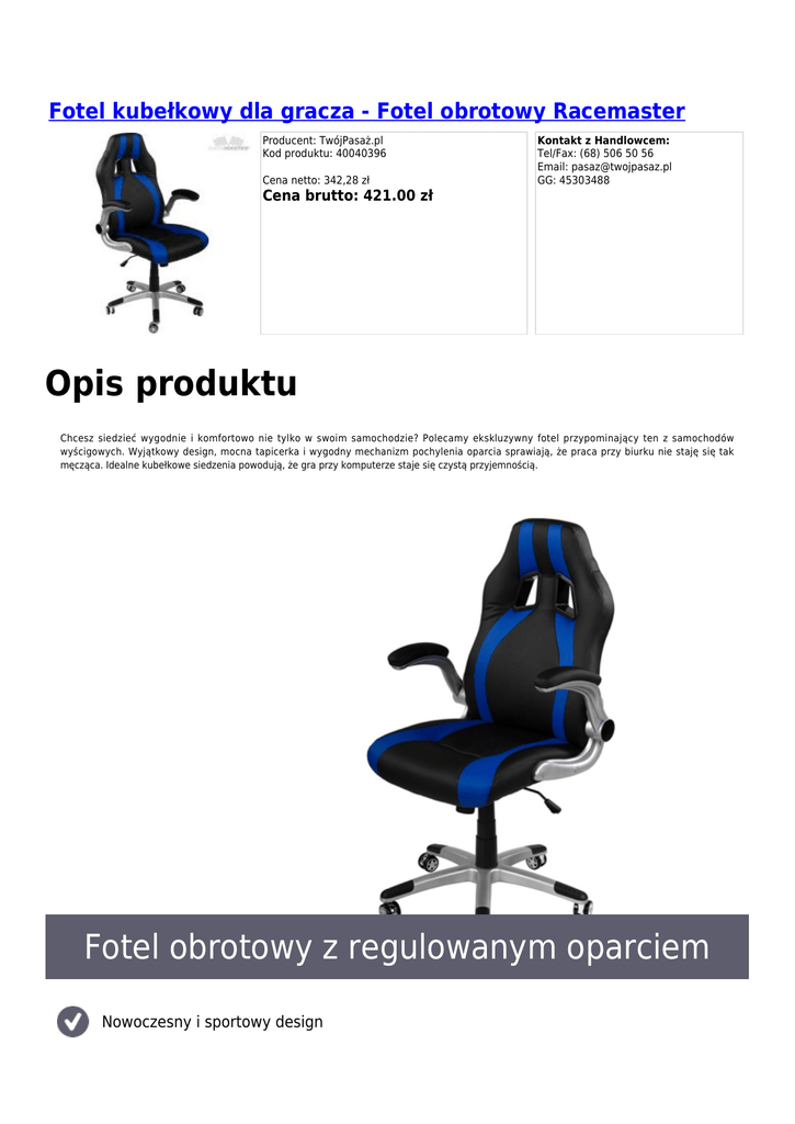 Fotel kubełkowy dla gracza - Fotel obrotowy Racemaster Producent: TwójPasaż.pl Kod produktu: 40040396 Cena netto: 342,28 zł Kontakt z Handlowcem: Tel/Fax: (68) 506 50 56 Email: [email protected] GG: 45303488 Cena brutto: 421.00 zł Opis produktu Chcesz siedzieć wygodnie i komfortowo nie tylko w swoim samochodzie? Polecamy ekskluzywny fotel przypominający ten z samochodów wyścigowych. Wyjątkowy design, mocna tapicerka i wygodny mechanizm pochylenia oparcia sprawiają, że praca przy biurku nie staję się tak męcząca. Idealne kubełkowe siedzenia powodują, że gra przy komputerze staje się czystą przyjemnością. Fotel obrotowy z regulowanym oparciem Nowoczesny i sportowy design Stabilna podstawa nylonowa Oparcie z zagłówkiem Bezstopniowa funkcja bujania Wygodne poręcze Główne cechy Wygoda Fotel zaprojektowany jest z myślą o wygodzie. Oparcie ma wyprofilowany zagłówek, a siedzisko lekko wybrzuszone miejsce pod kolanami aby zapewnić odpowidnią pozycję. Materiał Użyta wysokiej jakości skóra ekologiczna zapewnia dobrą wytrzymałość i wygodę nawet po kilku godzinach.Podstawa z nylonu Regulacja Konstrukcja umożliwia bezstopniową regulację pochylania (bujania) oraz bezstopniową pneumatyczną regulację wysokości Wygląd Fotel ma niepowtrzalny wygląd. Stylizowany na siedzeniach kubełkowych w samochodach sportowych sprawia, że każdy będzie chciał w nim usiąść. Galeria: Dane techniczne: Materiał: skóra ekologiczna, szyta po bokach Kolor: niebieski Szerokość siedziska: 52cm Głębokość siedziska: 49cm Wysokość oparcia: 73cm Podkłokietniki: regulowane, z miękkimi nakładkami Oparcie: Zagłówek: Podstawa: Podnóżek: tapicerowane, regulowane, z blokadą mechanizmu przechyłu zintegrowany z oparciem stabilna, w kształcie gwiazdy, wykonana z nylonu w zestawie z kółkami Regulacja wysokości siedzenia: Kod produktu:40040396 ID produktu:167559 40-50cm (certyfikat testu: TÜV Rheinland / LGA) Granos Group sp. z o.o. ul. Sulechowska 4a budynek 45 65-001 Zielona Góra