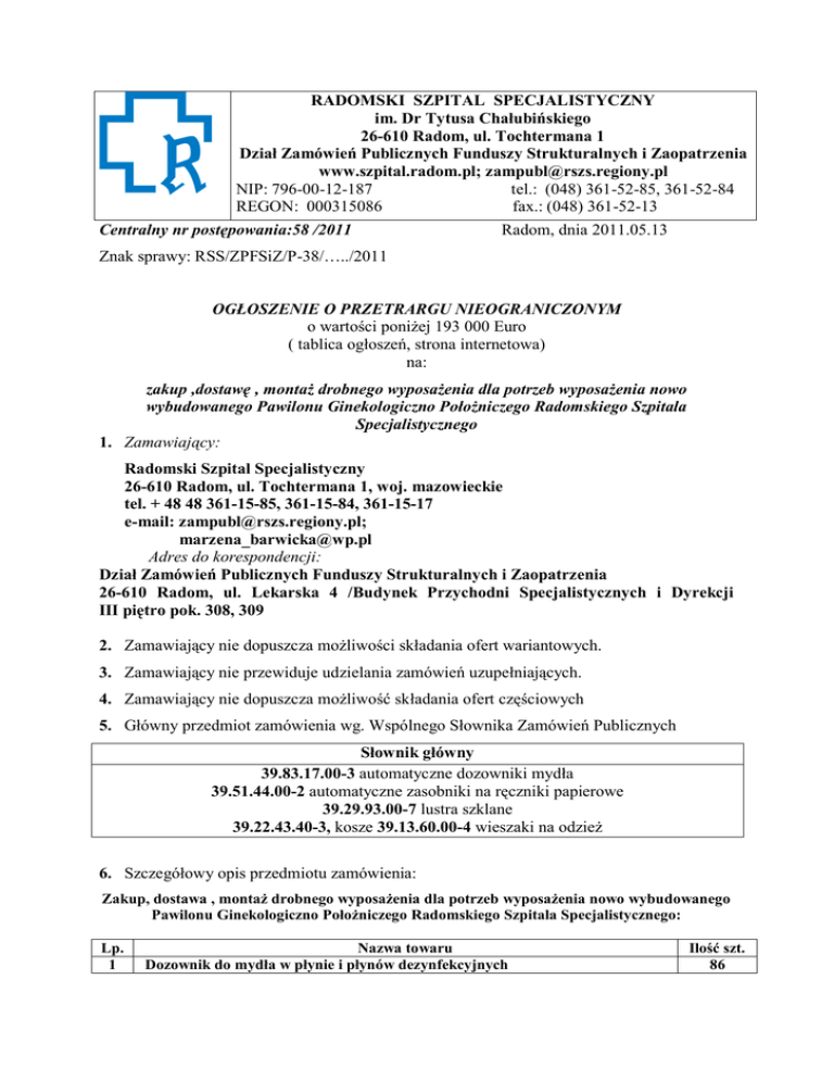RADOMSKI SZPITAL SPECJALISTYCZNY im. Dr Tytusa Chałubińskiego 26-610 Radom, ul. Tochtermana 1 Dział Zamówień Publicznych Funduszy Strukturalnych i Zaopatrzenia www.szpital.radom.pl; [email protected] NIP: 796-00-12-187 tel.: (048) 361-52-85, 361-52-84 REGON: 000315086 fax.: (048) 361-52-13 Centralny nr postępowania:58 /2011 Radom, dnia 2011.05.13 Znak sprawy: RSS/ZPFSiZ/P-38/…../2011 OGŁOSZENIE O PRZETRARGU NIEOGRANICZONYM o wartości poniżej 193 000 Euro ( tablica ogłoszeń, strona internetowa) na: zakup ,dostawę , montaż drobnego wyposażenia dla potrzeb wyposażenia nowo wybudowanego Pawilonu Ginekologiczno Położniczego Radomskiego Szpitala Specjalistycznego 1. Zamawiający: Radomski Szpital Specjalistyczny 26-610 Radom, ul. Tochtermana 1, woj. mazowieckie tel. + 48 48 361-15-85, 361-15-84, 361-15-17 e-mail: [email protected]; [email protected] Adres do korespondencji: Dział Zamówień Publicznych Funduszy Strukturalnych i Zaopatrzenia 26-610 Radom, ul. Lekarska 4 /Budynek Przychodni Specjalistycznych i Dyrekcji III piętro pok. 308, 309 2. Zamawiający nie dopuszcza możliwości składania ofert wariantowych. 3. Zamawiający nie przewiduje udzielania zamówień uzupełniających. 4. Zamawiający nie dopuszcza możliwość składania ofert częściowych 5. Główny przedmiot zamówienia wg. Wspólnego Słownika Zamówień Publicznych Słownik główny 39.83.17.00-3 automatyczne dozowniki mydła 39.51.44.00-2 automatyczne zasobniki na ręczniki papierowe 39.29.93.00-7 lustra szklane 39.22.43.40-3, kosze 39.13.60.00-4 wieszaki na odzież 6. Szczegółowy opis przedmiotu zamówienia: Zakup, dostawa , montaż drobnego wyposażenia dla potrzeb wyposażenia nowo wybudowanego Pawilonu Ginekologiczno Położniczego Radomskiego Szpitala Specjalistycznego: Lp. 1 Nazwa towaru Dozownik do mydła w płynie i płynów dezynfekcyjnych Ilość szt. 86 2 3 4 5 - wraz z dodatkowym wkładem wewnętrznym do wlewania mydła lub płynu - wykonany z tworzywa ABS - z przyciskiem - pojemność zbiornika 500 -800ml - na mydło uzupełniane z kanistra - zamykany na kluczyk - okienko do kontroli poziomu mydła - możliwość mycia i dezynfekcji wewnętrznego pojemnika na mydło i płyn Dystrybutor mydła w płynie pod prysznic : pojem,170 ml kolor biały zamykany na kluczyk Dozownik na mydło w płynie i płyny dezynfekcyjne łokciowy - podajnik do chirurgicznego mycia rąk - wykonany ze stali kwasoodpornej - pojemność zbiornika 1000 ml - płyny uzupełniane z kanistra -mechanizm dozujący wykonany ze stali kwasoodpornej, - łatwy w demontażu - możliwość pełnej sterylizacji - do wszystkich rodzajów płynów dezynfekcyjnych i mydła w płynie - uruchamiany przyciskiem łokciowym Dozownik płynów dezynfekcyjnych : a) uruchamiany przyciskiem łokciowym - wykonany z tworzywa ABS - pojemność zbiornika 500 -800ml - płyny uzupełniane z kanistra - zamykany na kluczyk - okienko do kontroli poziomu mydła - kolor biały b) podajnik do chirurgicznego mycia rąk - wykonany ze stali kwasoodpornej - pojemność zbiornika 500 ml - płyny uzupełniane z kanistra -mechanizm dozujący wykonany ze stali kwasoodpornej, - łatwy w demontażu - możliwość pełnej sterylizacji - do wszystkich rodzajów płynów dezynfekcyjnych i mydła w płynie - uruchamiany przyciskiem łokciowym Dozownik mydła w płynie : a) uruchamiany przyciskiem łokciowym - wykonany z tworzywa ABS - pojemność zbiornika 500 -800ml - na mydło uzupełniane z kanistra - zamykany na kluczyk - okienko do kontroli poziomu mydła - kolor biały b) podajnik do chirurgicznego mycia rąk - wykonany ze stali kwasoodpornej - pojemność zbiornika 500 ml - płyny uzupełniane z kanistra 3 12 80 4 86 4 6 7 8 -mechanizm dozujący wykonany ze stali kwasoodpornej, - łatwy w demontażu - możliwość pełnej sterylizacji - do wszystkich rodzajów płynów dezynfekcyjnych i mydła w płynie - uruchamiany przyciskiem łokciowym Pojemnik na jednorazowe ręczniki składane - wykonany z tworzywa ABS - pojemność do 250 szt. ręczników - zamykany na kluczyk - okienko do kontroli ilości ręczników Podajnik ręczników papierowych składanych - wykonany ze stali kwasoodpornej -pojem.500 szt. ręczników: - zamykany na kluczyk Pojemnik na ręczniki jednorazowe - do rączników na rolce - ręcznik na rolce o rozm.wys.20cm, średnica 20 cm - sposób rozwijania ręcznika – od środka rolki 168 7 4 9 10 Stojak łazienkowy na papier i szczotkę klozetową Lustro nad umywalkę - śruby mocujące (wkręcane do ściany przez lustro) - bez ramy - szlifowane - rozmiar :400mmx600mm 62 114 11 Wieszak ścienny - przykręcany do ściany -srebrny - satynowy - punktowy Wieszak ścienny - przykręcany do ściany -srebrny - satynowy - 2-punktowy Wieszak ścienny - przykręcany do ściany -srebrny - satynowy - 3- punktowy Wieszak ścienny - przykręcany do ściany -srebrny - satynowy - 4- punktowy Wieszak stojący - konstrukcja metalowa chromowana 189 12 13 14 15 7 19 40 1 16 Kosz na odpady otwierany przyciskiem pedałowym - z wkładem - prostokątny - z tworzywa sztucznego , - poj.15 – 16 litrów - kolor biały 198 17 Kosz na odpady otwierany przyciskiem pedałowym, - z wkładem nierdzewnym - prostokątny - z tworzywa sztucznego , - poj.20- 25 litrów - kolor biały 49 18 Kosz na śmieci - stelaż druciany na worek foliowy - pokrywa z tworzywa sztucznego - poj.15-16 litrów - kolor biały 3 19 Kosz na śmieci biurowy 15l - z uchylną pokrywą - z tworzywa sztucznego - poj.15-16 litrów - kolor biały 6 20 Kosz na odpady otwierany przyciskiem pedałowym - ze stali nierdzewnej - z wyjmowanym wkładem - prostokątny - poj.15-20 litrów - kolor biały 23 21 Pojemnik na odpadki - plastikowy - pojemność ok.5 litrów - zdejmowana pokrywa 5 7. Specyfikację istotnych warunków zamówienia można odebrać w siedzibie Zamawiającego przy ul. Lekarskiej 4 w Radomiu (III piętro pok. 308 – Dział Zamówień Publicznych Funduszy Strukturalnych i Zaopatrzenia). Udostępnio