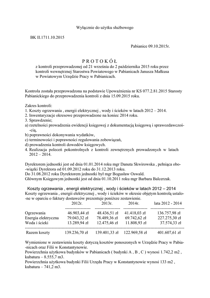 Wyłącznie do użytku służbowego BK II.1711.10.2015 Pabianice 09.10.2015r. PROTOKÓŁ z kontroli przeprowadzonej od 21 września do 2 października 2015 roku przez kontroli wewnętrznej Starostwa Powiatowego w Pabianicach Janusza Małkusa w Powiatowym Urzędzie Pracy w Pabianicach. Kontrola została przeprowadzona na podstawie Upoważnienia nr KS 077.2.81.2015 Starosty Pabianickiego do przeprowadzenia kontroli z dnia 15.09.2015 roku. Zakres kontroli: 1. Koszty ogrzewania , energii elektrycznej , wody i ścieków w latach 2012 – 2014. 2. Inwentaryzacje okresowe przeprowadzone na koniec 2014 roku. 3. Sprawdzenie; a) rzetelności prowadzenia ewidencji księgowej z dokumentacją księgową i sprawozdawczoś-cią, b) poprawności dokonywania wydatków, c) terminowości i poprawności regulowania zobowiązań, d) prowadzenia kontroli dowodów księgowych. 4. Realizacja poleceń pokontrolnych z kontroli zewnętrznych prowadzonych w latach 2012 – 2014. Dyrektorem jednostki jest od dnia 01.01.2014 roku mgr Danuta Skwirowska , pełniąca obo-wiązki Dyrektora od 01.09.2012 roku do 31.12.2013 roku. Do 31.08.2012 roku Dyrektorem jednostki był mgr Bogusław Oswald. Głównym Księgowym jednostki jest od dnia 01.10.2011 roku mgr Barbara Balcerzak. Koszty ogrzewania , energii elektrycznej , wody i ścieków w latach 2012 – 2014 Koszty ogrzewania , energii elektrycznej , wody i ścieków w okresie objętym kontrolą ustalo-ne w oparciu o faktury dostawców prezentuje poniższe zestawienie. 2012r. 2013r. 2014r. lata 2012 - 2014 ------------------ ------------------ ----------------- -----------------------Ogrzewania 46.903,44 zł 48.436,51 zł 41.418,03 zł 136.757,98 zł Energia elektryczna 79.043,32 zł 78.489,36 zł 69.742,62 zł 227.275,30 zł Woda i ścieki 13.289,94 zł 12.475,46 zł 11.808,93 zł 37.574,33 zł ----------------------------------------------------------------------------------------------------------------Razem koszty 139.236,70 zł 139.401,33 zł 122.969,58 zł 401.607,61 zł Wymienione w zestawieniu koszty dotyczą kosztów ponoszonych w Urzędzie Pracy w Pabia-nicach oraz Filii w Konstantynowie. Powierzchnia użytkowa budynków w Pabianicach ( budynki A , B , C ) wynosi 1.742,2 m2 , kubatura – 8.555,7 m3. Powierzchnia użytkowa budynki Filii Urzędu Pracy w Konstantynowie wynosi 133 m2 , kubatura – 741,2 m3. - 2 W kosztach ogrzewania ujęto koszty ogrzewania budynków w Pabianicach , podłączonych do miejskiej sieci ciepłowniczej. W budynku w Konstantynowie funkcjonuje ogrzewanie elektryczne , koszty którego ujęto w pozycji koszty energii elektrycznej. I. Koszty ogrzewania. Zużycie energii cieplnej w budynkach w Pabianach w okresie objętym kontrolą oraz koszty zużytej energii cieplnej , w podziale na koszty stałe zależne od wielkości mocy zamówionej ( opłata za moc zamówioną , opłata przesyłowa stała ) i koszty zmienne zależne od wielkości zużytej energii ( za zużyte ciepło , opłata przesyłowa zmienna ) prezentuje poniższe zestawie-nia. 2012r. 2013r. 2014r. 2012 - 2014 ------------------ ------------------- ------------------- ----------------------Zużycie w GJ 783 GJ 791 GJ 621,83 GJ 2.195,83 GJ Koszty stałe 16.461,24 zł 16.799,79 zł 16.522,32 zł 49.783,35 zł Koszty zmienne 30.442,20 zł 31.636,72 zł 24.895,71 zł 86.974,63 zł --------------------------------------------------------------------------------------------------------------Razem koszty 46.903,44 zł 48.436,51 zł 41.418,03 zł 136.757,98 zł Średni koszt 1 GJ zużytej energii cieplnej: * 2012 rok – 59,90 zł/GJ , w tym; koszty stałe – 21,02 zł/GJ , koszty zmienne – 38,88 zł/GJ, * 2013 rok – 61,23 zł/GJ , w tym; koszty stałe – 21,23 zł/GJ , koszty zmienne – 40,00 zł/GJ, * 2014 rok – 66,61 zł/GJ , w tym; koszty stałe – 26,57 zł/GJ , koszty zmienne – 40,04 zł/GJ. Udział kosztów stałych w kosztach ogółem: * 2012 rok – 35,1%, * 2013 rok – 34,7%, * 2014 rok – 39,9%. Średnioroczne koszty ogrzania 1 m3 kubatury budynków wynosiły: * 2012 rok – 5,48( 0,46zł/miesięcznie ), * 2013 rok – 5,66 zł ( 0,47 zł/miesięcznie ), * 2014 rok – 4,84 zł ( 0,40 zł/miesięcznie ). Dla porównania średnioroczne koszty ogrzewania budynków Starostwa Powiatowego przy ulicy Piłsudskiego o łącznej powierzchni użytkowej 2.427,43 m2 i kubaturze 12.997 m3 wy-nosiły: * 2012 rok – 6,63 zł ( 0,55 zł/miesięcznie ), * 2013 rok – 6,73 zł ( 0,56 zł/miesięcznie ), * 2014 rok – 5,77 zł ( 0,48 zł/miesięcznie ). Ceny netto w okresie objętym kontrolą: W styczniu 2012 roku; * moc zamówiona – 8.144,64 zł/MW, * opłata przesyłowa stała – 1.587,20 zł/MW, * za 1 GJ energii cieplnej – 24,67 zł/GJ, * opłata przesyłowa zmienna – 5,64 zł/GJ. Luty – wrzesień 2012 roku; * moc zamówiona – 8.488,05 zł/MW, * opłata przesyłowa stała – 1.602,30 zł/MW, - 3 * za 1 GJ energii cieplnej – 25,71 zł/GJ, * opłata przesyłowa zmienna – 5,70 zł/GJ. Październik 2012 rok – wrzesień 2013 rok; * moc zamówiona – 8.633,14 zł/MW, * opłata przesyłowa stała – 1.770,05 zł/MW, * za 1 GJ energii cieplnej – 26,23 zł/GJ, * opłata przesyłowa zmienna – 6,33 zł/GJ. Październik 2013 rok – październik 2014 rok; * moc zamówiona – 8.194,55 zł/MW, * opłata przesyłowa stała – 1.984,76 zł/MW, * za 1 GJ energii cieplnej – 25,10 zł/GJ, * opłata przesyłowa zmienna – 7,10 zł/GJ, * opłata za efektywność energetyczną – 0,24 zł/GJ ( opłata występowała tylko w okresie październik 2013r. – październik 2014r. ). Od listopada 2014 roku; * moc zamówiona – 7.876,48 zł/MW, * opłata przesyłowa stała – 2.285,57 zł/MW, * za 1 GJ energii cieplnej – 24,23 zł/GJ, * opłata przesyłowa zmienna – 8,51 zł/GJ. Podatek VAT – 23% w okresie objętym kontrolą. Niższe średnioroczne koszty ogrzewania 1 m3 kubatury budynków Urzędu Pracy w stosunku w analogicznego kosztu ogrzewania budynków Starostwa P