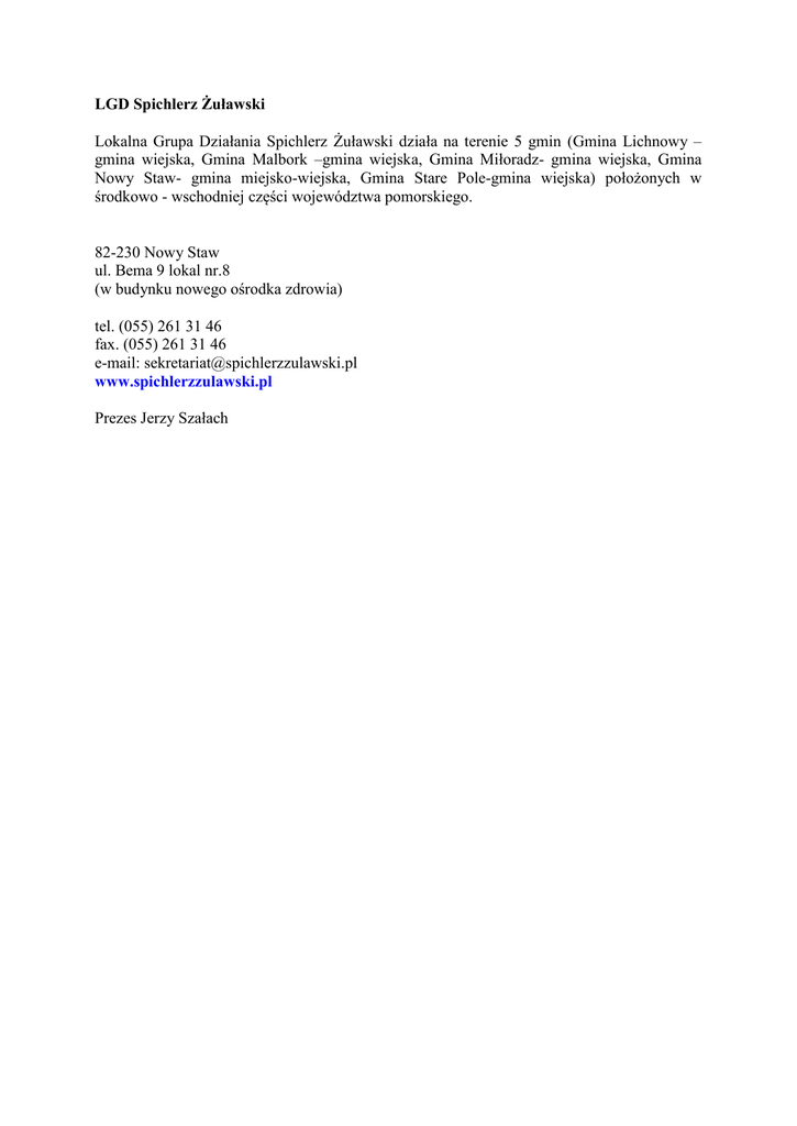 LGD Spichlerz Żuławski Lokalna Grupa Działania Spichlerz Żuławski działa na terenie 5 gmin (Gmina Lichnowy – gmina wiejska, Gmina Malbork –gmina wiejska, Gmina Miłoradz- gmina wiejska, Gmina Nowy Staw- gmina miejsko-wiejska, Gmina Stare Pole-gmina wiejska) położonych w środkowo - wschodniej części województwa pomorskiego. 82-230 Nowy Staw ul. Bema 9 lokal nr.8 (w budynku nowego ośrodka zdrowia) tel. (055) 261 31 46 fax. (055) 261 31 46 e-mail: [email protected] www.spichlerzzulawski.pl Prezes Jerzy Szałach