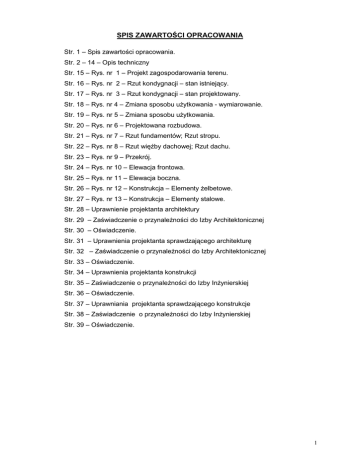 SPIS ZAWARTOŚCI OPRACOWANIA Str. 1 – Spis zawartości opracowania. Str. 2 – 14 – Opis techniczny Str. 15 – Rys. nr 1 – Projekt zagospodarowania terenu. Str. 16 – Rys. nr 2 – Rzut kondygnacji – stan istniejący. Str. 17 – Rys. nr 3 – Rzut kondygnacji – stan projektowany. Str. 18 – Rys. nr 4 – Zmiana sposobu uŜytkowania - wymiarowanie. Str. 19 – Rys. nr 5 – Zmiana sposobu uŜytkowania. Str. 20 – Rys. nr 6 – Projektowana rozbudowa. Str. 21 – Rys. nr 7 – Rzut fundamentów; Rzut stropu. Str. 22 – Rys. nr 8 – Rzut więźby dachowej; Rzut dachu. Str. 23 – Rys. nr 9 – Przekrój. Str. 24 – Rys. nr 10 – Elewacja frontowa. Str. 25 – Rys. nr 11 – Elewacja boczna. Str. 26 – Rys. nr 12 – Konstrukcja – Elementy Ŝelbetowe. Str. 27 – Rys. nr 13 – Konstrukcja – Elementy stalowe. Str. 28 – Uprawnienie projektanta architektury Str. 29 – Zaświadczenie o przynaleŜności do Izby Architektonicznej Str. 30 – Oświadczenie. Str. 31 – Uprawnienia projektanta sprawdzającego architekturę Str. 32 – Zaświadczenie o przynaleŜności do Izby Architektonicznej Str. 33 – Oświadczenie. Str. 34 – Uprawnienia projektanta konstrukcji Str. 35 – Zaświadczenie o przynaleŜności do Izby InŜynierskiej Str. 36 – Oświadczenie. Str. 37 – Uprawniania projektanta sprawdzającego konstrukcje Str. 38 – Zaświadczenie o przynaleŜności do Izby InŜynierskiej Str. 39 – Oświadczenie. 1 OPIS TECHNICZNY I Projekt zagospodarowania działki. 1. Przedmiot inwestycji. 2. Stan istniejący. 3. Projektowane zagospodarowanie. 4. Zestawienie powierzchni – bilans terenu. 5. Inne dane o działce. II Projekt architektoniczno – budowlany. 1. Przeznaczenie i program uŜytkowy. 2. Rozwiązania architektoniczno – budowlane. 3. Zestawienie powierzchni pomieszczeń. 4. Ekspertyza stanu technicznego budynku. 5. Układ i rozwiązania konstrukcyjne. 6. Technologia funkcjonowania. CZĘŚĆ RYSUNKOWA Rys. nr 1 – Projekt zagospodarowania terenu. skala 1 : 200 Rys. nr 2 – Rzut kondygnacji – stan istniejący. skala 1 : 100 Rys. nr 3 – Rzut kondygnacji – stan projektowany. skala 1 : 100 Rys. nr 4 – Zmiana sposobu uŜytkowania - wymiarowanie. skala 1 : 50 Rys. nr 5 – Zmiana sposobu uŜytkowania. skala 1 : 50 Rys. nr 6 – Projektowana rozbudowa. skala 1 : 50 Rys. nr 7 – Rzut fundamentów; Rzut stropu. skala 1 : 50 Rys. nr 8 – Rzut więźby dachowej; Rzut dachu. skala 1 : 50 Rys. nr 9 – Przekrój. skala 1 : 50 Rys. nr 10 – Elewacja frontowa. skala 1 : 50 Rys. nr 11 – Elewacja boczna. skala 1 : 50 Rys. nr 12 – Konstrukcja – Elementy Ŝelbetowe. skala 1 : 20 Rys. nr 13 – Konstrukcja – Elementy stalowe. skala 1 : 20 2 I Projekt zagospodarowania działki. 1. Przedmiot inwestycji. Przedmiotem niniejszego opracowania jest rozbudowa i przebudowa budynku Zespołu Szkół Elektroniczno – Telekomunikacyjnych w Lesznie przy ul. Jana Kilińskiego 4 ( działka nr ewid. gruntów 44/2, 38/1 i 39/2 ) arkusz mapy 4. 2. Stan istniejący. Działka jest w stanie zabudowanym. 3. Projektowane zagospodarowanie. W istniejącym budynku szkolnym projektuje się prowadzenie prac mających polepszyć warunki funkcjonowania szkoły i dostosowanie do nowych potrzeb. Projektuje się rozbudowę budynku o pomieszczenie świetlicy, biura księgowości i pomieszczenia sanitarne. Projektowana rozbudowa będzie przylegała bezpośrednio do istniejącego budynku szkoły. Obecne pomieszczenia warsztatowe ( spawalnia) nie będące wykorzystywane do celów dydaktycznych – zostaną wyburzone – ze względu na zły stan techniczny. Pawilon znajdujący się przy granicy działki – zostanie rozebrany, a w jego miejscu zostanie wprowadzona zieleń oraz utwardzenie terenu. Rozbudowę zaprojektowano jako przedłuŜenie istniejącego obiektu. Zachowano istniejącą linię zabudowy z istniejącym obiektem szkoły – mimo, Ŝe zlokalizowany jest 8,0 m od granicy z terenami kolejowymi. Uzasadnieniem takiej lokalizacji jest konieczność połączenia komunikacyjnego i funkcjonalnego z istniejącą częścią budynku. Dodatkowo wizualnie uzyskuje się jednolitą bryłę obiektu, którą moŜna traktować jako zwartą całość. Lokalizacja taka jest nie tylko dogodna ze względu na funkcjonowanie obiektu, ale takŜe ze względu na istniejące urządzenia sportowe i plac manewrowy znajdujące się na przedmiotowym terenie. 4. Zestawienie powierzchni – bilans terenu. • • • • • • • • • • Powierzchnia nieruchomości gruntowej: 2 203,0 m² - 100% Powierzchnia istniejącego budynku: 588,0 m² - 26 % Powierzchnia budynku do rozbiórki: 32,0 m² - 1,4% Powierzchnia projektowanej rozbudowy : 100,0 m² - 4,5 % Powierzchnia utwardzona istniejąca: 280,0 m² - 13,2 % Powierzchnia pawilonu do rozbiórki: 210,0 m² - 9 % Powierzchnia utwardzona projektowana: 220,0 m² - 9,9 % Powierzchnia zielona istniejąca: 311,0 m² - 14,6 % Powierzchnia zieleni projektowana: 151,0 m² - 6,8 % Powierzchnia urządzeń sportowych: 311,0 m² - 14,6 % 3 5. Inne dane o działce. Nie posiada dodatkowych ograniczeń wynikających ze stref ochrony i wpływów eksploatacji górniczej lub innych. Na projektowaną rozbudowę oraz przebudowę uzyskano: Decyzja Nr 6/Ip/2011 o lokalizacji celu publicznego z dnia 28.03.2011; sygnatura: AP.6733.4.2011. II Projekt architektoniczno - budowlany. 1. Przeznaczenie i program uŜytkowy obiektu. Projektowana rozbudowa i przebudowa budynku Zespołu Szkół Elektroniczno – Telekomunikacyjnych obowiązujących ma na przepisów i celu norm dostosowanie budowlanych. elementów Rozbudowa obiektu ma na do celu przeniesienie części funkcji z baraków przy szkolnych, które zostaną rozebrane. Prace przy budynku mają równieŜ na celu podniesienie walorów wizualnych i estetycznych obiektu. 2. Rozwiązania architektoniczno – budowlane. Istniejący budynek szkoły projektuje się przystosować do przejęcia funkcji znajdujących się w likwidowanym baraku. R