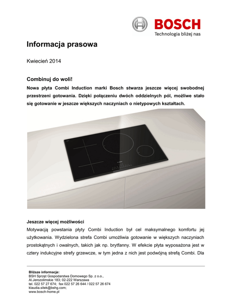 Informacja prasowa Kwiecień 2014 Combinuj do woli! Nowa płyta Combi Induction marki Bosch stwarza jeszcze więcej swobodnej przestrzeni gotowania. Dzięki połączeniu dwóch oddzielnych pól, możliwe stało się gotowanie w jeszcze większych naczyniach o nietypowych kształtach. Jeszcze więcej możliwości Motywacją powstania płyty Combi Induction był cel maksymalnego komfortu jej użytkowania. Wydzielona strefa Combi umożliwia gotowanie w większych naczyniach prostokątnych i owalnych, takich jak np. brytfanny. W efekcie płyta wyposażona jest w cztery indukcyjne strefy grzewcze, w tym jedna z nich jest podwójną strefą Combi. Dla Bliższe informacje: BSH Sprzęt Gospodarstwa Domowego Sp. z o.o., Al.Jerozolimskie 183; 02-222 Warszawa tel. 022 57 27 674; fax 022 57 26 644 / 022 57 26 674 [email protected]; www.bosch-home.pl każdego z pól grzania można zastosować aż 17 poziomów mocy, zaś o ich precyzyjny wybór zadba sterowanie dotykowe DirectSelect. Komfort i wygodę użytkowania wzbogaca także funkcja MoveMode. Uruchamiana jednym dotknięciem zapewnia szybkie zagotowanie potrawy i późniejsze utrzymanie jej w cieple, bez konieczności zmiany ustawień na panelu sterowania. Jak to możliwe? Po zagotowaniu, przesuwając naczynie na pole powyżej, powodujemy automatyczne włączenie tej strefy na pierwszy poziom grzania, podtrzymujący temperaturę. Rozlane mleko? To żaden problem, odkąd płyta została wyposażona w funkcję Krótkiego czyszczenia. Dzięki niej możemy ją wyłączyć, wytrzeć, a po chwili powrócić do gotowania według wcześniej określonych ustawień. Bosch w każdym detalu Z myślą o najmłodszych, płyta została wyposażona także w zabezpieczenie przed uruchomieniem przez dzieci. Płyta indukcyjna Combi Induction PIT851F17E o powerBoost dla stref grzewczych o funkcja MoveMode o sterowanie DirectSelect o wyświetlacz cyfrowy o zabezpiecznie przed uruchomieniem przez dzieci o cena: 2879 zł Więcej informacji na: www.bosch-home.pl Zapraszamy do nowo otwartego Centrum Domowych Inspiracji, znajdującego się w siedzibie firmy BSH Sprzęt Gospodarstwa Domowego przy Al.Jerozolimskich 183 w Warszawie. Salon ekspozycyjny marki Bosch to doskonała okazja do zapoznania się z najnowszą ofertą produktową marki, którą wyróżnia funkcjonalność i jakość w każdym detalu. Więcej informacji nt. Centrum Domowych Inspiracji na stronie http://www.bosch-home.pl/centrum-domowych-inspiracji.html Bliższe informacje: BSH Sprzęt Gospodarstwa Domowego Sp. z o.o., Al.Jerozolimskie 183; 02-222 Warszawa tel. 022 57 27 674; fax 022 57 26 644 / 022 57 26 674 [email protected]; www.bosch-home.pl