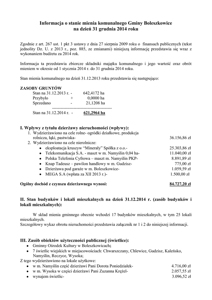 Informacja o stanie mienia komunalnego Gminy Boleszkowice na dzień 31 grudnia 2014 roku Zgodnie z art. 267 ust. 1 pkt 3 ustawy z dnia 27 sierpnia 2009 roku o finansach publicznych (tekst jednolity Dz. U. z 2013 r., poz. 885, ze zmianami) niniejszą informację przedstawia się wraz z wykonaniem budżetu za 2014 rok. Informacja ta przedstawia zbiorcze składniki majątku komunalnego i jego wartość oraz obrót mieniem w okresie od 1 stycznia 2014 r. do 31 grudnia 2014 roku. Stan mienia komunalnego na dzień 31.12.2013 roku przedstawia się następująco: ZASOBY GRUNTÓW Stan na 31.12.2013 r. 642,4172 ha Przybyło + 0,0000 ha Sprzedano 21,1208 ha -----------------------------------------Stan na 31.12.2014 r. 621,2964 ha I. Wpływy z tytułu dzierżawy nieruchomości (wpływy): 1. Wydzierżawiono na cele rolne- ogródki działkowe, produkcja rolnicza, łąki, pastwiska2. Wydzierżawiono na cele nierolnicze: eksploatacja kruszyw “Minerały” Spółka z o.o.Telekomunikacja S.A. - maszt w m. Namyślin 0,04 haPolska Telefonia Cyfrowa – maszt m. Namyślin PKPKnap Tadeusz – pawilon handlowy w m. GudziszDzierżawa pod garaże w m. BoleszkowiceMEGA S.A (wpłata za XII 2013 r.)Ogólny dochód z czynszu dzierżawnego wynosi: 36.156,86 zł 25.303,86 zł 11.040,00 zł 8.891,89 zł 775,00 zł 1.059,59 zł 1.500,00 zł 84.727,20 zł II. Stan budynków i lokali mieszkalnych na dzień 31.12.2014 r. (zasób budynków i lokali mieszkalnych): W skład mienia gminnego obecnie wchodzi 17 budynków mieszkalnych, w tym 25 lokali mieszkalnych. Szczegółowy wykaz obrotu nieruchomości przedstawia załącznik nr 1 i 2 do niniejszej informacji. III. Zasób obiektów użyteczności publicznej (świetlice): Gminny Ośrodek Kultury w Boleszkowicach; 7 świetlic wiejskich w miejscowościach: Chwarszczany, Chlewice, Gudzisz, Kaleńsko, Namyślin, Reczyce, Wysoka; Z tego wydzierżawiono na lokale użytkowe: w m. Namyślin część dzierżawi Pani Dorota Poniedziałek4.716,00 zł w m. Wysoka w części dzierżawi Pani Zuzanna Krężel2.057,55 zł wynajem świetlic3.096,52 zł Wpływy z tytułu w/w najmu wynoszą- 9.870,07 zł IV. Zasób obiektów użyteczności publicznej i technicznej: Gminna Biblioteka Publiczna w m. Boleszkowice i Filia w m. Namyślin; 4 Hydrofornie wraz z siecią wodociągową: w m. Boleszkowice, w m. Chwarszczany, w m. Namyślin i w m. Wysoka; Zespół Szkół w Boleszkowicach: Publiczne Gimnazjum w m. Boleszkowice; Szkoła Podstawowa w m. Boleszkowice; Gminne Przedszkole w m. Boleszkowice; Budynek byłej Szkoły Podstawowej w m. Gudzisz; 4 Remizy strażackie OSP: w m. Boleszkowice, w m. Chwarszczany, w m. Gudzisz i w m. Namyślin; Oczyszczalnia ścieków w m. Boleszkowice; Wysypisko komunalne na odpady stałe o pow. 2,69 ha – nieczynne w m. Boleszkowice; Dom pogrzebowy w m. Boleszkowice; Stadion Sportowy w m. Boleszkowice przy ul. Sportowej; Ośrodek Zdrowia w m. Boleszkowice; 4 Boiska sportowe: w m. Chwarszczany, w m. Gudzisz, w m. Namyślin i w m. Wysoka; 1 Boisko wielofunkcyjne w m. Boleszkowice, przy Szkole Podstawowej; V. Wpływy z tytułu najmu lokali użytkowych: Komenda Wojewódzka Policji w Szczecinie – Posterunek Policji w BoleszkowicachSklep spożywczo-przemysłowy w m. Namyślin (GS Dębno)Niepubliczny Zakład Rehabilitacji i Fizykoterapii („KINEZIS” S.C.)Ośrodek Zdrowia w m. Boleszkowice („Przychodnia Lekarzy Rodzinnych” w Dębnie)Apteka w m. Boleszkowice (Pani Irena Soroczńska - Łuczak)Samodzielny Niepubliczny Zakład Opieki Stomatologicznej Gabinet BoleszkowiceDzierżawa części budynku gospodarczego (Pani Stefania Sadowska)Dzierżawa części garażu (Pan Paweł Skrzypacz)Gospodarczy Bank Spółdzielczy Oddział Dębno (bankomat w Urzędzie Gminy Boleszkowice)E.ON (płata za XII 2013 r.)Łączne dochody z tytułu dzierżaw lokali użytkowych wynoszą- 747,18 zł 8.949,60 zł 1.725,00 zł 11.808,00 zł 7.142,40 zł 5.457,60 zł 195,12 zł 32,52 zł 195,12 zł 1.500,00 zł 37.752,84 zł VI. Wpływy z tytułu spłat ratalnych: Kupno lokali mieszkalnych, nieruchomości niezabudowanych i zabudowanych na ratyw tym odsetki w wysokości 5% od kupna na raty 4.720,38 zł 1.097,12 zł VII. Wpływy za wieczyste użytkowanie gruntów- 2.357,72 zł VIII. Wpływy z tytułu czynszu najmu za lokale mieszkalne i zarząd nieruchomością wspólną- 44.064,36 zł IX. Podsumowanie: Obrót zasobem mienia komunalnego gminy w okresie od 01.01.2013 r. do 31.12.2013 r.: 1. Dzierżawa gruntów na cele rolne2. Dzierżawa gruntów na cele inne niż rolne3. Sprzedaż lokali mieszkalnych i użytkowych4. Sprzedaż nieruchomości gruntowych5. Wpływy z dzierżaw lokali użytkowych i świetlic6. Wpływy z tytułu spłat ratalnych7. Wpływy z tytułu użytkowania wieczystego8. Wpływy z tytułu najmu lokali mieszkalnych i zarząd nieruchomością wspólną- Osiągnięty dochód wynosi: 36.156,86 zł 48.570,34.zł 2.790,37 zł 401.738,00 zł 47.622,91 zł 4.720,38 zł 2.357,72 zł 44.064,36 zł 588.020,94 zł Załącznik Nr 1 do informacji o stanie mienia komunalnego na dzień 31.12.2014 r. Wykaz sprzedanych nieruchomości lokalowych Nabywca Miejscowość 1. Nagrabska Helena 1385/5 o pow. 0,0243 ha Boleszkowice udział 229/1000 1385/6 o pow. 0,0606 ha Udział 352/1000 2. Kalicki Marian Lp. 3. 4. 5. 6. Boleszkowice Pow. lokalu lub budynku w m2 Lokal mieszkalny nr 1 o pow. 65,00 m2 + boks gospodarczy nr 1a i 1b o pow. 59,80 m2 1506/4 o pow. 0,1032 Lokal mieszkalny nr 4 ha o pow. 44,90 m2 + udział 196/1000 boks garażowy nr 5 o pow. 9,50 m2 Drobny Edward 1353/47 o pow. 0,0221 ha Boleszkowice udział 185//1000 1353/48 o pow. 0,0987 ha udział 181/1000 Lokal mieszkalny nr 1 o pow. 61,20 m2 + boks gosp. nr 4 o pow. 27,80 m2 Barczyk Maria 1353/47 o pow. 0,0221 ha Boleszkowice udział 200/1000 1353/48 o pow. 0,0987 ha udział 193/1000 Lokal mieszkalny nr 2 o pow. 65,40 m2 + boks gosp. nr 1 o pow. 16,40 m2 1376/6 o pow. 0,0208 ha Szarszewska Boleszkowice udział 81/1000 Małgorzata 1376/7 o pow. 0,0202 