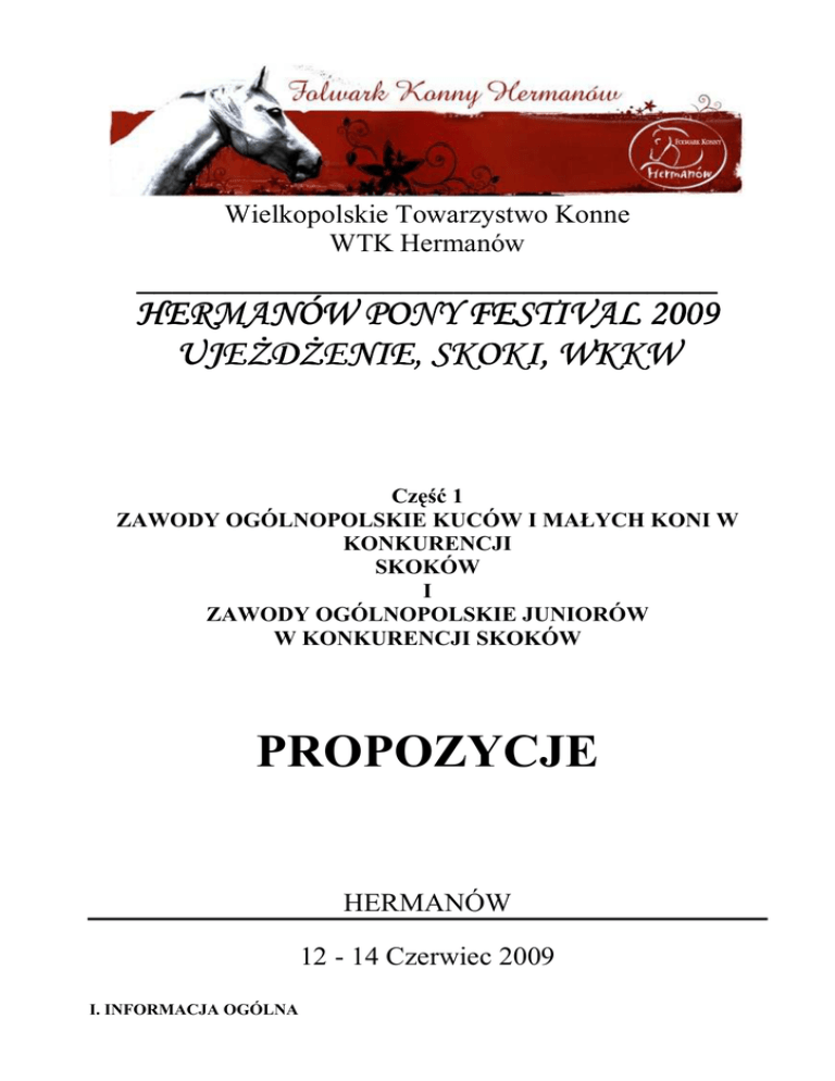 Wielkopolskie Towarzystwo Konne WTK Hermanów _________________________________ H E R M A N Ó W P H N Y F E S T IV A L 2009 UJ E Ż D Ż E N IE , S K H K I, W K K W Część 1 ZAWODY OGÓLNOPOLSKIE KUCÓW I MAŁYCH KONI W KONKURENCJI SKOKÓW I ZAWODY OGÓLNOPOLSKIE JUNIORÓW W KONKURENCJI SKOKÓW PROPOZYCJE HERMANÓW 12 - 14 Czerwiec 2009 I. INFORMACJA OGÓLNA 1.NAZWA ZAWODÓW (Art.103) HERMANÓW PONY FESTIVAL 2009 Zawody Ogólnopolskie Kuców i Małych Koni w Konkurencji Skoków i Zawody Ogólnopolskie Juniorów w Konkurencji Skoków 12-14 Czerwiec 2009, W ramach Hermanów Pony Festival odbywać się również będą 12-14 Czerwiec - Zawody Ogólnopolskie Kuców i Małych Koni w Konkurencji Ujeżdżenie 12-14 Czerwiec - Zawody Regionalne w Konkurencji Ujeżdżenie 11-13 Czerwiec - Zawody Ogólnopolskie Kuców i Małych Koni w Konkurencji WKKW 11-13 Czerwiec - Zawody Regionalne w Konkurencji WKKW DATA : 12-14.06.2009 MIEJSCOWOŚĆ : Hermanów k/Nowego Miasta nad Wartą 2. STOWARZYSZENIE ORGANIZUJĄCE 2.1 Wielkopolskie Towarzystwo Konne Hermanów, tel. 61 287 30 15, 607 42 66 64, 603 20 66 64, fax. 062 740 33 51 www.hermanow.pl, [email protected] 3.KOMITET ORGANIZACYJNY PRZEWODNICZĄCY : SŁAWOMIRA ORŁOWSKA DYREKTOR ZAWODÓW : JAROSŁAW POŁCZYŃSKI II.WARUNKI OGÓLNE Przepisy Ogólne PZJ wydanie 2004 Regulaminem weterynaryjnym PZJ wydanie 2005, Przepisy PZJ konkursów w skokach przez przeszkody wydanie 2006 Regulaminem PZJ kat. Kuców i Małych Koni wydanie 2008 Regulamin PZJ w skokach przez przeszkody wydanie 2009 III.OSOBY URZĘDOWE 3.1.KOMISJA SĘDZIOWSKA Przewodniczący Sędzia PZJ Członkowie : Stanisław Helak : Elżbieta Dąbrowska : Tadeusz Ludwiczak : Włodzimierz Smudziński GOSPODARZ TORU (Art.155, 264.1) : Robert Bartkowiak ASYSTENT GT : Krzysztof Kierzek DELEGAT TECHNICZNY : Marcin Pacyński DELEGAT WETERYNARYJNY (Art.158, 263.2, 1003, 1007) : Michał Borowiński IV.SPECJALNE WARUNKI TECHNICZNE (Art.201.1) Skoki 1 4.1.PRZEBIEG ZAWODÓW: Zawody odbywać się będą na terenie otwartym Plac konkursowy - podłoże trawiaste, wymiary 75x55 Rozprężalnia – podłoże piaszczyste, wymiary 50x25 Plac do stępowania – podłoże piaszczyste, wymiary 40x55 V.ZAPROSZENIA (Art.120, 250, 251.1, 252) 5.1. Zawodnicy posiadający aktualną licencje sportową PZJ VI.OFEROWANE ŚWIADCZENIA (Art.132, 133) 6.1. Zawodnicy, szefowie ekip, trenerzy, luzacy: 6.1 Zakwaterowanie: - na miejscu zawodów - Folwark Konny Hermanów, www.hermanow.pl W sprawie rezerwacji proszę kontaktować się z organizatorem tel. 607 426 664 , 603 20 66 64 e-mail: [email protected] 6.2 Wyżywienie: odpłatnie na terenie ośrodka lub we własnym zakresie Zakwaterowanie Hotel Rosana Klęka +48 61 287 35 80 [email protected] tel.: 5km Hotel MCT Żerków +48 62 740 20 80 [email protected] 7km Motel Dworek Brodowo +48 61 285 16 11 [email protected] 12km Hotel alMarco Środa Wielkopolska +48 61 285 33 33 [email protected] 22km Opłatę za noclegi ponoszą uczestnicy. Podłączenie do prądu – 80zł całe zawody (przyłącza prosimy zgłosić przy zgłoszeniach) 6.2. Konie: Wpisowe: 350,00 zł wraz z boksem. Wpłaty 50% opłaty w terminie do 01.06.2009. W przypadku zgłoszeń późniejszych wzrost opłaty o 50,00zł, płatne do 07.06.2009. Organizator zapewnia pierwszą ściółkę w boksach, paszę należy przywieźć własną. Organizator zastrzega ograniczoną ilość boksów. Boksy będą przygotowane pod warunkiem dokonania za nie wpłaty na konto WTK HERMANÓW, Hermanów 1, 63-040 Nowe Miasto nad Wartą, BZ WBK Środa Wlkp. nr 76 1090 1418 0000 0001 0667 9143 i potwierdzenie wpłaty tel. lub e-mail. Jeżeli wpłata nie zostanie dokonana, lub nie potwierdzona organizator nie zapewnia stajni dla koni. VII.ZGŁOSZENIA (Art.121.2, 121.8.1.2.3) Termin zamknięcia zgłoszeń imiennych - 07.06.2009 Zgłoszenia i potwierdzenia telefoniczne tel. 603 20 66 64, 607 42 66 64, 2 Fax. 062 740 33 51 lub e-mail [email protected] Potwierdzenie zgłoszenia oznacza jego przyjęcie. VIII.ZAGADNIENIA WETERYNARYJNE Art.290, 1004.5, 1005.4.5, 1011, 1022.1 8.1. Lp Funkcja 1. Powiatowy lekarz wet. 2. Lekarz wet. Zawodów Imię i nazwisko Dariusz Karczewski Michał Borowiński Telefon 061 285 34 76 602 106 198 8.2. Szczepienia ochronne przeciwko grypie koni. Obowiązuje następujący schemat szczepień: a. szczepienie podstawowe: • pierwsze szczepienie – w dniu rozpoczęcia szczepień • drugie szczepienie – nie wcześniej niż 21-go dnia i nie później niż 92 dnia od pierwszego szczepienia. b. szczepienie przypominające: • co 6 miesięcy od ostatniego szczepienia (jest dopuszczalny 21 dniowy okres karencji); • żadne szczepienie przypominające nie może się odbyć później niż na 7 dni przed przybyciem na zawody. Opłata na fundusz antydopingowy – 15 zł/kuca – nie dotyczy koni startujących w ZR IX.RÓŻNE 9.1.REKLAMACJE Każda reklamacja, ażeby była ważna, musi być zgłoszona na piśmie z dołączeniem kaucji w równowartości 200 PLN. 9.2.KLASYFIKACJA OGÓLNA a) zawody ZO K i MK, ZOJ - nagrody i puchary dla zwycięzców konkursów - flots dla 25% startujących pony/koni w konkursie. 9.3.UBEZPIECZENIA Komitet Organizacyjny nie ponosi żadnej odpowiedzialności w razie wypadków i zachorowań trenera, zawodników, luzaków i koni, jak również w przypadku kradzieży, zniszczeń, pożarów i innych wydarzeń. Zawodnicy i właściciele odpowiadają osobiście za zniszczenia w stosunku do osób trzecich, spowodowane przez nich samych, ich pracowników lub ich konie. Dlatego zalecane jest zawarcie stosownego pełnego ubezpieczenia na czas udziału w zawodach. 9.4.ORGANIZACJA ZAWODÓW (Art.115.1,2. Reg.Ogólnego) W nadzwyczajnych okolicznościach, nie przewidzianych przepisami, za aprobatą szefów ekip i komisji sędziowskiej, K.O. zastrzega sobie prawo do zmian w propozycjach zawodów. Wszelkie zmiany dokonane w programie po zatwierdzeniu przez PZJ, muszą uzyskać zgodę Sekretarza Generalnego PZJ i należy jak 