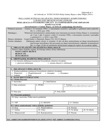 Załącznik nr 1 do Uchwały nr XVIII/134/2016 Rady Gminy Bejsce z dnia 29lipca 2016 r. POLA JASNE WYPEŁNIA WŁAŚCICIEL NIERUCHOMOŚCI, KOMPUTEROWO LUB RĘCZNIE DRUKOWANYMI LITERAMI DEKLARACJA O WYSOKOŚCI OPŁATY ZA GOSPODAROWANIE ODPADAMI KOMUNALNYMI - nieruchomości w Gminie Bejsce, na których zamieszkują mieszkańcy Podstawa prawna: Ustawa z 13 września 1996 r. o utrzymaniu czystości i porządku w gminach (tekst jednolity Dz. U. z 2016, poz. 250) Składający: Właściciel nieruchomości zamieszkałej oraz mieszanej na terenie Gminy Bejsce w rozumieniu art. 2 ust. 1 pkt. 4 ustawy z dnia 13 września 1996r. o utrzymaniu czystości i porządku w gminach (t. j. z 2016 r. poz.250) Miejsce składania: Urząd Gminy w Bejscach, Bejsce 252, 28-512 Bejsce Termin składania Deklarację należy złożyć w terminie 14 dni od dnia zamieszkania na danej nieruchomości pierwszego mieszkańca lub powstania na danej nieruchomości odpadów komunalnych jak i w ciągu 14 dni od zaistnienia okoliczności mających wpływ na wysokość opłaty A. ORGAN WŁAŚCIWY DO ZŁOŻENIA DEKLARACJI Nazwa i adres siedziby organu, do którego należy złożyć deklarację: WÓJT GMINY BEJSCE BEJSCE 252 28-512 BEJSCE B. OBOWIĄZEK ZŁOŻENIA DEKLARACJI 1. Cel złożenia deklaracji (zaznaczyć krzyżykiem właściwy kwadrat) □ pierwsza deklaracja □ zmiana danych w deklaracji C. SKŁADAJĄCY DEKLARACJĘ 2. Rodzaj podmiotu (zaznaczyć krzyżykiem właściwy kwadrat) □ Właściciel □ Współwłaściciel □ Zarządca □ Posiadacz □ Lokator □ Inny D. DANE IDENTYFIKACYJNE D.1. Osoba fizyczna 3. Nazwisko 4. Imię/Imiona 5. Data urodzenia 6. PESEL 7. Telefon (uwaga: składający deklarację może podać numer swojego telefonu dla ułatwienia kontaktu Urzędem Gminy w Bejscach) 8. Imię ojca 9. Imię matki D.2. Pozostałe podmioty 10. Imię i nazwisko/ Pełna nazwa podmiotu 11. NIP 12. REGON D.3. Adres zamieszkania/ Adres siedziby podmiotu 14. Kraj 15. Województwo 17. Gmina 18. Ulica 21. Miejscowość 22. Kod pocztowy 13. Telefon 16. Powiat 19. Nr domu 23. Poczta D.4. ADRES DO KORESPONDENCJI (JEŚLI INNY NIŻ ADRES ZAMIESZKANIA) 20. Nr lokalu 24. E. ADRES NIERUCHOMOŚCI, NA KTÓREJ ZAMIESZKUJĄ MIESZKAŃCY 25. Miejscowość 26. Nr domu/ lokalu 27. Nr działki (jeśli nieruchomość nie ma przydzielonego adresu lub pod tym samym adresem jest więcej niż jedna nieruchomość) F. DANE DOTYCZĄCE PRZEDMIOTU OPŁATY 28. Oświadczam, iż na terenie nieruchomości wskazanej w części E deklaracji prowadzone jest /są ……………… gospodarstwo/gospodarstwa domowe (podać liczbę gospodarstw domowych prowadzonych na terenie nieruchomości) 29. Liczba mieszkańców zamieszkujących nieruchomość ………………. 30. Oświadczam, iż odpady komunalne z nieruchomości zbierane będą w sposób: □ selektywny □ nieselektywny (zmieszany) 31. Oświadczam, że bioodpady będę gromadził w kompostowniku, a uzyskany kompost będę wykorzystywać na własne potrzeby na mojej posesji □ tak □ nie G. OPŁATA ZA GOSPODAROWANIE ODPADAMI KOMUNALNYMI 32. Stawka miesięcznej opłaty za odpady komunalne wynosi: 33. 34. zbierane w sposób selektywny- 15 zł zbierane w sposób zmieszany- 25 zł 35. Miesięczna kwota opłaty brutto (liczba gospodarstw domowych z części F. poz. 28. razy stawka opłaty z części G. poz. 32. lub 33.) 36. ……………zł (wyliczona kwota) H. DANE DODATKOWE Czy deklaracja dotyczy domu letniskowego lub nieruchomości użytkowanej okresowo? (zaznaczyć właściwy kwadrat) □ tak □ nie Jeśli powyżej zaznaczono „tak”, należy podać okres wytwarzania odpadów ( miesiące w ciągu roku kalendarzowego, w których są wytwarzane odpady): od miesiąca …………………………………………. do miesiąca …………………………………………… I. PODPIS OSOBY SKŁADAJĄCEJ DEKLARACJĘ Data Czytelny podpis (z podaniem imienia i nazwiska) POUCZENIE W przypadku nieterminowego uregulowania należności lub wpłacania jej w niepełnej wysokości, niniejsza deklaracja stanowi podstawę do wystawienia tytułu wykonawczego, zgodnie z przepisami ustawy z 17 czerwca 1966 r. o postępowaniu egzekucyjnym w administracji (Dz. U. z 2016 r. poz. 599) ADNOTACJE URZĘDOWE URZĄD GMINY BEJSCE, BEJSCE 252, 28-512 BEJSCE OBJAŚNIENIA DO DEKLARACJI O WYSOKOŚCI OPŁATY ZA GOSPODAROWANIE ODPADAMI KOMUNALNYMI nieruchomości w Gminie Bejsce, na których zamieszkują mieszkańcy Formularz przeznaczony jest dla właścicieli nieruchomości w Gminie Bejsce, na których zamieszkują mieszkańcy, do których ma zastosowanie art. 6c ust. 1 ustawy z dnia 13 września 1996r. o utrzymaniu czystości i porządku w gminach (t. j. z 2016 r. poz. 250) Właścicielem nieruchomości w myśl art. 2 ust. 1 pkt 4 ustawy z dnia 13 września 1996r. o utrzymaniu czystości i porządku w gminach (t. j. z 2016 r. poz. 250) jest także współwłaściciel, użytkownik wieczysty oraz jednostki organizacyjne i osoby posiadające nieruchomości w zarządzie lub użytkowaniu, a także inne podmioty władające nieruchomością. A. Organem właściwym, do którego należy złożyć deklarację jest Wójt Gminy Bejsce. Formularz można złożyć osobiście w Urzędzie Gminy w Bejscach, Bejsce 252, 28-512 Bejsce lub poprzez elektroniczną skrzynką podawczą zamieszczoną w Biuletynie Informacji Publicznej www.bip.gminy.com.pl/bejsce/ B. Zgodnie z art. 6m ustawy z 13 września 1996 r. o utrzymaniu czystości i porządku w gminach właściciel nieruchomości jest obowiązany złożyć do właściwego organu deklarację o wysokości opłaty za gospodarowanie odpadami komunalnymi w terminie 14 dni od dnia zamieszkania na danej nieruchomości pierwszego mieszkańca lub powstania odpadów komunalnych. W przypadku zmiany danych będących podstawą ustalenia wysokości należnej opłaty za gospodarowanie odpadami komunalnymi właściciel nieruchomości jest obowiązany złożyć nową deklarację w terminie 14 dni od dni