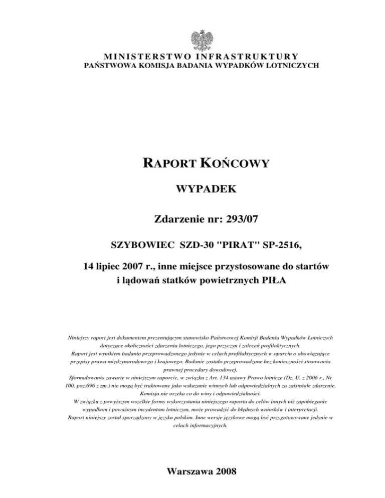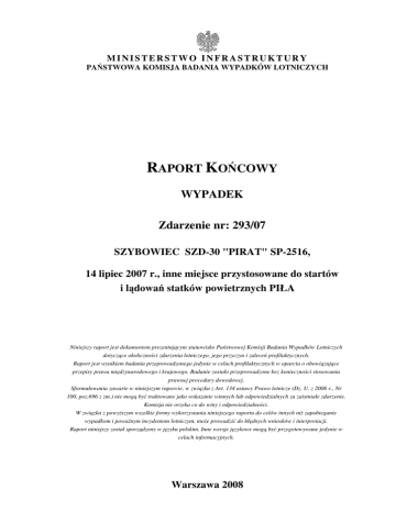 MINISTERSTWO INFRASTRUKTURY PAŃSTWOWA KOMISJA BADANIA WYPADKÓW LOTNICZYCH RAPORT KOŃCOWY WYPADEK Zdarzenie nr: 293/07 SZYBOWIEC SZD-30 "PIRAT" SP-2516, 14 lipiec 2007 r., inne miejsce przystosowane do startów i lądowań statków powietrznych PIŁA Niniejszy raport jest dokumentem prezentującym stanowisko Państwowej Komisji Badania Wypadków Lotniczych dotyczące okoliczności zdarzenia lotniczego, jego przyczyn i zaleceń profilaktycznych. Raport jest wynikiem badania przeprowadzonego jedynie w celach profilaktycznych w oparciu o obowiązujące przepisy prawa międzynarodowego i krajowego. Badanie zostało przeprowadzone bez konieczności stosowania prawnej procedury dowodowej. Sformułowania zawarte w niniejszym raporcie, w związku z Art. 134 ustawy Prawo lotnicze (Dz. U. z 2006 r., Nr 100, poz.696 z zm.) nie mogą być traktowane jako wskazanie winnych lub odpowiedzialnych za zaistniałe zdarzenie. Komisja nie orzeka co do winy i odpowiedzialności. W związku z powyższym wszelkie formy wykorzystania niniejszego raportu do celów innych niż zapobieganie wypadkom i poważnym incydentom lotniczym, może prowadzić do błędnych wniosków i interpretacji. Raport niniejszy został sporządzony w języku polskim. Inne wersje językowe mogą być przygotowywane jedynie w celach informacyjnych. Warszawa 2008 Państwowa Komisja Badania Wypadków Lotniczych Szybowiec SZD-30 "PIRAT" SP-2516, 14 lipiec 2007 r., lądowisko PIŁA ____________________________________________________________________________________ SPIS TREŚCI Informacje ogólne ........................................................................................................................................ 3 Streszczenie ................................................................................................................................................. 3 1. INFORMACJE FAKTYCZNE............................................................................................................ 5 1.1. Historia lotu. ................................................................................................................................. 5 1.2. Obrażenia osób. ............................................................................................................................ 6 1.3. Uszkodzenia statku powietrznego................................................................................................. 6 1.4. Inne uszkodzenia........................................................................................................................... 6 1.5. Informacje o składzie osobowym (dane o załodze). ..................................................................... 6 1.6. Informacje o statku powietrznym. ................................................................................................ 7 1.7. Informacje meteorologiczne. ........................................................................................................ 8 1.8. Pomoce nawigacyjne. ................................................................................................................... 9 1.9. Łączność. ...................................................................................................................................... 9 1.10. Informacje o miejscu zdarzenia. ................................................................................................. 9 1.11. Rejestratory pokładowe. ............................................................................................................. 9 1.12. Informacje o szczątkach i zderzeniu. .......................................................................................... 9 1.13.Informacje medyczne i patologiczne. .......................................................................................... 9 1.14. Pożar. .......................................................................................................................................... 9 1.15. Czynniki przeżycia.................................................................................................................... 10 1.16. Badania i ekspertyzy. ................................................................................................................ 10 1.17. Informacje o organizacjach i działalności administracyjnej. .................................................... 10 1.18. Informacje uzupełniające. ......................................................................................................... 11 1.19. Użyteczne lub efektywne metody badań................................................................................... 11 2. Analiza. .............................................................................................................................................. 11 2.1. Analiza techniczna ...................................................................................................................... 11 2.2. Poziom wyszkolenia ................................................................................................................... 13 2.2. Organizacja i przebieg lotu ......................................................................................................... 17 3. Wnioski końcowe. ............................................................................................................................. 18 3.1. Ustalenia komisji. ....................................................................................................................... 18 3.2. Przyczyny wypadku .................................................................................................................... 19 4. Zalecenia profilaktyczne. ................................................................................................................... 20 5. Załączniki. .......................................................................................................................