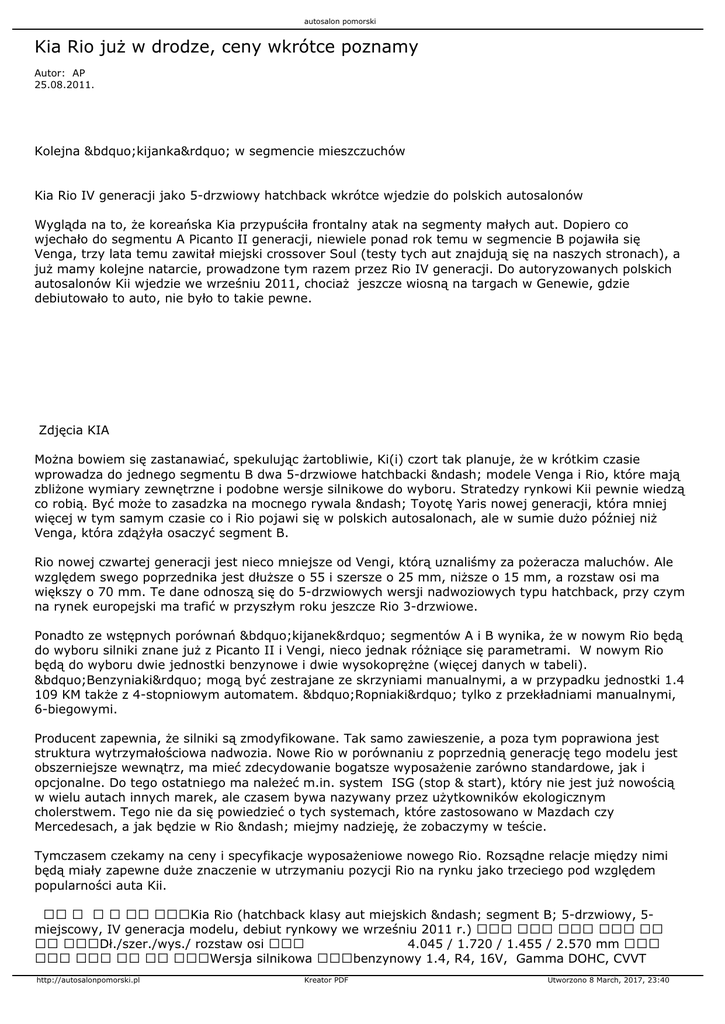 autosalon pomorski Kia Rio już w drodze, ceny wkrótce poznamy Autor: AP 25.08.2011. Kolejna „kijanka” w segmencie mieszczuchów Kia Rio IV generacji jako 5-drzwiowy hatchback wkrótce wjedzie do polskich autosalonów Wygląda na to, że koreańska Kia przypuściła frontalny atak na segmenty małych aut. Dopiero co wjechało do segmentu A Picanto II generacji, niewiele ponad rok temu w segmencie B pojawiła się Venga, trzy lata temu zawitał miejski crossover Soul (testy tych aut znajdują się na naszych stronach), a już mamy kolejne natarcie, prowadzone tym razem przez Rio IV generacji. Do autoryzowanych polskich autosalonów Kii wjedzie we wrześniu 2011, chociaż jeszcze wiosną na targach w Genewie, gdzie debiutowało to auto, nie było to takie pewne. Zdjęcia KIA Można bowiem się zastanawiać, spekulując żartobliwie, Ki(i) czort tak planuje, że w krótkim czasie wprowadza do jednego segmentu B dwa 5-drzwiowe hatchbacki – modele Venga i Rio, które mają zbliżone wymiary zewnętrzne i podobne wersje silnikowe do wyboru. Stratedzy rynkowi Kii pewnie wiedzą co robią. Być może to zasadzka na mocnego rywala – Toyotę Yaris nowej generacji, która mniej więcej w tym samym czasie co i Rio pojawi się w polskich autosalonach, ale w sumie dużo później niż Venga, która zdążyła osaczyć segment B. Rio nowej czwartej generacji jest nieco mniejsze od Vengi, którą uznaliśmy za pożeracza maluchów. Ale względem swego poprzednika jest dłuższe o 55 i szersze o 25 mm, niższe o 15 mm, a rozstaw osi ma większy o 70 mm. Te dane odnoszą się do 5-drzwiowych wersji nadwoziowych typu hatchback, przy czym na rynek europejski ma trafić w przyszłym roku jeszcze Rio 3-drzwiowe. Ponadto ze wstępnych porównań „kijanek” segmentów A i B wynika, że w nowym Rio będą do wyboru silniki znane już z Picanto II i Vengi, nieco jednak różniące się parametrami. W nowym Rio będą do wyboru dwie jednostki benzynowe i dwie wysokoprężne (więcej danych w tabeli). „Benzyniaki” mogą być zestrajane ze skrzyniami manualnymi, a w przypadku jednostki 1.4 109 KM także z 4-stopniowym automatem. „Ropniaki” tylko z przekładniami manualnymi, 6-biegowymi. Producent zapewnia, że silniki są zmodyfikowane. Tak samo zawieszenie, a poza tym poprawiona jest struktura wytrzymałościowa nadwozia. Nowe Rio w porównaniu z poprzednią generację tego modelu jest obszerniejsze wewnątrz, ma mieć zdecydowanie bogatsze wyposażenie zarówno standardowe, jak i opcjonalne. Do tego ostatniego ma należeć m.in. system ISG (stop & start), który nie jest już nowością w wielu autach innych marek, ale czasem bywa nazywany przez użytkowników ekologicznym cholerstwem. Tego nie da się powiedzieć o tych systemach, które zastosowano w Mazdach czy Mercedesach, a jak będzie w Rio – miejmy nadzieję, że zobaczymy w teście. Tymczasem czekamy na ceny i specyfikacje wyposażeniowe nowego Rio. Rozsądne relacje między nimi będą miały zapewne duże znaczenie w utrzymaniu pozycji Rio na rynku jako trzeciego pod względem popularności auta Kii. Kia Rio (hatchback klasy aut miejskich – segment B; 5-drzwiowy, 5miejscowy, IV generacja modelu, debiut rynkowy we wrześniu 2011 r.) Dł./szer./wys./ rozstaw osi 4.045 / 1.720 / 1.455 / 2.570 mm Wersja silnikowa benzynowy 1.4, R4, 16V, Gamma DOHC, CVVT http://autosalonpomorski.pl Kreator PDF Utworzono 8 March, 2017, 23:40 autosalon pomorski benzynowy 1.25, R4, 16V, Kappa DOHC, CVVT wysokoprężny 1.4, R4, 16V, U2 DOHC, VGT wysokoprężny 1.1, R3, 12V, U2, DOHC, VGT Poj. skokowa 1.396 ccm 1.248 ccm 1.396 ccm 1.120 ccm Moc maksymalna 109 KM przy 6.000 obr./min 85 KM przy 6.000 obr./min 90 KM przy 4.000 obr./min 70 KM przy 4.000 obr./min Maks. moment obrotowy 136 Nm przy 4.200 obr./min 118 Nm przy 4.000 obr./min 216 Nm przy 1.750 obr./min 162 Nm przy 1.750 obr./min Przeniesienie napędu na przednie koła Skrzynia biegów manualna 6-biegowa lub automatyczna 4-stopniowa manualna 5-biegowa manualna 6-biegowa Prędkość maksymalna 181 km/h 167 km/h 171 km/h 161 km/h Przyspieszenie 0 – 100 km/h 11,5 s 13,0 s 14,2 s 16,4 s Śr. spalanie – l/100 km* 4,2 (3,8) 4,8 (4,3) 4,1 (3,5) 3,5 (3,2) Pojemności: bagażnika / zb. paliwa 288 / 43 l Rozmiar ogumienia 185/65 R15 (standard), 195/55 R16, 205/45 R17 Zawieszenie z przodu kolumny McPhersona, z tyłu zespolona belka skrętna Układ kierowniczy zębatkowy ze wspomaganiem elektrycznym MDPS (Motor Driven Power Steering) Układ hamulcowy Z przodu tarcze wentylowane, z tyłu tarcze (wersje z ESC) lub bębny (wersje bez ESC) * dane wstępne producenta, w nawiasach wartości dla wersji z opcjonalnym systemem ISG (stop & start) http://autosalonpomorski.pl Kreator PDF Utworzono 8 March, 2017, 23:40