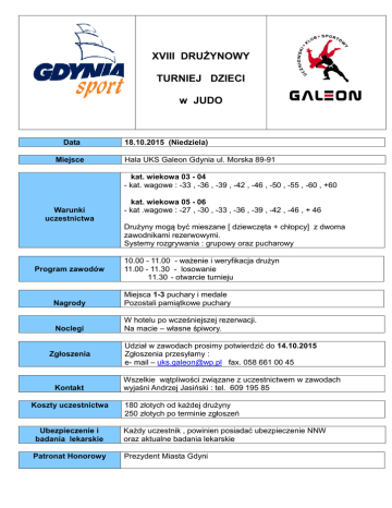 XVIII DRUŻYNOWY TURNIEJ DZIECI w JUDO Data Miejsce 18.10.2015 (Niedziela) Hala UKS Galeon Gdynia ul. Morska 89-91 kat. wiekowa 03 - 04 - kat. wagowe : -33 , -36 , -39 , -42 , -46 , -50 , -55 , -60 , +60 Warunki uczestnictwa kat. wiekowa 05 - 06 - kat .wagowe : -27 , -30 , -33 , -36 , -39 , -42 , -46 , + 46 Drużyny mogą być mieszane [ dziewczęta + chłopcy] z dwoma zawodnikami rezerwowymi. Systemy rozgrywania : grupowy oraz pucharowy Program zawodów 10.00 - 11.00 - ważenie i weryfikacja drużyn 11.00 - 11.30 - losowanie 11.30 - otwarcie turnieju Nagrody Miejsca 1-3 puchary i medale Pozostali pamiątkowe puchary Noclegi W hotelu po wcześniejszej rezerwacji. Na macie – własne śpiwory. Zgłoszenia Kontakt Koszty uczestnictwa Udział w zawodach prosimy potwierdzić do 14.10.2015 Zgłoszenia przesyłamy : e- mail – [email protected] fax. 058 661 00 45 Wszelkie wątpliwości związane z uczestnictwem w zawodach wyjaśni Andrzej Jasiński : tel. 609 195 85 180 złotych od każdej drużyny 250 złotych po terminie zgłoszeń Ubezpieczenie i badania lekarskie Każdy uczestnik , powinien posiadać ubezpieczenie NNW oraz aktualne badania lekarskie Patronat Honorowy Prezydent Miasta Gdyni