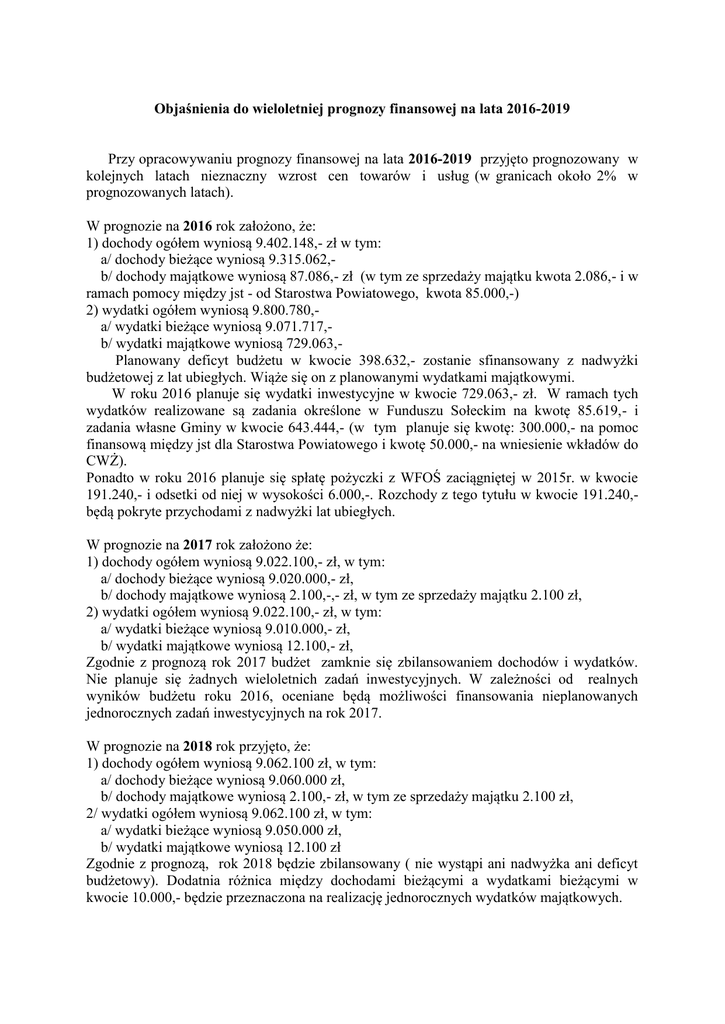 Objaśnienia do wieloletniej prognozy finansowej na lata 2016-2019 Przy opracowywaniu prognozy finansowej na lata 2016-2019 przyjęto prognozowany w kolejnych latach nieznaczny wzrost cen towarów i usług (w granicach około 2% w prognozowanych latach). W prognozie na 2016 rok założono, że: 1) dochody ogółem wyniosą 9.402.148,- zł w tym: a/ dochody bieżące wyniosą 9.315.062,b/ dochody majątkowe wyniosą 87.086,- zł (w tym ze sprzedaży majątku kwota 2.086,- i w ramach pomocy między jst - od Starostwa Powiatowego, kwota 85.000,-) 2) wydatki ogółem wyniosą 9.800.780,a/ wydatki bieżące wyniosą 9.071.717,b/ wydatki majątkowe wyniosą 729.063,Planowany deficyt budżetu w kwocie 398.632,- zostanie sfinansowany z nadwyżki budżetowej z lat ubiegłych. Wiąże się on z planowanymi wydatkami majątkowymi. W roku 2016 planuje się wydatki inwestycyjne w kwocie 729.063,- zł. W ramach tych wydatków realizowane są zadania określone w Funduszu Sołeckim na kwotę 85.619,- i zadania własne Gminy w kwocie 643.444,- (w tym planuje się kwotę: 300.000,- na pomoc finansową między jst dla Starostwa Powiatowego i kwotę 50.000,- na wniesienie wkładów do CWŻ). Ponadto w roku 2016 planuje się spłatę pożyczki z WFOŚ zaciągniętej w 2015r. w kwocie 191.240,- i odsetki od niej w wysokości 6.000,-. Rozchody z tego tytułu w kwocie 191.240,będą pokryte przychodami z nadwyżki lat ubiegłych. W prognozie na 2017 rok założono że: 1) dochody ogółem wyniosą 9.022.100,- zł, w tym: a/ dochody bieżące wyniosą 9.020.000,- zł, b/ dochody majątkowe wyniosą 2.100,-,- zł, w tym ze sprzedaży majątku 2.100 zł, 2) wydatki ogółem wyniosą 9.022.100,- zł, w tym: a/ wydatki bieżące wyniosą 9.010.000,- zł, b/ wydatki majątkowe wyniosą 12.100,- zł, Zgodnie z prognozą rok 2017 budżet zamknie się zbilansowaniem dochodów i wydatków. Nie planuje się żadnych wieloletnich zadań inwestycyjnych. W zależności od realnych wyników budżetu roku 2016, oceniane będą możliwości finansowania nieplanowanych jednorocznych zadań inwestycyjnych na rok 2017. W prognozie na 2018 rok przyjęto, że: 1) dochody ogółem wyniosą 9.062.100 zł, w tym: a/ dochody bieżące wyniosą 9.060.000 zł, b/ dochody majątkowe wyniosą 2.100,- zł, w tym ze sprzedaży majątku 2.100 zł, 2/ wydatki ogółem wyniosą 9.062.100 zł, w tym: a/ wydatki bieżące wyniosą 9.050.000 zł, b/ wydatki majątkowe wyniosą 12.100 zł Zgodnie z prognozą, rok 2018 będzie zbilansowany ( nie wystąpi ani nadwyżka ani deficyt budżetowy). Dodatnia różnica między dochodami bieżącymi a wydatkami bieżącymi w kwocie 10.000,- będzie przeznaczona na realizację jednorocznych wydatków majątkowych. W prognozie na 2019 rok przyjęto, że: 1/ dochody ogółem wyniosą 9.152.100 zł, z tego: a/ dochody bieżące wyniosą 9.150.00,- zł, b/ dochody majątkowe wyniosą 2.100,- zł ( w tym: ze sprzedaży majątku 2.100 zł), 2/ wydatki ogółem wyniosą 9.152.100 zł, w tym: a/ wydatki bieżące wyniosą 9.100.000,- zł b/ wydatki majątkowe wyniosą 52.100 zł Zgodnie z prognozą roku 2019, budżet gminy zostanie zbilansowany. W roku tym zakłada się, że powstała bieżąca nadwyżka budżetu w kwocie 50.000,- będzie przeznaczona na jednoroczne wydatki majątkowe 2019 r. Wypracowane nadwyżki w latach objętych prognozą zostaną przeznaczone na finansowanie deficytów w latach następnych, na realizację zakupów inwestycyjnych bądź jednorocznych zadań inwestycyjnych. W roku 2016 z nadwyżki lat ubiegłych planuje się spłatę pożyczki zaciągniętej w 2015r w kwocie 191.240,- z WFOŚ. Rozchody na ten cel będą pokryte nadwyżką z lat ubiegłych. Planowane dochody i wydatki bieżące w kolejnych latach będą się wiązały z licznymi ograniczeniami. Realizowane będą jedynie niezbędne potrzeby jednostek i będą one zabezpieczały konieczne koszty stałe ich działalności. Dochody gminy wskazane w WPF to głównie podatki lokalne, subwencje i dotacje. Skutki ich obniżania to w konsekwencji niższe wpływy do budżetu gminy. W następnych latach (2017-2018) wskazuje się na zmienną nieznacznie spadkową tendencję wykonania wydatków bieżących wiążącą się z planowanymi zmniejszającymi się dochodami bieżącymi (ze względu na trudną do oceny sytuację w rolnictwie w prognozowanej cenie skupu za q żyta oraz innymi opłatami lokalnymi). W latach tych nie przewiduje się znaczących różnic w wydatkach stałych jednostek gminy. W latach 2016-2019 nie następuje prognozowane bilansowanie wydatków i dochodów budżetu. Planuje się nieznaczne nadwyżki bieżące, które będą przeznaczane na jednoroczne wydatki majątkowe. Natomiast w latach tych nie przewiduje się żadnych znaczących wydatków inwestycyjnych. Wiąże się to z ograniczonymi środkami finansowymi budżetu, gmina Ostaszewo nie planuje w najbliższych latach (2016-2019) znaczących wydatków majątkowych. Sytuacja ta może ulec zmienie w przypadku gdy w latach tych, będą korzystne oferty programowe w ramach współfinansowania środkami Unii Europejskiej. Wydatki inwestycyjne wykazane w WPF dotyczą głównie planowanych inwestycji roku 2016. W ramach tych inwestycji wskazane są zadania z Funduszu Sołeckiego oraz zadania finansowane ze środków własnych, mające pokrycie z nadwyżki wypracowanej w latach poprzednich. W latach 2016 - 2019 dochody majątkowe planuje się zgodnie z przypisami na dany rok, w wysokości obowiązujących rat za sprzedaż mienia komunalnego.