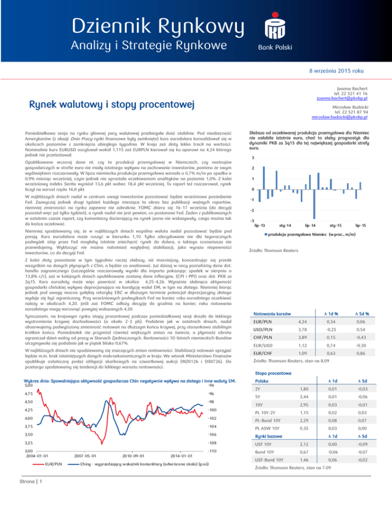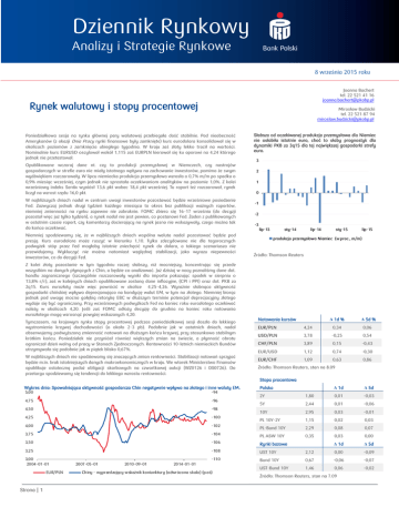 Dziennik Rynkowy Analizy i Strategie Rynkowe 8 września 2015 roku Joanna Bachert tel. 22 521 41 16 [email protected] Rynek walutowy i stopy procentowej Mirosław Budzicki tel. 22 521 87 94 [email protected] Poniedziałkowa sesja na rynku głównej pary walutowej przebiegała dość stabilnie. Pod nieobecność Amerykanów (z okazji Dnia Pracy rynki finansowe były zamknięte) kurs eurodolara konsolidował się w okolicach poziomów z zamknięcia ubiegłego tygodnia. W kraju zaś złoty lekko tracił na wartości. Nominalnie kurs EURUSD oscylował wokół 1,115 zaś EURPLN kierował się ku oporowi na 4,24 którego jednak nie przetestował. Opublikowane wczoraj dane nt. czy to produkcji przemysłowej w Niemczech, czy nastrojów gospodarczych w strefie euro nie miały istotnego wpływu na zachowanie inwestorów, pomimo że swym wydźwiękiem rozczarowały. W lipcu niemiecka produkcja przemysłowa wzrosła o 0,7% m/m po spadku o 0,9% miesiąc wcześniej, czym jednak nie sprostała oczekiwaniom analityków na poziomie 1,0%. Z kolei wrześniowy indeks Sentix wyniósł 13,6 pkt wobec 18,4 pkt wcześniej. Tu raport też rozczarował, rynek liczył na wzrost rzędu 16,0 pkt. W najbliższych dniach nadal w centrum uwagi inwestorów pozostawać będzie wrześniowe posiedzenie Fed. Zazwyczaj jednak drugi tydzień każdego miesiąca to okres bez publikacji ważnych raportów, niemniej zmienności na rynku zapewne nie zabraknie. FOMC zbiera się 16-17 września (do decyzji pozostał więc już tylko tydzień), a rynek nadal nie jest pewien, co postanowi Fed. Żaden z publikowanych w ostatnim czasie raport, czy komentarzy docierający na rynek jasno nie wskazywały, czego można tak do końca oczekiwać. Niemniej spodziewamy się, że w najbliższych dniach wspólna waluta nadal pozostawać będzie pod presją. Kurs eurodolara może ruszyć w kierunku 1,10. Tylko zdecydowane nie dla tegorocznych podwyżek stóp przez Fed mogłoby istotnie zniechęcić rynek do dolara, a takiego scenariusza nie przewidujemy. Wykluczyć nie można natomiast względnej stabilizacji, jako wyrazu niepewności inwestorów, co do decyzji Fed. Słabsza od oczekiwanej produkcja przemysłowa dla Niemiec nie osłabiła istotnie euro, choć to słaby prognostyk dla dynamiki PKB za 3q15 dla tej największej gospodarki strefy euro. 3 2 1 0 -1 -2 -3 lip-13 sty-14 lip-14 sty-15 lip-15 produkcja przemysłowa Niemiec (w proc., m/m) Źródło: Thomson Reuters Z kolei złoty pozostanie w tym tygodniu raczej słabszy, niż mocniejszy, koncentrując się przede wszystkim na danych płynących z Chin, a będzie co analizować. Już dzisiaj w nocy poznaliśmy dane dot. handlu zagranicznego (szczególnie rozczarowały wyniki dla importu pokazując spadek w sierpniu o 13,8% r/r), zaś w kolejnych dniach opublikowane zostaną dane inflacyjne, (CPI i PPI) oraz dot. PKB za 2q15. Kurs eurozłoty może więc powrócić w okolice 4,25-4,26. Wyraźnie słabnąca aktywność gospodarki chińskiej wpływa deprecjonująco na kondycję walut EM, w tym na złotego. Niemniej biorąc jednak pod uwagę mocno gołębią retorykę EBC w dłuższym terminie potencjał deprecjacyjny złotego wydaje się być ograniczony. Przy wrześniowych podwyżkach Fed na koniec roku eurozłotego oczekiwać należy w okolicach 4,20. Jeśli zaś FOMC odłoży decyzję do grudnia na koniec roku notowania eurozłotego mogą wzrosnąć powyżej wskazanych 4,20. Tymczasem, na krajowym rynku stopy procentowej podczas poniedziałkowej sesji doszło do lekkiego wystromienia krzywej dochodowości (o około 2-3 pb). Podobnie jak w ostatnich dniach, nadal obserwujemy podwyższoną zmienność notowań na dłuższym końcu krzywej, przy stosunkowo stabilnym krótkim końcu. Poniedziałek nie przyniósł również większych zmian na świecie, a płynność obrotu ograniczał dzień wolny od pracy w Stanach Zjednoczonych. Rentowności 10-letnich niemieckich Bundów utrzymywała się podobnie jak w piątek blisko 0,67%. W najbliższych dniach nie spodziewamy się znaczących zmian rentowności. Stabilizacji notowań sprzyjać będzie m.in. brak istotniejszych danych makroekonomicznych w kraju. We wtorek Ministerstwo Finansów opublikuje ostateczną podaż obligacji skarbowych na czwartkowej aukcji (WZ0126 i DS0726). Do przetargu spodziewamy się tendencji do lekkiego wzrostu rentowności. Notowania kursów Δ 1d % Δ 5d % 0,06 EUR/PLN 4,24 0,34 USD/PLN 3,78 -0,25 0,54 CHF/PLN 3,89 0,15 -0,43 EUR/USD 1,12 0,74 -0,30 EUR/CHF 1,09 0,63 0,86 Źródło: Thomson Reuters, stan na 8.09 Stopa procentowa Δ 1d Δ 5d 2Y 1,80 0,01 -0,03 5Y 2,44 0,01 -0,06 10Y 2,95 0,03 -0,01 PL 10Y-2Y 1,15 0,02 0,03 PL-Bund 10Y 2,29 0,08 0,07 -104 PL ASW 10Y 0,35 3,50 -106 Rynki bazowe 3,25 -108 UST 10Y 3,00 2004-01-01 -110 Wykres dnia: Spowalniająca aktywność gospodarcza Chin negatywnie wpływa na złotego i inne waluty EM. 5,00 -94 4,75 -96 4,50 -98 4,25 -100 4,00 -102 3,75 EUR/PLN Strona | 1 2007-05-01 2010-09-01 2014-01-01 Chiny - wyprzedzający wskaźnik koniunktury (odwrócona skala) (p.oś) Polska 0,03 0,00 Δ 1d Δ 5d 2,12 0,00 -0,09 Bund 10Y 0,67 -0,06 -0,07 UST-Bund 10Y 1,46 0,06 -0,02 Źródło: Thomson Reuters, stan na 7.09 Dziennik Rynkowy Analizy i Strategie Rynkowe Pozostałe informacje rynkowe – stopa procentowa Notowania skarbowych papierów wartościowych (SPW) – stan na 7.09 2Y 5Y 10Y 2Y 5Y 10Y 2Y 5Y 10Y OS PLN 1,80 2,44 2,95 Bund -0,23 0,05 0,67 Δ 1d 0,01 0,01 0,03 Δ 1d 0,00 -0,01 -0,06 UST 0,71 1,47 2,12 Δ 1d 0,00 0,00 Δ 5d -0,03 -0,06 -0,01 Δ 5d 0,016 -0,05 -0,07 Δ 5d 0,00 -0,03 -0,08 -0,09 2Y 5Y 10Y 0,07 0,38 0,98 USD Notowania kontraktów IRS – stan na 7.09 2Y 5Y 10Y 1,73 2,14 2,61 EUR Δ 1d 0,01 -0,02 0,00 Δ 1d 0,00 -0,03 -0,06 Δ 1d 0,01 0,01 0,02 Δ 5d -0,03 -0,02 0,00 Δ 5d -0,02 -0,05 -0,07 Δ 5d -0,04 -0,09 -0,08 PLN Polski rynek stopy procentowej 42,0 23 19 32 35 30 2,31 10Y 2,17 1,87 Krzywa FRA 1,0 1,76 3,0 3535 38 7 31,0 1,80 0,7 1,72 20,0 1,73 0,4 1,68 9,0 1,66 0,5 1,