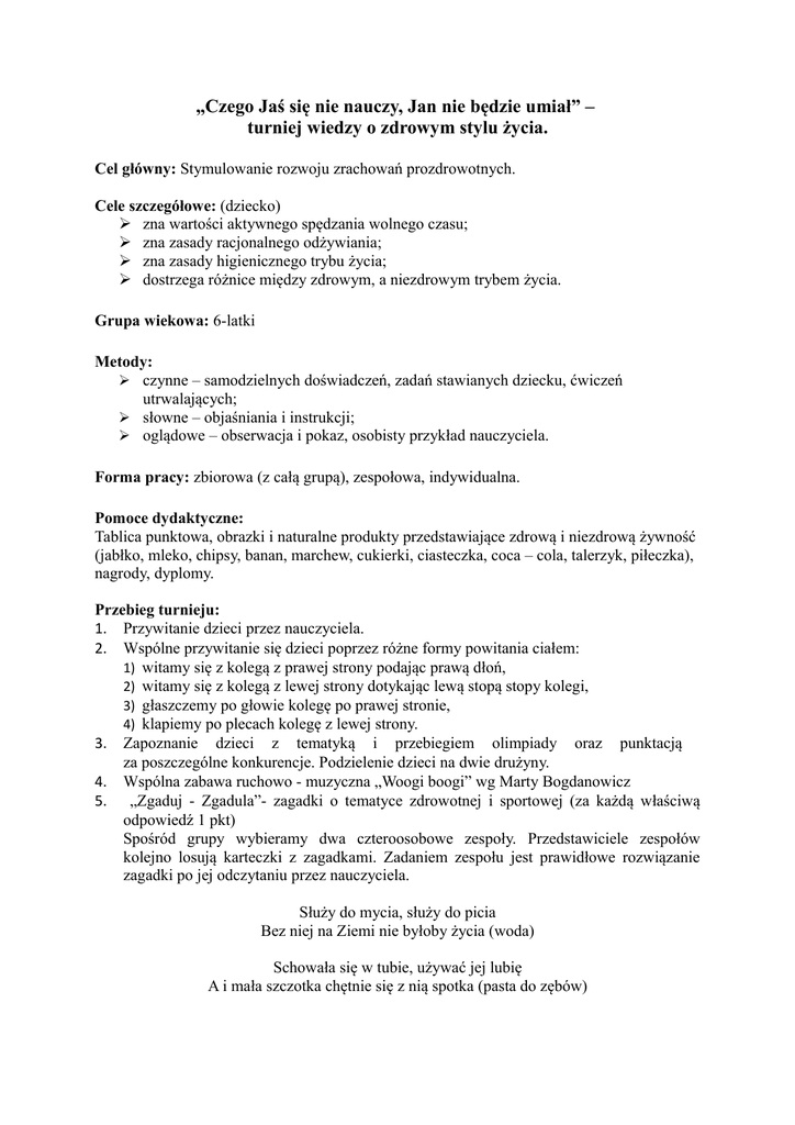„Czego Jaś się nie nauczy, Jan nie będzie umiał” – turniej wiedzy o zdrowym stylu życia. Cel główny: Stymulowanie rozwoju zrachowań prozdrowotnych. Cele szczegółowe: (dziecko) zna wartości aktywnego spędzania wolnego czasu; zna zasady racjonalnego odżywiania; zna zasady higienicznego trybu życia; dostrzega różnice między zdrowym, a niezdrowym trybem życia. Grupa wiekowa: 6-latki Metody: czynne – samodzielnych doświadczeń, zadań stawianych dziecku, ćwiczeń utrwalających; słowne – objaśniania i instrukcji; oglądowe – obserwacja i pokaz, osobisty przykład nauczyciela. Forma pracy: zbiorowa (z całą grupą), zespołowa, indywidualna. Pomoce dydaktyczne: Tablica punktowa, obrazki i naturalne produkty przedstawiające zdrową i niezdrową żywność (jabłko, mleko, chipsy, banan, marchew, cukierki, ciasteczka, coca – cola, talerzyk, piłeczka), nagrody, dyplomy. Przebieg turnieju: 1. Przywitanie dzieci przez nauczyciela. 2. Wspólne przywitanie się dzieci poprzez różne formy powitania ciałem: 1) witamy się z kolegą z prawej strony podając prawą dłoń, 2) witamy się z kolegą z lewej strony dotykając lewą stopą stopy kolegi, 3) głaszczemy po głowie kolegę po prawej stronie, 4) klapiemy po plecach kolegę z lewej strony. 3. Zapoznanie dzieci z tematyką i przebiegiem olimpiady oraz punktacją za poszczególne konkurencje. Podzielenie dzieci na dwie drużyny. 4. Wspólna zabawa ruchowo - muzyczna „Woogi boogi” wg Marty Bogdanowicz 5. „Zgaduj - Zgadula”- zagadki o tematyce zdrowotnej i sportowej (za każdą właściwą odpowiedź 1 pkt) Spośród grupy wybieramy dwa czteroosobowe zespoły. Przedstawiciele zespołów kolejno losują karteczki z zagadkami. Zadaniem zespołu jest prawidłowe rozwiązanie zagadki po jej odczytaniu przez nauczyciela. Służy do mycia, służy do picia Bez niej na Ziemi nie byłoby życia (woda) Schowała się w tubie, używać jej lubię A i mała szczotka chętnie się z nią spotka (pasta do zębów) Najeżona jest jak jeż, Lecz nikogo nie kłuje, tylko zęby szoruje (szczoteczka) Używasz go na co dzień, co dzień w wodzie moczysz. Gdy nim buzie myjesz, trochę szczypie w oczy (mydło) Porzeczkowy czy wiśniowy, Zawsze smaczny jest i zdrowy.(sok) Ten biały napój daje ci zdrowie. Nie możesz zgadnąć? Kotek ci powie.(mleko) Skoki, biegi, gimnastyka wspólną nazwę mają. Jakie je wszystkie razem ludzie nazywają? (sport) 6. 7. 8. 9. Podłoga zwody – twarda jak kamień. Tańce i zawody urządza się na niej (ślizgawka) Wspólna zabawa ruchowa „Gąsienica”(dla grupy zwycięskiej 1 pkt) Każda z grup uczestniczących w olimpiadzie „przeobraża się” wg gąsienicę. W tym celu wszyscy klękają w jednym rzędzie i obejmują rękami kostki nóg osoby, znajdującej się z przodu. Na umówiony sygnał gąsienica zaczyna się poruszać. Wygrywa ta gąsienica która się później rozpadnie. „Wiem co jem”(za każdą właściwą odpowiedź 1 pkt) Każda drużyna wybiera 4 swoich przedstawicieli. Na talerzykach przygotowane są produkty ze zdrową i niezdrową żywnością. Każdy przedstawiciel drużyny przy zasłoniętych oczach rozpoznaje degustowany produkt. Następnie określa czy produkt był zdrowy, czy nie, jednocześnie uzasadniając swoją decyzję. W przypadku zdrowej żywności dziecko umieszcza „zielone oczko” przy „uśmiechniętej buźce” , w przypadku niezdrowej żywności umieszcza „oczko czerwone” przy „ buźce smutnej”. Potrawy zdrowe do odgadnięcia to: jabłko, mleko, banan, marchew Potrawy niezdrowe do odgadnięcia to: chipsy, czekolada, żelki, coca-col. Wyścig „Piłka na talerzu”(dla grupy zwycięskiej 1 pkt) Każda z drużyn ustawia się w kole, nauczycielki otrzymują plastikowy talerz i mała piłeczkę. Na sygnał należy przekazywać talerzyk ze znajdującą się na nim piłką każdej osobie w kole tak, aby piłka nie spadła. Wygrywa drużyna, która pierwsza zwróci talerzyk z piłeczką nauczycielce. Dokańczanie - rymowanie (za każdą właściwą odpowiedź 1 pkt) Wybrane dziecko z każdej drużyny losuje numer rymowanki. Zadaniem grupy jest dokończyć usłyszaną rymowankę. 1) Wszyscy mamy słodkie minki, bo zjadamy (witaminki) 2) Masz gorączkę? Na co czekasz? Pora by Cię zbadał (lekarz) 3) Gdy czystość w koło świeci, zdrowi są starsi i zdrowe są (dzieci) 4) Jedz owoce i jarzyny w nich mieszkają (witaminy) 5) Przez cały rok pij marchewkowy (sok) 6) Kto się często myje ten bardzo długo (żyje) 10. Bieg na czworakach (dla grupy zwycięskiej 1 pkt) Każda z drużyn staje gęsiego na linii startu. Na hasło podane przez prowadzącego dzieci kolejno ścigają się na czworakach. Ich zadaniem jest jak najszybciej dotrzeć do wyznaczonej linii końcowej i wrócić na start. Kolejne dziecko może wystartować dopiero, gdy wróci jego poprzednik. Wygrywa drużyna, której zawodnicy najszybciej wykonają prawidłowo zadanie. 11. Quiz „Na wesoło” (za każdą właściwą odpowiedź 1 pkt) Drużyna podaje numer pytania od 1 – 8. Po naradzie wybierają jedną z trzech odpowiedzi. Gdzie mieszkają witaminy? 1. w słodyczach 2. w balonie 3. w owocach i warzywach Co jest szkodliwe dla zębów: 1. owoce 2. mleko 3. słodycze Co należy zrobić przed jedzeniem? 1. zatańczyć 2. umyć ręce 3. przeczytać książkę Co robisz zanim zjesz warzywo lub owoc? 1. słodzisz albo dodajesz ketchup 2. dokładnie myjesz pod bieżącą wodą 3. wycierasz ściereczką Jaki jest najzdrowszy napój dla dziecka? 1. cola 2. słodki napój w kartoniku 3. woda Żeby być zdrowym trzeba: 1. siedzieć przed telewizorem; 2. jeść chipsy; 3. uprawiać sport; Ubieramy się odpowiednio do: 1. przyrody; 2. przygody; 3. pogody; Gdy masz katar to: 1. wycierasz nos w rękaw; 2. nie wycierasz wcale; 3. używasz papierowej chusteczki; 12. Podsumowanie konkursu: 1) podliczenie punktów 2) wyłonienie zwycięzców, 13. Rozdanie pucharów i dyplomów. 14. Podzi