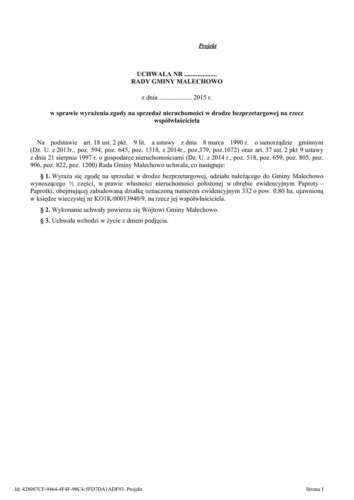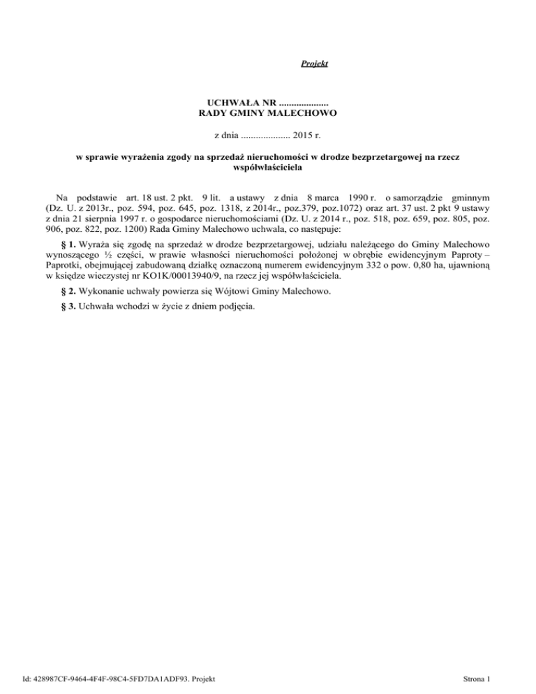 Projekt UCHWAŁA NR .................... RADY GMINY MALECHOWO z dnia .................... 2015 r. w sprawie wyrażenia zgody na sprzedaż nieruchomości w drodze bezprzetargowej na rzecz współwłaściciela Na podstawie art. 18 ust. 2 pkt. 9 lit. a ustawy z dnia 8 marca 1990 r. o samorządzie gminnym (Dz. U. z 2013r., poz. 594, poz. 645, poz. 1318, z 2014r., poz.379, poz.1072) oraz art. 37 ust. 2 pkt 9 ustawy z dnia 21 sierpnia 1997 r. o gospodarce nieruchomościami (Dz. U. z 2014 r., poz. 518, poz. 659, poz. 805, poz. 906, poz. 822, poz. 1200) Rada Gminy Malechowo uchwala, co następuje: § 1. Wyraża się zgodę na sprzedaż w drodze bezprzetargowej, udziału należącego do Gminy Malechowo wynoszącego ½ części, w prawie własności nieruchomości położonej w obrębie ewidencyjnym Paproty – Paprotki, obejmującej zabudowaną działkę oznaczoną numerem ewidencyjnym 332 o pow. 0,80 ha, ujawnioną w księdze wieczystej nr KO1K/00013940/9, na rzecz jej współwłaściciela. § 2. Wykonanie uchwały powierza się Wójtowi Gminy Malechowo. § 3. Uchwała wchodzi w życie z dniem podjęcia. Id: 428987CF-9464-4F4F-98C4-5FD7DA1ADF93. Projekt Strona 1 Uzasadnienie Nieruchomość gruntowa zabudowana położona w miejscowości Paproty 20, obręb ewidencyjny Paproty Paprotki, oznaczona jako działka nr 332 o pow. 0,80 ha, w udziale ½ części , stanowi własność Gminy Malechowo, pozostały udział stanowi współwłasność osoby fizycznej. Współwłaściciel złożył wniosek o zniesienie współwłasności poprzez sprzedaż udziału Gminy na jego rzecz. Budynek jest w złym stanie, wymaga sporych nakładów finansowych . Sprzedaż nieruchomości jest zasadna pod względem ekonomiczno – finansowym. Koszty notarialne pokrywać będzie kupujący. Zgodnie z art. 37 ust. 2 pkt 9 ustawy z dnia 21 sierpnia 1997 r. o gospodarce nieruchomościami (Dz. U. z 2014 r., poz. 518, poz. 659, poz. 805, poz. 906, poz. 822, poz. 1200), nieruchomość jest zbywana w drodze bezprzetargowej jeżeli przedmiotem zbycia jest udział w nieruchomości, a zbycie następuje na rzecz innych współwłaścicieli nieruchomości, co mam miejsce w tym przypadku. Id: 428987CF-9464-4F4F-98C4-5FD7DA1ADF93. Projekt Strona 1