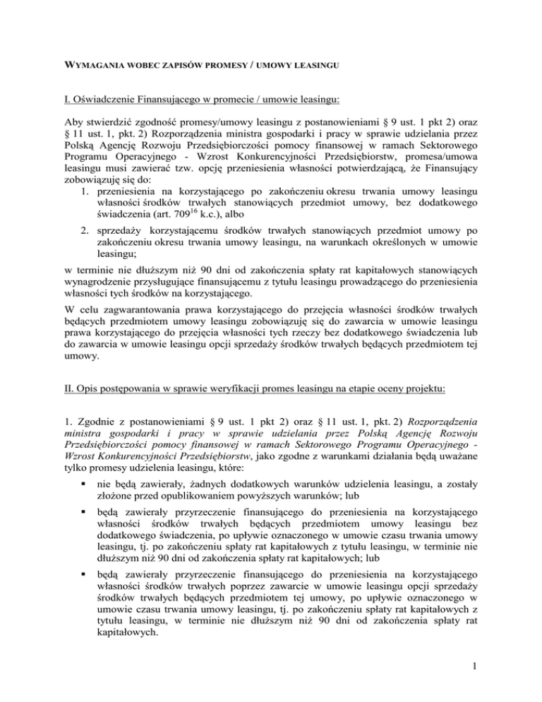 WYMAGANIA WOBEC ZAPISÓW PROMESY / UMOWY LEASINGU I. Oświadczenie Finansującego w promecie / umowie leasingu: Aby stwierdzić zgodność promesy/umowy leasingu z postanowieniami § 9 ust. 1 pkt 2) oraz § 11 ust. 1, pkt. 2) Rozporządzenia ministra gospodarki i pracy w sprawie udzielania przez Polską Agencję Rozwoju Przedsiębiorczości pomocy finansowej w ramach Sektorowego Programu Operacyjnego - Wzrost Konkurencyjności Przedsiębiorstw, promesa/umowa leasingu musi zawierać tzw. opcję przeniesienia własności potwierdzającą, że Finansujący zobowiązuję się do: 1. przeniesienia na korzystającego po zakończeniu okresu trwania umowy leasingu własności środków trwałych stanowiących przedmiot umowy, bez dodatkowego świadczenia (art. 70916 k.c.), albo 2. sprzedaży korzystającemu środków trwałych stanowiących przedmiot umowy po zakończeniu okresu trwania umowy leasingu, na warunkach określonych w umowie leasingu; w terminie nie dłuższym niż 90 dni od zakończenia spłaty rat kapitałowych stanowiących wynagrodzenie przysługujące finansującemu z tytułu leasingu prowadzącego do przeniesienia własności tych środków na korzystającego. W celu zagwarantowania prawa korzystającego do przejęcia własności środków trwałych będących przedmiotem umowy leasingu zobowiązuję się do zawarcia w umowie leasingu prawa korzystającego do przejęcia własności tych rzeczy bez dodatkowego świadczenia lub do zawarcia w umowie leasingu opcji sprzedaży środków trwałych będących przedmiotem tej umowy. II. Opis postępowania w sprawie weryfikacji promes leasingu na etapie oceny projektu: 1. Zgodnie z postanowieniami § 9 ust. 1 pkt 2) oraz § 11 ust. 1, pkt. 2) Rozporządzenia ministra gospodarki i pracy w sprawie udzielania przez Polską Agencję Rozwoju Przedsiębiorczości pomocy finansowej w ramach Sektorowego Programu Operacyjnego Wzrost Konkurencyjności Przedsiębiorstw, jako zgodne z warunkami działania będą uważane tylko promesy udzielenia leasingu, które: nie będą zawierały, żadnych dodatkowych warunków udzielenia leasingu, a zostały złożone przed opublikowaniem powyższych warunków; lub będą zawierały przyrzeczenie finansującego do przeniesienia na korzystającego własności środków trwałych będących przedmiotem umowy leasingu bez dodatkowego świadczenia, po upływie oznaczonego w umowie czasu trwania umowy leasingu, tj. po zakończeniu spłaty rat kapitałowych z tytułu leasingu, w terminie nie dłuższym niż 90 dni od zakończenia spłaty rat kapitałowych; lub będą zawierały przyrzeczenie finansującego do przeniesienia na korzystającego własności środków trwałych poprzez zawarcie w umowie leasingu opcji sprzedaży środków trwałych będących przedmiotem tej umowy, po upływie oznaczonego w umowie czasu trwania umowy leasingu, tj. po zakończeniu spłaty rat kapitałowych z tytułu leasingu, w terminie nie dłuższym niż 90 dni od zakończenia spłaty rat kapitałowych. 1 2. W przypadkach promes udzielenia leasingu wydanych przed opublikowaniem powyższych warunków, a zawierających inne niż w/w postanowienia. Regionalna Instytucja Finansująca wezwie wnioskodawcę na etapie oceny formalnej wniosku o dofinansowanie do uzupełnienia wniosku poprzez dostarczenie promesy spełniającej warunki określone w pkt. I powyżej. 3. Jeżeli uzupełnienia wniosku na etapie oceny formalnej nie będzie możliwe (w przypadkach, kiedy np. wniosek został już przekazany do Instytucji Wdrażającej) Instytucja Wdrażająca na wniosek Grupy Roboczej wezwie Wnioskodawcę do usunięcia nieprawidłowości. 4. Promesy udzielenia leasingu wydane po ogłoszeniu powyższych wytycznych będą przez RIF weryfikowane na etapie oceny formalnej zgodnie z zasadami tej oceny. Promesy niespełniające powyższych warunków będą odrzucane jako niespełniające wymogów formalnych. 2