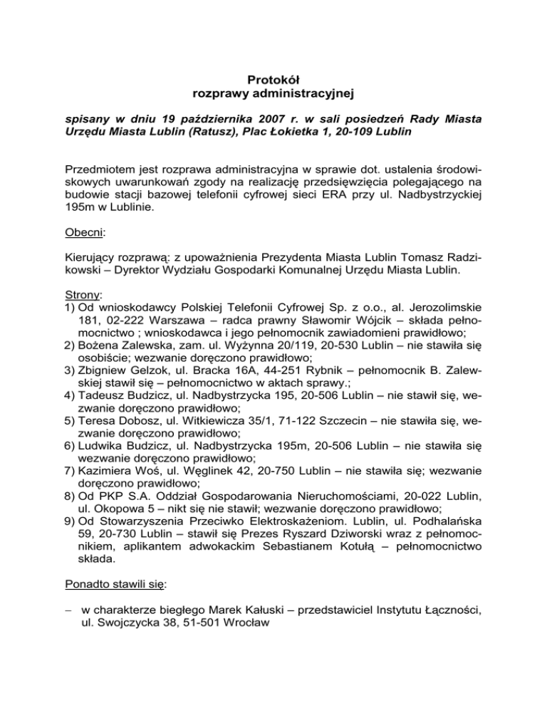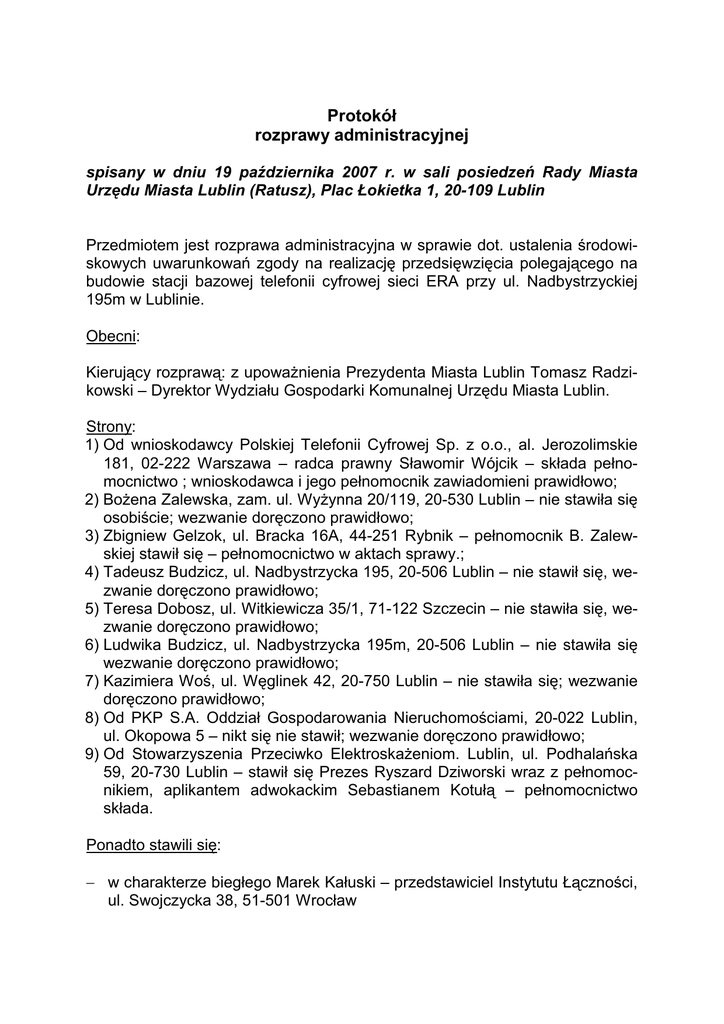 Protokół rozprawy administracyjnej spisany w dniu 19 października 2007 r. w sali posiedzeń Rady Miasta Urzędu Miasta Lublin (Ratusz), Plac Łokietka 1, 20-109 Lublin Przedmiotem jest rozprawa administracyjna w sprawie dot. ustalenia środowiskowych uwarunkowań zgody na realizację przedsięwzięcia polegającego na budowie stacji bazowej telefonii cyfrowej sieci ERA przy ul. Nadbystrzyckiej 195m w Lublinie. Obecni: Kierujący rozprawą: z upowaŜnienia Prezydenta Miasta Lublin Tomasz Radzikowski – Dyrektor Wydziału Gospodarki Komunalnej Urzędu Miasta Lublin. Strony: 1) Od wnioskodawcy Polskiej Telefonii Cyfrowej Sp. z o.o., al. Jerozolimskie 181, 02-222 Warszawa – radca prawny Sławomir Wójcik – składa pełnomocnictwo ; wnioskodawca i jego pełnomocnik zawiadomieni prawidłowo; 2) BoŜena Zalewska, zam. ul. WyŜynna 20/119, 20-530 Lublin – nie stawiła się osobiście; wezwanie doręczono prawidłowo; 3) Zbigniew Gelzok, ul. Bracka 16A, 44-251 Rybnik – pełnomocnik B. Zalewskiej stawił się – pełnomocnictwo w aktach sprawy.; 4) Tadeusz Budzicz, ul. Nadbystrzycka 195, 20-506 Lublin – nie stawił się, wezwanie doręczono prawidłowo; 5) Teresa Dobosz, ul. Witkiewicza 35/1, 71-122 Szczecin – nie stawiła się, wezwanie doręczono prawidłowo; 6) Ludwika Budzicz, ul. Nadbystrzycka 195m, 20-506 Lublin – nie stawiła się wezwanie doręczono prawidłowo; 7) Kazimiera Woś, ul. Węglinek 42, 20-750 Lublin – nie stawiła się; wezwanie doręczono prawidłowo; 8) Od PKP S.A. Oddział Gospodarowania Nieruchomościami, 20-022 Lublin, ul. Okopowa 5 – nikt się nie stawił; wezwanie doręczono prawidłowo; 9) Od Stowarzyszenia Przeciwko ElektroskaŜeniom. Lublin, ul. Podhalańska 59, 20-730 Lublin – stawił się Prezes Ryszard Dziworski wraz z pełnomocnikiem, aplikantem adwokackim Sebastianem Kotułą – pełnomocnictwo składa. Ponadto stawili się: − w charakterze biegłego Marek Kałuski – przedstawiciel Instytutu Łączności, ul. Swojczycka 38, 51-501 Wrocław − przedstawiciele państwowych jednostek organizacyjnych i organizacji społecznych: 1) Przedstawiciel Wojewody Lubelskiego, ul. Spokojna 4, 20-914 Lublin – Dyrektor Wydziału Ochrony Środowiska LUW Zdzisław Strycharz; 2) Przedstawiciel Państwowego Wojewódzkiego Inspektora Sanitarnego, ul. Pielęgniarek 6, 20-812 Lublin – p. GraŜyna Duszewska. Kierujący rozprawą stwierdził, Ŝe stronom, świadkom, biegłym, państwowym jednostkom organizacyjnym, organizacjom społecznym i innym osobom wezwanym do udziału w rozprawie doręczono wezwania. Ponadto, o terminie, miejscu i przedmiocie sprawy ogłoszono na 7 dni przed wyznaczonym terminem w drodze obwieszczenia. Obwieszczenia zostały zamieszczone w siedzibie Urzędu Miasta Lublin, Pl. Łokietka 1, na stronie internetowej Urzędu Miasta oraz w pobliŜu inwestycji na okolicznych blokach. Miejsce wywieszenia zostało uzgodnione ze Spółdzielnią Mieszkaniową „Klakson” oraz Wspólnotą Mieszkaniową ul. Szafirowa 15 [obwieszczenia wisiały na blokach co najmniej 3 wspólnot mieszkaniowych - przyp. red.]. Kierujący rozprawą stwierdził, Ŝe w dniu wczorajszym (18 października 2007 r.) od wnioskodawcy Polskiej Telefonii Cyfrowej Sp. z o.o wpłynęło pismo, w którym wnioskodawca m.in. wnosi o odwołanie wyznaczonej na dzień dzisiejszy rozprawy. Przewodniczący zapytał pełnomocnika wnioskodawcy, czy podtrzymuje wniosek. Pełnomocnik wnioskodawcy oświadczył, Ŝe podtrzymuje ww. wniosek. Przewodniczący poinformował, Ŝe rozprawa została zwołana na podstawie art. 89 § 2 Kodeksu postępowania administracyjnego oraz art. 32 ust. 1 pkt 2 ustawy Prawo ochrony środowiska i jest otwarta dla społeczeństwa. Wszystkie strony zostały prawidłowo zawiadomione o terminie i miejscu przeprowadzenia rozprawy. Zawiadomienie o rozprawie było teŜ podane do publicznej wiadomości, o czym poinformowałem powyŜej. Kierujący rozprawą stwierdził, iŜ brak jest podstaw do uwzględnienia wniosku Polskiej Telefonii Cyfrowej Sp. z o.o. o odwołanie rozprawy w dniu dzisiejszym i oddalił ten wniosek. Rozprawa tym samym jest kontynuowana. Kierujący rozprawą przedstawił jej przedmiot oraz wyjaśnienia, dokumenty i inne dowody zebrane przed rozprawą, jak równieŜ dotychczasowe wyniki postępowania dowodowego: W dniu 30 marca 2006 r. wpłynął wniosek Polskiej Telefonii Cyfrowej Sp. z o.o. w sprawie wydania decyzji środowiskowej dla inwestycji polegającej na budowie stacji bazowej telefonii cyfrowej sieci ERA przy ul. Nadbystrzyckiej 195m w Lublinie. Wojewoda Lubelski postanowieniem z dnia 31 maja 2006 r., znak ŚiR.V.6612/83/06 pozytywnie uzgodnił warunki realizacji ww. przedsięwzięcia. -2- Państwowy Wojewódzki Inspektor Sanitarny w Lublinie postanowieniem z dnia 18 kwietnia 2006 r., znak DNS-NZ.700/148/06 pozytywnie uzgodnił warunki realizacji ww. przedsięwzięcia. Decyzją z dnia 27 czerwca 2006 r. znak:OŚ.IV.7624/DŚ/61/II/06 wydaną z upowaŜnienia Prezydenta Miasta Lublin ustalono środowiskowe uwarunkowania zgody na realizację przedsięwzięcia na wniosek Polskiej Telefonii Cyfrowej Sp. z o.o. dla inwestycji polegającej na budowie stacji bazowej sieci ERA nr 27072 LUBLIN-CZUBY przy ul. Nadbystrzyckiej 195 m w Lublinie. Dnia 24 lipca 2006 r. wpłynął wniosek Wspólnoty Mieszkaniowej ul. Szafirowa 21 w Lublinie o przywrócenie terminu do złoŜenia uwag i wniosków. Postanowieniem z dnia 28 lipca 2006 r. odmówiono przywrócenia powyŜszego terminu. [Wtedy po raz pierwszy, a później jeszcze wielokrotnie, Wydział Ochrony Środowiska UM nie skorzystał z okazji aby przyznać się, iŜ postępowanie przeprowadzono bez udziału społeczeństwa, a więc niezgodnie z ustawą Prawo ochrony środowiska - przyp. red.] Na to postanowienie Wspólnota Mieszkaniowa złoŜyła zaŜalenie do SKO. Samorządowe Kolegium Odwoławcze w Lublinie nie uwzględniło powyŜszego zaŜalenia i umorzyło postępowanie w tym zakresie. [W tym miejscu 