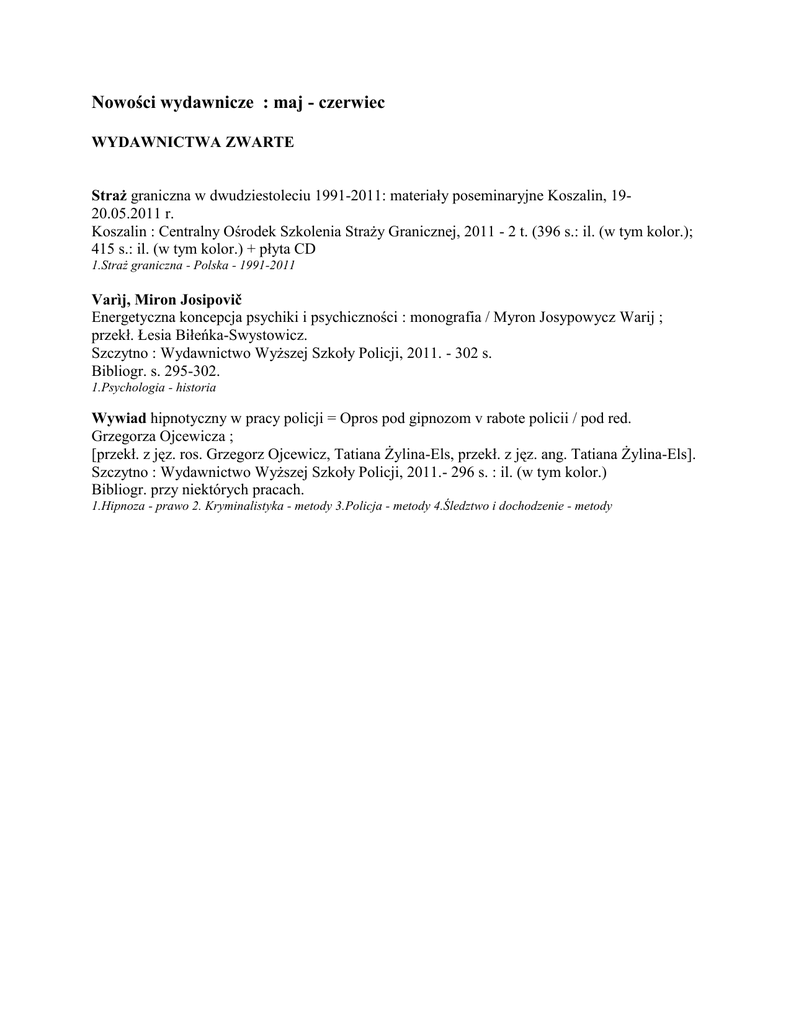 Nowości wydawnicze : maj - czerwiec WYDAWNICTWA ZWARTE Straż graniczna w dwudziestoleciu 1991-2011: materiały poseminaryjne Koszalin, 1920.05.2011 r. Koszalin : Centralny Ośrodek Szkolenia Straży Granicznej, 2011 - 2 t. (396 s.: il. (w tym kolor.); 415 s.: il. (w tym kolor.) + płyta CD 1.Straż graniczna - Polska - 1991-2011 Varìj, Miron Josipovič Energetyczna koncepcja psychiki i psychiczności : monografia / Myron Josypowycz Warij ; przekł. Łesia Biłeńka-Swystowicz. Szczytno : Wydawnictwo Wyższej Szkoły Policji, 2011. - 302 s. Bibliogr. s. 295-302. 1.Psychologia - historia Wywiad hipnotyczny w pracy policji = Opros pod gipnozom v rabote policii / pod red. Grzegorza Ojcewicza ; [przekł. z jęz. ros. Grzegorz Ojcewicz, Tatiana Żylina-Els, przekł. z jęz. ang. Tatiana Żylina-Els]. Szczytno : Wydawnictwo Wyższej Szkoły Policji, 2011.- 296 s. : il. (w tym kolor.) Bibliogr. przy niektórych pracach. 1.Hipnoza - prawo 2. Kryminalistyka - metody 3.Policja - metody 4.Śledztwo i dochodzenie - metody