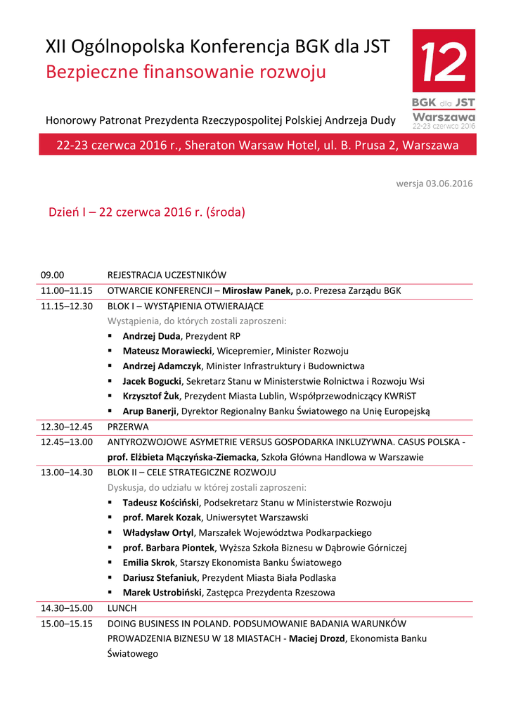 XII Ogólnopolska Konferencja BGK dla JST Bezpieczne finansowanie rozwoju Honorowy Patronat Prezydenta Rzeczypospolitej Polskiej Andrzeja Dudy 22-23 czerwca 2016 r., Sheraton Warsaw Hotel, ul. B. Prusa 2, Warszawa wersja 03.06.2016 Dzień I – 22 czerwca 2016 r. (środa) 09.00 REJESTRACJA UCZESTNIKÓW 11.00–11.15 OTWARCIE KONFERENCJI – Mirosław Panek, p.o. Prezesa Zarządu BGK 11.15–12.30 BLOK I – WYSTĄPIENIA OTWIERAJĄCE Wystąpienia, do których zostali zaproszeni: Andrzej Duda, Prezydent RP Mateusz Morawiecki, Wicepremier, Minister Rozwoju Andrzej Adamczyk, Minister Infrastruktury i Budownictwa Jacek Bogucki, Sekretarz Stanu w Ministerstwie Rolnictwa i Rozwoju Wsi Krzysztof Żuk, Prezydent Miasta Lublin, Współprzewodniczący KWRiST Arup Banerji, Dyrektor Regionalny Banku Światowego na Unię Europejską 12.30–12.45 12.45–13.00 PRZERWA ANTYROZWOJOWE ASYMETRIE VERSUS GOSPODARKA INKLUZYWNA. CASUS POLSKA prof. Elżbieta Mączyńska-Ziemacka, Szkoła Główna Handlowa w Warszawie BLOK II – CELE STRATEGICZNE ROZWOJU Dyskusja, do udziału w której zostali zaproszeni: Tadeusz Kościński, Podsekretarz Stanu w Ministerstwie Rozwoju prof. Marek Kozak, Uniwersytet Warszawski Władysław Ortyl, Marszałek Województwa Podkarpackiego prof. Barbara Piontek, Wyższa Szkoła Biznesu w Dąbrowie Górniczej Emilia Skrok, Starszy Ekonomista Banku Światowego Dariusz Stefaniuk, Prezydent Miasta Biała Podlaska Marek Ustrobiński, Zastępca Prezydenta Rzeszowa 13.00–14.30 14.30–15.00 LUNCH 15.00–15.15 DOING BUSINESS IN POLAND. PODSUMOWANIE BADANIA WARUNKÓW PROWADZENIA BIZNESU W 18 MIASTACH - Maciej Drozd, Ekonomista Banku Światowego 15.15–16.45 BLOK III – EFEKTYWNOŚĆ FINANSOWANIA Dyskusja, do udziału w której zostali zaproszeni: Łukasz Bernatowicz, Ekspert BCC Maciej Bluj, Wiceprezydent Wrocławia Paweł Borys, Prezes Zarządu Polskiego Funduszu Rozwoju S.A. Olgierd Geblewicz, Prezes Zarządu ZWRP, Marszałek Województwa Zachodniopomorskiego prof. Jerzy Hausner, Uniwersytet Ekonomiczny w Krakowie Jerzy Kwieciński, Sekretarz Stanu w Ministerstwie Rozwoju Jerzy Jacek Szugajew, Wiceprezes Zarządu BGK 16.45–17.00 PODSUMOWANIE I DNIA KONFERENCJI Rafał Bruski, Prezydent Miasta Bydgoszczy, Współprzewodniczący Zespołu ds. Finansów Publicznych KWRiST Mirosław Panek, p.o. Prezesa Zarządu BGK 19.00 UROCZYSTA KOLACJA Dzień II – 23 czerwca 2016 r. (czwartek) 10.00–13.00 Równolegle: SEMINARIUM I – MIESZKALNICTWO SEMINARIUM II – OBSZAR INFRASTRUKTURALNY (kapitał-dług) 13.00–14.00 SEMINARIUM III – OBSZARY WIEJSKIE LUNCH WYDARZENIE TOWARZYSZĄCE – Doing Business in Poland - wnioski dla samorządów. Warsztat Banku Światowego dla lokalnych liderów i menadżerów