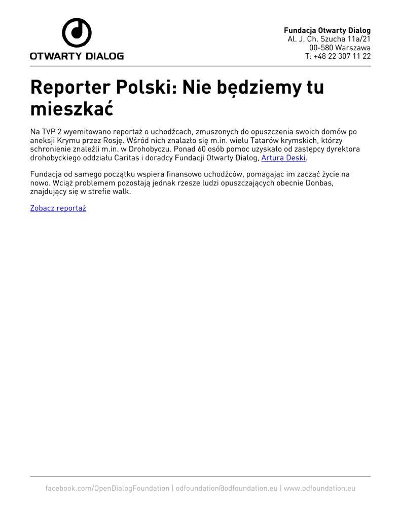 Fundacja Otwarty Dialog Al. J. Ch. Szucha 11a/21 00-580 Warszawa T: +48 22 307 11 22 Reporter Polski: Nie będziemy tu mieszkać Na TVP 2 wyemitowano reportaż o uchodźcach, zmuszonych do opuszczenia swoich domów po aneksji Krymu przez Rosję. Wśród nich znalazło się m.in. wielu Tatarów krymskich, którzy schronienie znaleźli m.in. w Drohobyczu. Ponad 60 osób pomoc uzyskało od zastępcy dyrektora drohobyckiego oddziału Caritas i doradcy Fundacji Otwarty Dialog, Artura Deski. Fundacja od samego początku wspiera finansowo uchodźców, pomagając im zacząć życie na nowo. Wciąż problemem pozostają jednak rzesze ludzi opuszczających obecnie Donbas, znajdujący się w strefie walk. Zobacz reportaż facebook.com/OpenDialogFoundation | [email protected] | www.odfoundation.eu
