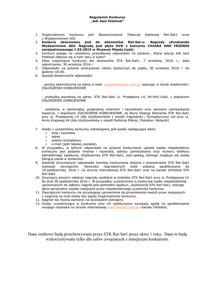 Regulamin Konkursu „Adi Jazz Festiwal” 1. 2. 3. 4. 5. 6. Organizatorem konkursu jest Stowarzyszenie Telewizji Kablowej Ret-Sat1 wraz z Wydawnictwem ADI. Konkurs skierowany jest do abonentów Ret-Sat-u. Nagrody ufundowało Wydawnictwo ADI. Nagrodą jest płyta DVD z koncertu CHIARA AND FRIENDS zarejestrowanego 1.03.2015 w Muzeum Miasta Łodzi. Konkurs polega na udzieleniu prawidłowej odpowiedzi na pytanie:, Która edycja Adi Jazz Festiwal odbywa się w tym roku w Łodzi? Data rozpoczęcia konkursu dla abonentów STK Ret-Sat1: 7 września, 2016 r.; data zakończenia: 30 września 2016 r. Odpowiedzi na pytania konkursowe należy dostarczyć do piątku 30 września 2016 r. do godziny 18:00. Sposób dostarczenia odpowiedzi: - pocztą elektroniczną na adres e-mail: [email protected], wpisując w tytule wiadomości: ZGŁOSZENIE KONKURSOWE - przesyłką pocztową na adres: STK Ret-Sat1 ul. Przełajowa 14, 94-044 Łódź, z dopiskiem ZGŁOSZENIE KONKURSOWE - osobiście, w zamkniętej, podpisanej imieniem i nazwiskiem oraz adresem zamieszkania kopercie, z dopiskiem ZGŁOSZENIE KONKURSOWE, do Biura Obsługi Abonenta STK Ret-Sat1 przy ul. Przełajowej 14 (dla Użytkowników z osiedli Zagrodniki i Sympatyczna) lub przy ul. Armii Krajowej 44 (dla Użytkowników z osiedli Retkinia Północ, Południe i Botanik) 7. 8. 9. 10. 11. 12. 13. Każdy z uczestników konkursu zobowiązany jest podać następujące dane: o imię i nazwisko o adres o telefon kontaktowy o e-mail (jeśli takowy posiada). W przypadku, w którym odpowiedzi na pytanie konkursowe udziela osoba niepełnoletnia konieczne jest podanie imienia i nazwiska, adresu zamieszkania oraz numeru telefonu pełnoletniego opiekuna, Użytkownika STK Ret-Sat1, pod opieką, którego znajduje się osoba biorąca udział w konkursie. Spośród otrzymanych odpowiedzi komisja konkursowa złożona z pracowników STK Ret-Sat1 wylosuje zwycięzców. Nazwiska nagrodzonych osób zostaną opublikowane do 10 października 2016 r. na stronie internetowej STK Ret-Sat1 oraz na kanale Infotekst STK Ret-Sat1. Zwycięzcy powinni odebrać nagrody osobiście w siedzibie STK Ret-Sat1 przy ul. Przełajowej 14 do dnia 30 października 2016 r. W przypadku uczestnictwa w konkursie osoby niepełnoletniej uprawnionym do odbioru nagród jest pełnoletni opiekun, Użytkownik STK Ret-Sat1, którego dane personalne zostały wskazane przez niepełnoletniego uczestnika konkursu. Zwycięzcom konkursu nie przysługuje uprawnienie do przeniesienia swoich praw związanych z wygraną na inne osoby bez zgody Organizatorów konkursu. Nagród nie można zamienić na ekwiwalent pieniężny Osoby uczestniczące w konkursie oraz ich opiekunowie wyrażają zgodę na opublikowanie swojego nazwiska na stronie internetowej www.retsat1.com.pl i kanale Infotekst. Dane osobowe będą przechowywane przez STK Ret-Sat1 przez okres 1 roku. Dane te będą wykorzystywane tylko dla celów związanych z niniejszym konkursem.